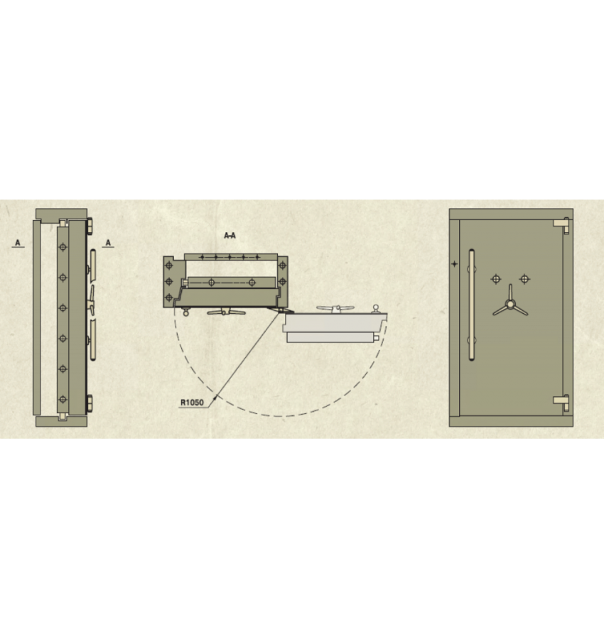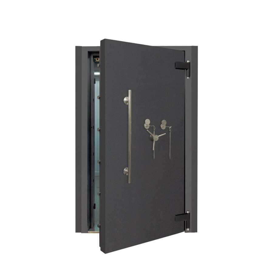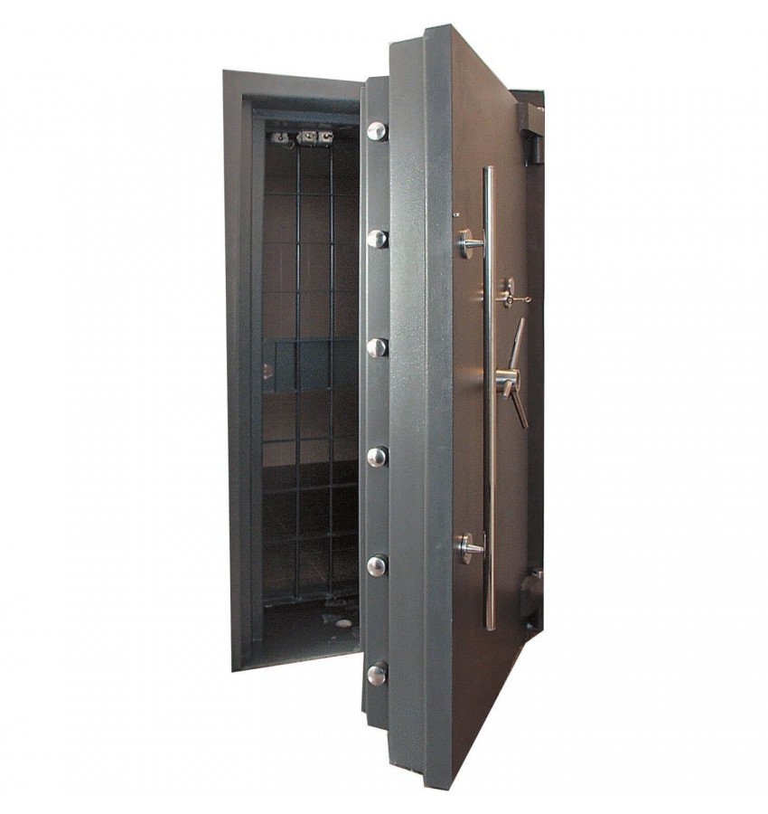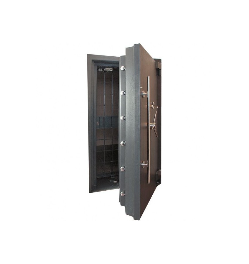 Дверь для банковского хранилища или в частном использовании. Соответствует защите от взлома по ГОСТ 2 класс. Обеспечивает защиту от несанкционированного доступа и взлома. В комплекте двери идет рама, решетка и дверное полотно, с запорным механизмом. Выполнена в темно-сером цвете. Установлены 2 ключевых замка STUV Германия, класс А. Возможно за доп.плату изменение замка с ключевого на электронный. Многосторонняя ригельная система запирания. Гарантия на конструкцию три года. Дверь изготавливается под заказ. Возможно изменение размеров двери+20% за один размер. Срок исполнения заказа три месяца, с момента внесения предоплаты.