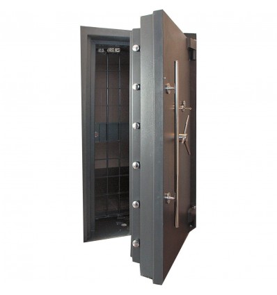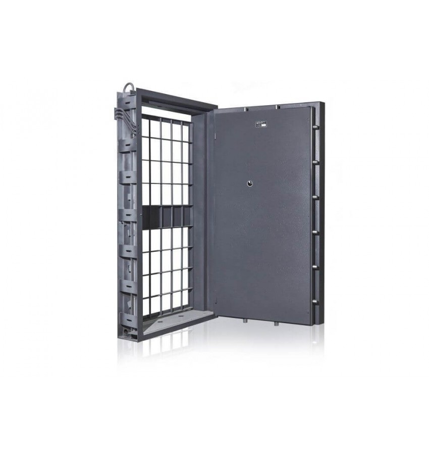 Дверь для банковского хранилища или в частном использовании. Соответствует защите от взлома по ГОСТ 2 класс. Обеспечивает защиту от несанкционированного доступа и взлома. В комплекте двери идет рама, решетка и дверное полотно, с запорным механизмом. Выполнена в темно-сером цвете. Установлены 2 ключевых замка STUV Германия, класс А. Возможно за доп.плату изменение замка с ключевого на электронный. Многосторонняя ригельная система запирания. Гарантия на конструкцию три года. Дверь изготавливается под заказ. Возможно изменение размеров двери+20% за один размер. Срок исполнения заказа три месяца, с момента внесения предоплаты.