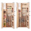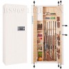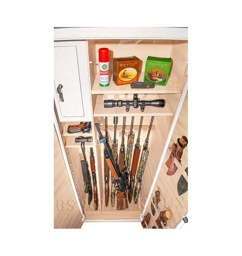 Полностью удовлетворяет требованиям МВД для физических и юридических лиц. Сейф имеет гигиенически безопасное износо- и коррозионно-устойчивое полимерно-порошковое покрытие на основе материалов производства Италии и Франции. Имеются покрытия различных цветов и структур: металлики, антики и д.р. Различные варианты цветового дизайна, например: корпус и двери имеют одинаковое покрытие, либо корпус и двери имеют покрытия разного цвета – выбирайте. Модель имеет полную внутреннюю мягкую отделку искусственной кожей. Полная внутренняя мягкая отделка защищает Ваше оружие от контакта с металлом, царапин, повреждений и т.п. Искусственная кожа имитирует кожу крокодилов, змей различных цветов! Замок Наружная дверь сейфа оборудована двумя замками: ключевым и высокоинтеллектуальным электронным кодовым. Сейф имеет систему аварийного открывания master-lock, которая позволит Вам открыть и перепрограммировать электронный замок Вашего сейфа, если забыт установленный Вами код и т.п. Индивидуальные мастер-ключи входят в комплект сейфа. Электронный замок сейфа имеет удобный дисплей с подсветкой. В режиме ожидания дисплей отображает текущий год, месяц, число, день недели и время. Также на дисплее отображается уровень заряда батарей. Предусмотрена функция просмотра статистики открываний сейфа с индикацией даты и времени открывания сейфа. Длина кодовых комбинаций электронного замка до 8 цифр. Два пользовательских кода - рабочий код и мастер-код. Оба кода программирует сам владелец. Сейф имеет мощную вертикальную и горизонтальную ригельную систему с запиранием по всем сторонам. Всего 8 мощных активных ригелей. Защита Сейф имеет мощную сигнализацию-сирену, которая срабатывает при ударе по сейфу. Этот режим охраны при желании включает сам владелец сейфа нажатием одной кнопки. При ударе по сейфу сигнализация работает в течении 1 минуты, затем опять встаёт в режим охраны. Кроме того, сигнализацию может выключить только владелец сейфа, просто набрав свой правильный код. Также сигнализация обязательно автоматически включается – если три раза неправильно набран код. Изготовлен из стали толщиной 3 и 4 мм. Петли – внутренние из стали 6мм. Двери сейфа имеют коробчатую конструкцию для дополнительного усиления. Внутреннее устройство Сейф имеет вертикальную перегородку, которая делит внутреннее пространство на две области – широкую и узкую. Внутри широкой области: 2 съёмные длинные полки с регулируемой высотой установки, деревянные ложементы на 6 стволов, съёмный регулируемый роликовый ложемент-зажим (производства Германии) для хранения в широкой области 7-го ствола либо для дополнительной фиксации оружия с оптикой. Внутри узкой области: четыре съёмные полки с регулируемой высотой установки, деревянные ложементы на 2 ствола а так же запираемое (патронное) отделение с съёмной полкой внутри. По желанию заказчика возможна поставка с дополнительными полками. Ружья можно хранить как в широком, так и в узком отделениях сейфа. На внутренней поверхности одной из дверей сейфа имеются три держателя для хранения ножей и пр. Установка Предусмотрена возможность крепления сейфа к стене. По желанию заказчика возможна поставка в исполнении, предусматривающем также крепление и к полу. Модификации Возможно изготовление модели с фасадом из стального листа толщиной 6