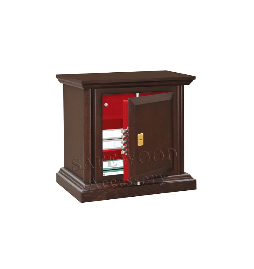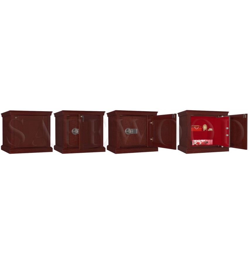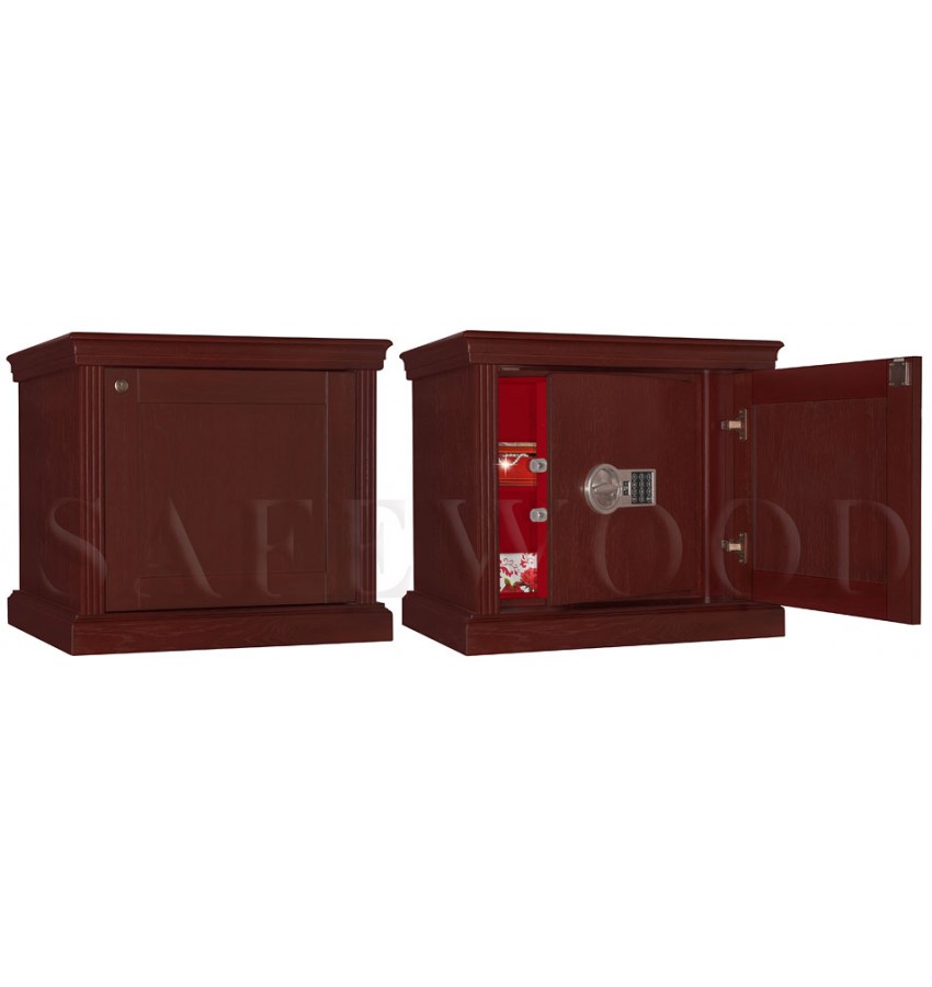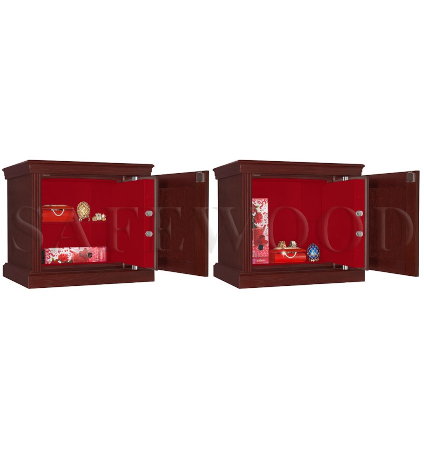 Скрытое исполнение. Сейф выполнен в виде мебельной тумбы. Имеет дополнительную наружную мебельную дверь, за которой скрыт непосредственно сам сейф. Элитный взломоогнестойкий сейф с отделкой натуральным деревом. Вся внутренняя поверхность сейфа имеет престижное мягкое покрытие флокированием бархатом. Сейф сертифицирован на устойчивость к взлому – 1 класс. Умеренная огнестойкость – приблизительно 20Б. Корпус имеет двойные стальные стенки, межстеночный наполнитель – бетон. Металлические детали сейфа имеют гигиенически-безопасное, коррозионно-стойкое полимерно-порошковое покрытие на основе материалов производства ЕС. В отличие от других сейфов с отделкой деревом, сейфы Safewood являются Взломоогнестойкими сейфами. Может использоваться как ювелирный сейф. Для хранения ювелирных изделий, украшений и ценностей сейф дополнительно комплектуется выдвижными или съёмными флокированными лотками. Замок Сейф оборудован электронным кодовым замком PS-300 либо высокосекретным электронным кодовым замком Mauer (Германия). Уточняйте при покупке. Такие замки Вы можете по Вашему выбору эксплуатировать в режиме одного пользовательского кода, либо в режиме двух кодов (мастер-код и рабочий код). Вы можете выбрать кодовую панель электронного замка – Хром либо Gold. Варианты кодовых панелей представлены на дополнительном фото. Стоимость сейфа и гарантия зависит от типа замка и кодовой панели. Цена приведена для случая поставки сейфа с замком PS-300 с кодовой панелью Хром. При поставке с замком PS-300 с кодовой панелью Gold доплата 17157 рублей. При поставке с замком Mauer (Германия) с кодовой панелью Хром доплата 11473 рублей. При поставке с замком Mauer (Германия) с кодовой панелью Gold доплата 23472 рублей. Кодовые панели Gold имеют покрытие золотом 24 карата. На кодовую панель Mauer Gold имеется европейский сертификат. При поставке сейфа с электронным кодовым замком замком PS-300 ( с любой кодовой панелью) - гарантия на сейф – 5 лет, гарантия на замок составляет 2 года. При поставке сейфа с электронным кодовым замком Mauer (Германия) ( с любой кодовой панелью) гарантия – 5 лет, как на замок, так и на сейф. Защита Сейф имеет усиленную коробчатую дверь, передний лист двери – сталь 10мм. Петли – внутренние. Имеется защита замка от высверливания твёрдосплавной пластиной. Мощная запирающая система с запиранием по всем сторонам. Вращающиеся ригели диаметром 25мм. Внутреннее устройство Внутри сейфа съёмная полка. Установка Предусмотрена возможность крепления сейфа к полу. Модификации Имеются различные варианты цвета деревянной отделки, а также возможность изготовления по образцу Вашей мебели. New! Для всех моделей сейфов SAFEWOOD теперь возможен новый дополнительный вариант наружной отделки: окрашенное дерево с патинированием. Возможны различные цвета окраски и патинирования. Некоторые примеры – на дополнительном фото. Возможно так же изготовление по образцу Вашей мебели. Имеются различные цвета внутренней отделки ( например на основном фото – флок бордо). Любой сейф Safewood или Armwood – по желанию заказчика может быть изготовлен в скрытом исполнении. Дополнительная информация Наружная дверь, по желанию заказчика, может иметь мебельный замок либо декоративную ручку. Cейфы SAFEWOOD могут быть изготовлены в комплекте с подставкой. Подставки могут быть выполнены в виде сейфа с отделкой деревом, либо мо