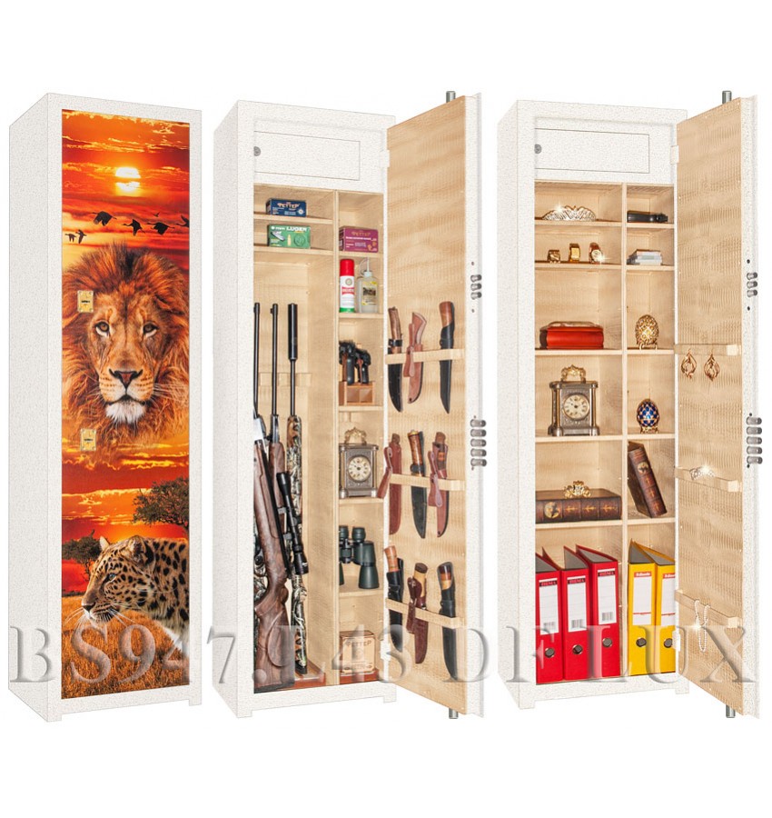 С рисунком на двери по специальной технологии. Возможны различные рисунки и фотографии, в т.ч. и по запросам заказчика. Универсальный сейф, может использоваться как оружейный сейф либо как личный (офисный) сейф. Полностью удовлетворяет требованиям МВД для физических и юридических лиц. Сейф имеет гигиенически безопасное износо- и коррозионно-устойчивое полимерное порошковое покрытие на основе материалов производства Италии и Франции. Имеются покрытия различных цветов и структур: металики, антики и д.р. Различные варианты цветового дизайна. Модель имеет полную внутреннюю мягкую отделку искусственной кожей. Полная внутренняя мягкая отделка защищает Ваше оружие от контакта с металлом, царапин, повреждений и т.п. Искусственная кожа (различных цветов и рисунков по нашему каталогу), в том числе имитирующая кожу крокодилов, змей и т.п. Замок Сейф оборудован двумя сертифицированными ключевыми замками: пятиригельный замок 4-го класса!!! повышенной секретности (1,5 миллиона комбинаций) и взломостойкости плюс трёхригельный замок 3 класса. Замки произведены совместно с Cisa (Италия). Также сейф оборудован вертикальной ригельной системой с запиранием по всем сторонам. Защита Изготовлен из стали толщиной 3 и 4 мм. Петли – внутренние из стали 6 мм. Двери сейфа имеет коробчатую конструкцию для дополнительного усиления. Внутреннее устройство Сейф имеет внутреннее запираемое (патронное) отделение и вертикальную перегородку, которая делит внутреннее пространства сейфа на две области. Внутри широкой области пять съёмных полок с регулируемой высотой установки, а также деревянные нижние и верхние фигурные ложементы на 4 ствола. Также в широкой области имеется роликовый ложемент-зажим (производства Германии) с регулируемой высотой установки. Этот ложемент может быть использован для хранения в широкой области пятого ствола либо для дополнительной боковой фиксации оружия с оптикой. Внутри узкой области пять съёмных полок с регулируемой высотой установки, а также деревянные нижние и верхние ложементы на 2 ствола. Все деревянные ложементы сейфа имеют отделку искусственной кожей различных цветов. По желанию заказчика возможна замена верхних деревянных ложементов на роликовые ложементы-зажимы производства Германии либо дополнительная комплектация сейфа такими ложементами. Ружья в сейфе можно хранить как в широкой, так и в узкой области. Сейф дополнительно может быть укомплектован пистолетными ложементами (деревянными либо пластиковыми). Внутренняя поверхность двери сейфа позволяет хранить на ней ножи, шомпола, связки ключей и т.п. Установка Предусмотрена возможность крепления сейфа к стене. По желанию заказчика возможна поставка в исполнении, предусматривающем также крепление и к полу. Модификации Высота хранимых стволов 1440 либо 1655мм., в зависимости от модификации - уточняйте это при заказе. Возможно изготовление модели с фасадом из стального листа толщиной 6мм, стоимость данной модификации выше на 20%. По желанию заказчика сейф дополнительно может быть оборудован опломбирующими устройствами. По желанию заказчика возможно изменение размеров, толщины металла, внутреннего устройства, типа и количества замков и т.п. Возможня полная внутренняя отделка флокированием бархатом (различных цветов), вместо отделки искусственной кожей. Имеются в 