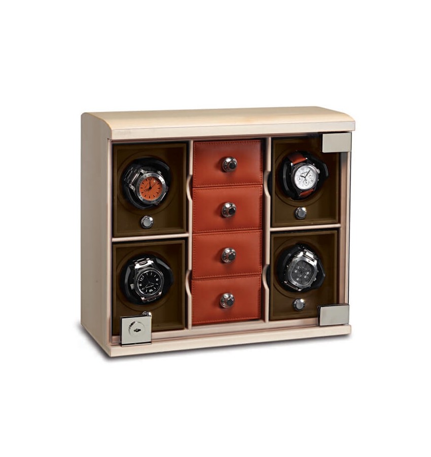 ОписаниеМодульная cистема подзавода для четырех часов с четырьмя отделениями для ювелирных изделий (механизм: производство Швейцария). Корпус деревянный из дерева редких пород. Модуль для подзавода наручных механических часов, в которых предусмотрена автоматическая система подзавода. Модуль обеспечивает непрерывный процесс подзавода часов при длительном отсутствии владельца, что позволяет сохранять установленные настройки календарей и всех предусмотренных функций часов. Это особенно важно для сложных механических часов с использованием вечных календарей. В некоторых случаях при остановке сложных часов требуется иногда не просто вмешательство часовщиков, но и отсылка их на фирму – изготовитель. Безусловно, данная проблема актуальна для людей, имеющих несколько часов "на все случаи жизни". Модули могут работать как от сети, так и от обычных батареек. В комплект входит также и транспортировочный футляр на одни часы, изготовленный из высококачественной кожи