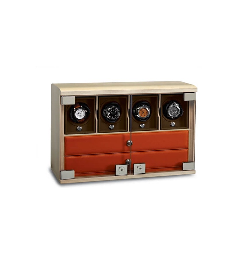 Бокс для хранения 6 часов, с автоматическим заводом модульного типа для 4-х часов и отделением для драгоценностей. Внешняя отделка-натуральная кожа):• Внутренняя отделка: материал - высокотехнологичный композитный материал; • Четыре независимых модуля. • Скорость вращения около 5 оборотов в минуту. • Уровень шума механизмов не более 5dB. Батарейки отключаются, когда модуль работает от сети. • 1 Программа, позволяющие достичь за сутки 90-100% резерва хода: • Программа - 30 минут час по часовой стрелке, 30 минут против часовой стрелки, "отдых" 3 часа. 1800 оборотов в сутки. • Индикатор "конца жизни" батареек. Включается, когда напряжение меньше 2,4V. • Индивидуальный серийный номер