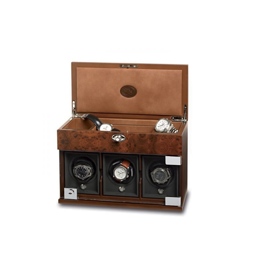 ОписаниеШкатулка для трех механических часов с автоподзаводом. Деревянный корпус отделан натуральным вересковым шпоном. Внутренняя отделка из износостойкой микрофибры, по тактильным ощущениям напоминает кожу очень тонкой выделки. В верхней части бокса отделение для хранения пары кварцевых часов и аксессуаров или драгоценностей, которое запирается на французский замок и высокопрочной латуни. Все три модуля имеют независимое энергопитание от батареек или общее от сети. Модули для подзавода выполнены из современного нескользящего композитного материала графитового цвета. В сердце модуля используется высокотехнологичный «двигатель» изготовленный швейцарской компанией Мaxon motor, которая по праву является мировым лидером в производстве подобных механизмов. Внутри каждого Мaxonа находится запатентованный во всем мире ротор "the System maxon®", не содержащий железа. Концепция этого вида механизма обладает множеством специфических технических преимуществ, которые в продукции компании Underwood выражаются в тихой (почти бесшумной) работе и высокоэффективном функционировании модуля для подзавода часов при низком потреблении энергии. Модули данной серии являются великолепным vip подарком и стали одними из самых популярных в России.