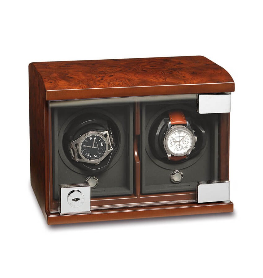 ОписаниеМодуль для подзавода 2 наручных механических часов, в которых предусмотрена автоматическая система подзавода. Модуль обеспечивает непрерывный процесс подзавода часов при длительном отсутствии владельца, что позволяет сохранять установленные настройки календарей и всех предусмотренных функций часов. Это особенно важно для сложных механических часов с использованием вечных календарей. В некоторых случаях при остановке сложных часов требуется иногда не просто вмешательство часовщиков, но и отсылка их на фирму – изготовитель. Безусловно, данная проблема актуальна для людей, имеющих несколько часов "на все случаи жизни". Модули могут работать как от сети, так и от обычных батареек. Материал: дерево ценных пород.