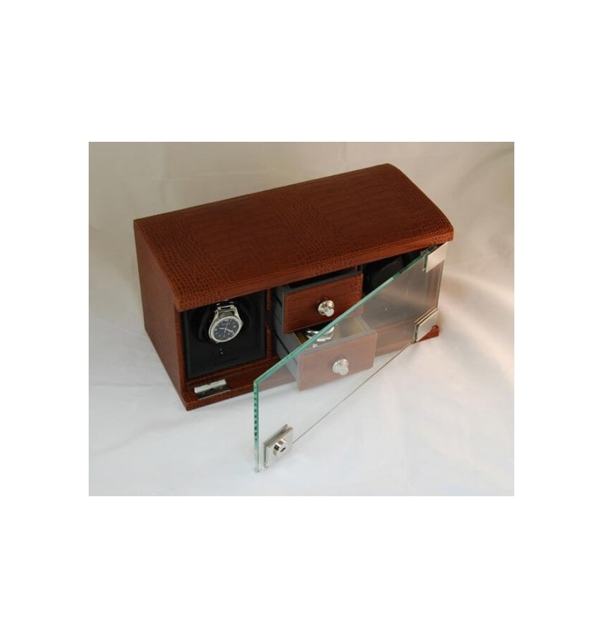 ОписаниеМодульная cистема подзавода для двух часов с двумя отделениями для ювелирных изделий(механизм: производство Швейцария). Корпус кожаный (производство: Италия). Модуль для подзавода наручных механических часов, в которых предусмотрена автоматическая система подзавода. Модуль обеспечивает непрерывный процесс подзавода часов при длительном отсутствии владельца, что позволяет сохранять установленные настройки календарей и всех предусмотренных функций часов. Это особенно важно для сложных механических часов с использованием вечных календарей. В некоторых случаях при остановке сложных часов требуется иногда не просто вмешательство часовщиков, но и отсылка их на фирму – изготовитель. Безусловно, данная проблема актуальна для людей, имеющих несколько часов "на все случаи жизни". Модули могут работать как от сети, так и от обычных батареек. В комплект входит также и транспортировочный футляр на одни часы, изготовленный из высококачественной кожи.