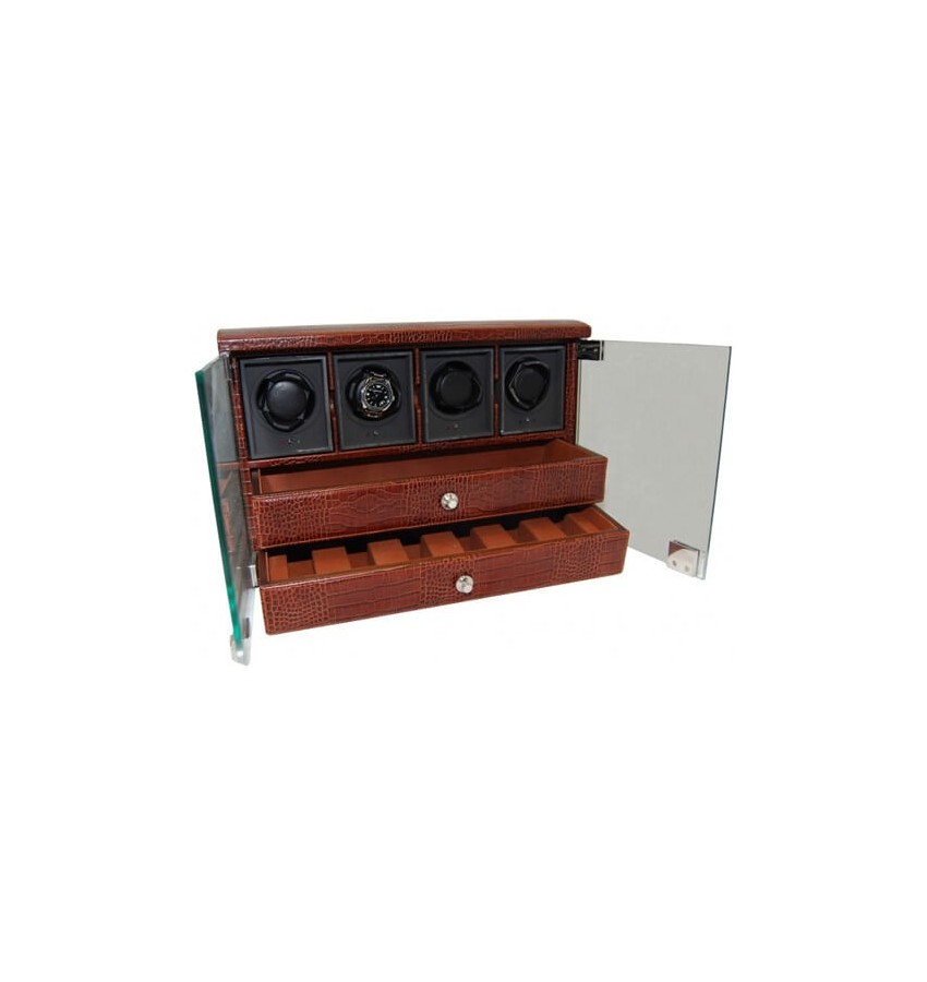 Бокс для хранения 6 часов, с автоматическим заводом модульного типа для 4-х часов и отделением для драгоценностей. Внешняя отделка-натуральная кожа):• Внутренняя отделка: материал - высокотехнологичный композитный материал; цвет - античный коричневый. • Четыре независимых модуля. • Скорость вращения около 5 оборотов в минуту. • Уровень шума механизмов не более 5dB. Батарейки отключаются, когда модуль работает от сети. • 1 Программа, позволяющие достичь за сутки 90-100% резерва хода: • Программа - 30 минут час по часовой стрелке, 30 минут против часовой стрелки, "отдых" 3 часа. 1800 оборотов в сутки. • Индикатор "конца жизни" батареек. Включается, когда напряжение меньше 2,4V. • Индивидуальный серийный номер