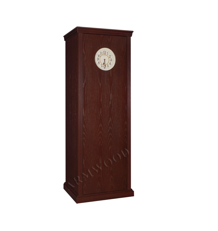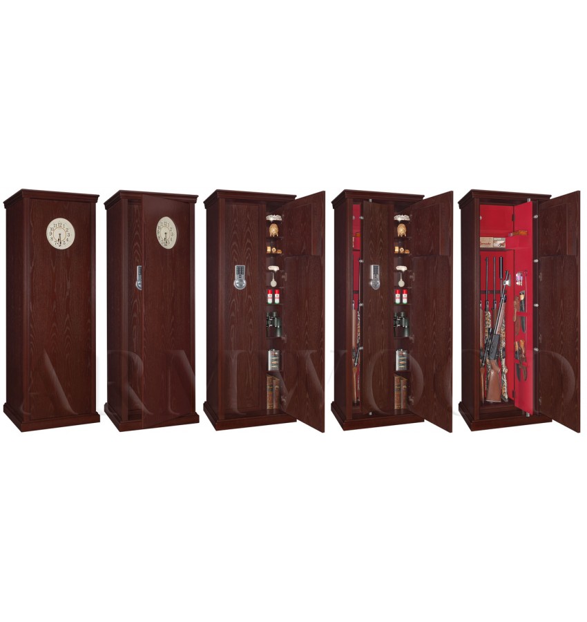 Сейф в скрытом исполнении с уникальным дизайном украсит любой интерьер. Сейф имеет дополнительную наружную мебельную дверь с настоящими работающими кварцевыми часами, за которой скрыт непосредственно сам сейф. Снаружи изделие выглядит как деревянный мебельный шкаф с часами (напольные часы). Сейф полностью удовлетворяет требованиям МВД к хранению оружия. Наружная отделка - натуральное дерево. Замок Сейф оборудован высокосекретным сертифицированным электронным кодовым замком MAUER (Германия). Этот замок Вы можете использовать с одним пользовательским кодом либо с двумя кодами: код руководителя (мастер-код) и рабочий код. Подробная и понятная инструкция на русском языке прилагается. Питание электронного замка от стандартной батарейки. Долгий срок службы батарейки. Простая смена разряженной батарейки. Сейф имеет мощную вертикальную и горизонтальную ригельную систему с запиранием по всем сторонам. Защита Дверь сейфа имеет коробчатую конструкцию для дополнительного усиления. Петли внутренние из стали 6мм. Усиленный корпус. Внутреннее устройство За наружной мебельной дверью с часами находится непосредственно сам сейф и восемь дополнительных съёмных мебельных полок, регулируемых по высоте. Внутри сейфа запираемое (патронное) отделение, съёмная полка и деревянные ложементы на пять стволов. Кроме того на одной из боковых стенок сейфа имеется съёмный роликовый ложемент-зажим (производства Германии) с регулируемой высотой установки, который используется для хранения шестого ствола либо для дополнительной фиксации оружия с оптикой. На внутренней поверхности двери сейфа имеются держатели для ножей и крючки для хранения шомполов, ключей и прочего. По желанию заказчика возможна поставка сейфа с дополнительным лотком на внутренней поверхности двери (как на фото). По желанию заказчика возможна поставка с дополнительными полками. Внутренняя отделка Сейфы ARMWOOD модификации FLOCK имеют престижную полную внутреннюю мягкую отделку флокированием бархатом (различных цветов по нашему каталогу), например на фото – флок бордо. Полная внутренняя мягкая отделка защищает Ваше оружие от контакта с металлом, царапин повреждений и т.п. Некоторые варианты флока представлены на дополнительном фото. Установка Предусмотрена возможность крепления сейфа к стене. По желанию заказчика возможна поставка в исполнении, предусматривающем также крепление к полу. Модификации В зависимости от типа внутренней отделки имеются четыре модификации этих оружейных сейфов. Модификация Primary(базовая) имеет деревянные ложементы отделанные кожей либо ложементы «премиум». Модификации Lux и Lux+ имеют дополнительно к базовой - мягкую полную внутреннюю отделку кожей. Различные варианты кожи по нашему каталогу. New! Поступила кожа, имитирующая кожу крокодилов, змей и т.п. Тоже различных цветов! Модификация Lux+ отличается от модификации Lux следующим: дополнительная отделка фасада внутреннего запираемого отделения деревом. Модификация Flock имеет полную внутреннюю отделку флокированием бархатом (различных цветов по нашему каталогу) и ложементы «премиум». На фотографиях в открытом виде представлен сейф в модификации Flock (в данном случае флок - бордо). Полная внутренняя мягкая отделка защищает Ваше оружие от контакта с металлом, царапин, повреждений и т.п. Металлические дета