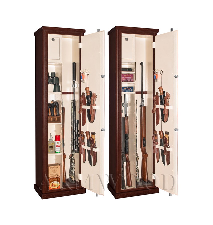 Элитный оружейный сейф с отделкой натуральным деревом. Сейфы полностью удовлетворяют требованиям МВД к хранению оружия. Замок Сейф оборудован высокосекретным сертифицированным электронным кодовым замком. Этот замок Вы можете использовать с одним пользовательским кодом либо с двумя кодами: код руководителя (мастер-код) и рабочий код. Подробная и понятная инструкция на русском языке прилагается. Питание электронного замка от стандартной батарейки. Долгий срок службы батарейки. Простая смена разряженной батарейки. Сейф может поставляться с электронными замками различных типов. Уточните у Вашего менеджера при заказе тип электронного замка и дизайн кодовой панели. Сейф имеет мощную вертикальную и горизонтальную ригельную систему с запиранием по всем сторонам. Защита Дверь сейфа имеет коробчатую конструкцию для дополнительного усиления. Петли внутренние из стали 6мм. Усиленный корпус. Внутреннее устройство Внутри сейфа вертикальная перегородка, которая делит внутреннее пространство сейфа на два отделения. Внутри правого отделения верхние и нижние деревянные ложементы на два ствола. Внутри левого отделения вертикальнорасположенное внутреннее запираемое (патронное) отделение. Ниже запираемого отделения находятся три съёмные полки с регулируемой высотой установки. Если устанавливать не все полки, то на их месте можно хранить третий и четвёртый ствол. Так же в комплект сейфа входит дополнительный роликовый ложемент, который легко устанавливается в любое нужное место сейфа (например этот ложемент можно использовать для более удобного хранения оружия с оптикой). На двери сейфа: два удобных держателя для ножей, а также крючки для шомполов, ключей и пр.. Установка Предусмотрена возможность крепления сейфа к стене. По желанию заказчика возможна поставка в исполнении, предусматривающем также крепление к полу. Модификации Для сейфов Armwood с внутренней отделкой Primary имеется возможность выбрать различные варианты полимерно-порошковых покрытий. Имеются покрытия различных цветов и структур. Некоторые варианты полимерно-порошковых покрытий представлены на дополнительном фото. По желанию заказчика возможно изменение размеров, конструкции, внутреннего устройства и т.п. Возможна замена верхних деревянных ложементов на ложементы других типов (роликовые ложементы-зажимы производства Германии, специальные ложементы для хранения оружия с крупной оптикой и т.п.). Металлические детали сейфа имеют гигиенически безопасное износо- и коррозионно-устойчивое полимерно-порошковое покрытие на основе материалов производства Италии или Франции. Имеются покрытия различных цветов и структур: металлики, антики и д.р. Дополнительная информация Имеются различные варианты отделки натуральным деревом сейфов серии Armwood (под различную мебель). Возможна поставка данного сейфа в исполнении универсальный сейф. В этом случае сейф поставляется с дополнительными полками и может использоваться не только как оружейный сейф, но и как личный и офисный сейф