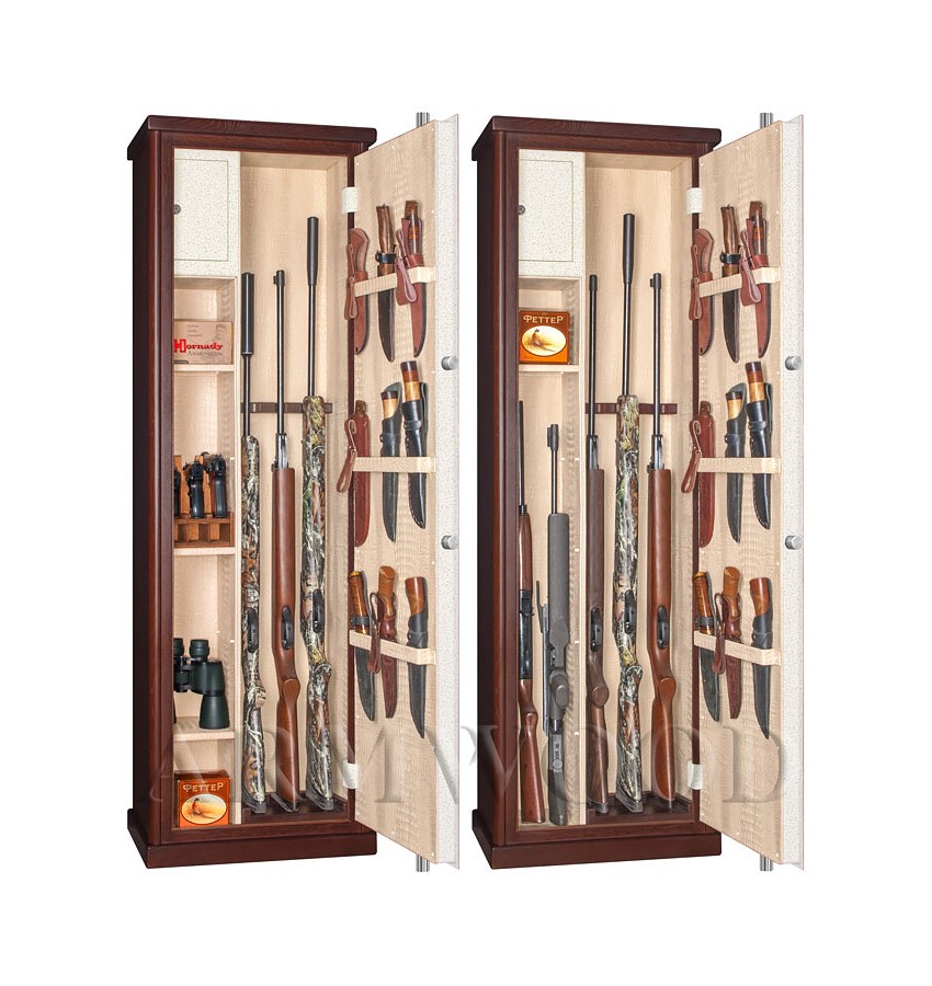 Элитный оружейный сейф с отделкой натуральным деревом. Сейфы полностью удовлетворяют требованиям МВД к хранению оружия. Имеются различные варианты отделки натуральным деревом сейфов серии Armwood (под различную мебель). Некоторые варианты представлены на дополнительном фото. Возможна поставка данного сейфа в исполнении универсальный сейф. В этом случае сейф поставляется с дополнительными полками и может использоваться не только как оружейный сейф, но и как личный и офисный сейф. Замок Сейф оборудован высокосекретным сертифицированным электронным кодовым замком. Этот замок Вы можете использовать с одним пользовательским кодом либо с двумя кодами: код руководителя (мастер-код) и рабочий код. Подробная и понятная инструкция на русском языке прилагается. Питание электронного замка от стандартной батарейки. Долгий срок службы батарейки. Простая смена разряженной батарейки. Сейф может поставляться с электронными замками различных типов. Уточните у Вашего менеджера при заказе тип электронного замка и дизайн кодовой панели. Сейф имеет мощную вертикальную и горизонтальную ригельную систему с запиранием по всем сторонам. Защита Дверь сейфа имеет коробчатую конструкцию для дополнительного усиления. Петли внутренние из стали 6мм. Усиленный корпус. Внутреннее устройство Внутри сейфа вертикальная перегородка, которая делит внутреннее пространство сейфа на два отделения. Внутри широкого отделения верхние и нижние деревянные ложементы на три ствола. Внутри узкого отделения вертикальнорасположенное внутреннее запираемое (патронное) отделение. Ниже запираемого отделения находятся три съёмные полки с регулируемой высотой установки. Если устанавливать не все полки, то на их месте можно хранить четвёртый и пятый ствол. По желанию заказчика возможна установка дополнительного роликового ложемента, который легко устанавливается в любое нужное место сейфа (например этот ложемент можно использовать для более удобного хранения оружия с оптикой). Согласуйте это с Вашим менеджером. На двери сейфа три удобных держателя для ножей. Сейфы ARMWOOD модификации LUX имеют полную внутреннюю мягкую отделку искусственной кожей (различных цветов и рисунков по нашему каталогу). NEW! Поступила искусственная кожа, имитирующая кожу крокодилов, змей и т.п. Тоже различных цветов! На основном фото пример сейфа с внутренней отделкой «бежевый крокодил». Полная внутренняя мягкая отделка защищает Ваше оружие от контакта с металлом, царапин повреждений и т.п. Некоторые варианты искусственной кожи представлены на дополнительном фото. Установка Предусмотрена возможность крепления сейфа к стене. По желанию заказчика возможна поставка в исполнении, предусматривающем также крепление к полу. Модификации В зависимости от типа внутренней отделки имеются три модификации этих оружейных сейфов. Модификация Primary(базовая) имеет деревянные ложементы отделанные винилискожей либо ложементы «премиум». Модификация Lux имеет дополнительно к базовой мягкую полную внутреннюю отделку винилискожей. Различные варианты винилискожи по нашему каталогу. Модификация Flock имеет полную внутреннюю отделку флокированием бархатом (различных цветов по нашему каталогу), и ложементы «премиум». Дополнительная информация Имеются различные варианты отделки натуральным деревом сейфов се