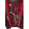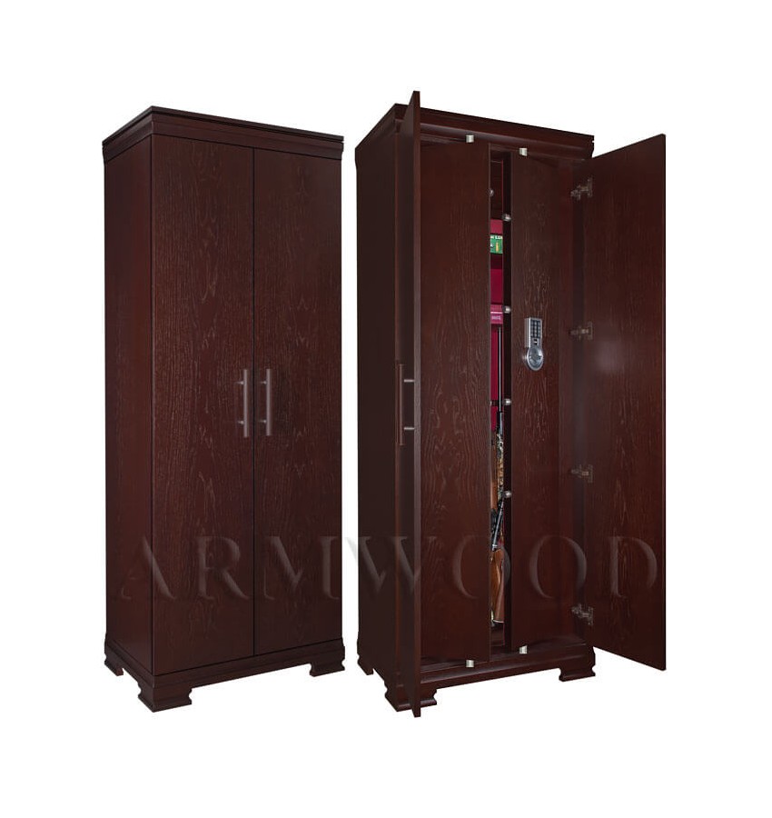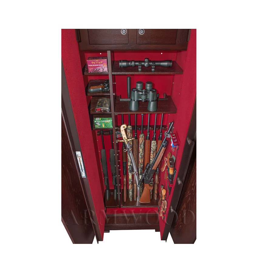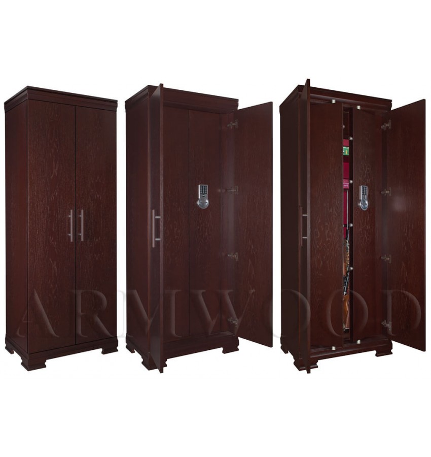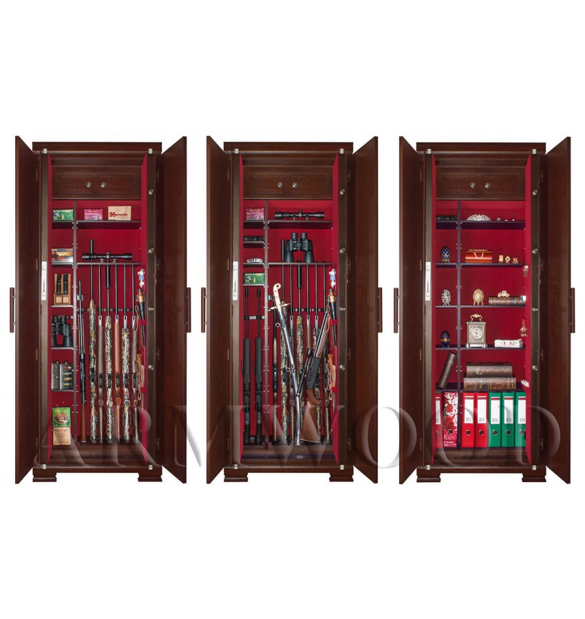 ОписаниеСейф в скрытом исполнении. Имеет две дополнительные наружные мебельные двери, за которыми скрыт непосредственно сам сейф. Снаружи изделие выглядит как деревянный мебельный шкаф. Сейфы полностью удовлетворяют требованиям МВД к хранению оружия. Наружная отделка - натуральное дерево (под различную мебель). Универсальный сейф, может использоваться как оружейный сейф либо как личный (офисный) сейф. Замок Сейф оборудован высокосекретным сертифицированным электронным кодовым замком MAUER (Германия). Этот замок Вы можете использовать с одним пользовательским кодом либо с двумя кодами: код руководителя (мастер-код) и рабочий код. Подробная и понятная инструкция на русском языке прилагается. Питание электронного замка от стандартной батарейки. Долгий срок службы батарейки. Простая смена разряженной батарейки. Сейф имеет мощную вертикальную и горизонтальную ригельную систему с запиранием по всем сторонам. . Защита Двери сейфа имеют коробчатую конструкцию для дополнительного усиления. Петли внутренние из стали 6мм. Усиленный корпус. Внутреннее устройство Внутри сейфа два запираемых (патронных) отделения и вертикальная перегородка которая делит внутреннее пространство сейфа на две области. Внутри «широкой» области 5 съёмных полок и деревянные ложементы на семь стволов. Также в «широкой» области имеются два боковых роликовых зажима с регулируемой высотой установки (для хранения в широкой области восьмого и девятого ствола либо для дополнительной фиксации оружия с оптикой). Внутри «узкой» области 5 съёмных полок и деревянные ложементы на два ствола. Все полки с регулируемой высотой установки. Все ложементы - съёмные. Ружья можно хранить как по одну сторону от перегородки, так и по обе стороны от перегородки. По желанию заказчика возможна поставка с дополнительными полками. На внутренней поверхности одной из дверей сейфа имеются удобные крючки и два держателя для хранения ножей и пр. Внутренняя отделка Сейфы ARMWOOD модификации FLOCK+ имеют престижную полную внутреннюю мягкую отделку флокированием бархатом (различных цветов по нашему каталогу), например на фото – флок бордо. Полная внутренняя мягкая отделка защищает Ваше оружие от контакта с металлом, царапин повреждений и т.п. Некоторые варианты флока представлены на дополнительном фото. В модификации FLOCK+ фасады внутренних запираемых отделений имеют отделку деревом. Внутренняя перегородка и полки также выполнены из дерева. Установка Предусмотрена возможность крепления сейфа к стене. По желанию заказчика возможна поставка в исполнении, предусматривающем также крепление к полу. Модификации В зависимости от типа внутренней отделки имеются пять модификаций этих оружейных сейфов. Модификация Primary (базовая) имеет деревянные ложементы, отделанные бархатом либо винилискожей либо ложементы «премиум». Модификации Lux и Lux+ имеют дополнительно к базовой - мягкую полную внутреннюю отделку винилискожей или бархатом. Различные варианты цвета бархата и винилискожи по нашему каталогу. Модификация Lux+ отличается от модификации Lux следующим: дополнительная отделка фасадов внутренних запираемых отделений деревом. Модификации Flock и Flock+ - имеют полную внутреннюю мягкую отделку флокированием бархатом (различных цветов по нашему каталогу) и ложементы «премиум». Модификация Flock+ отличае