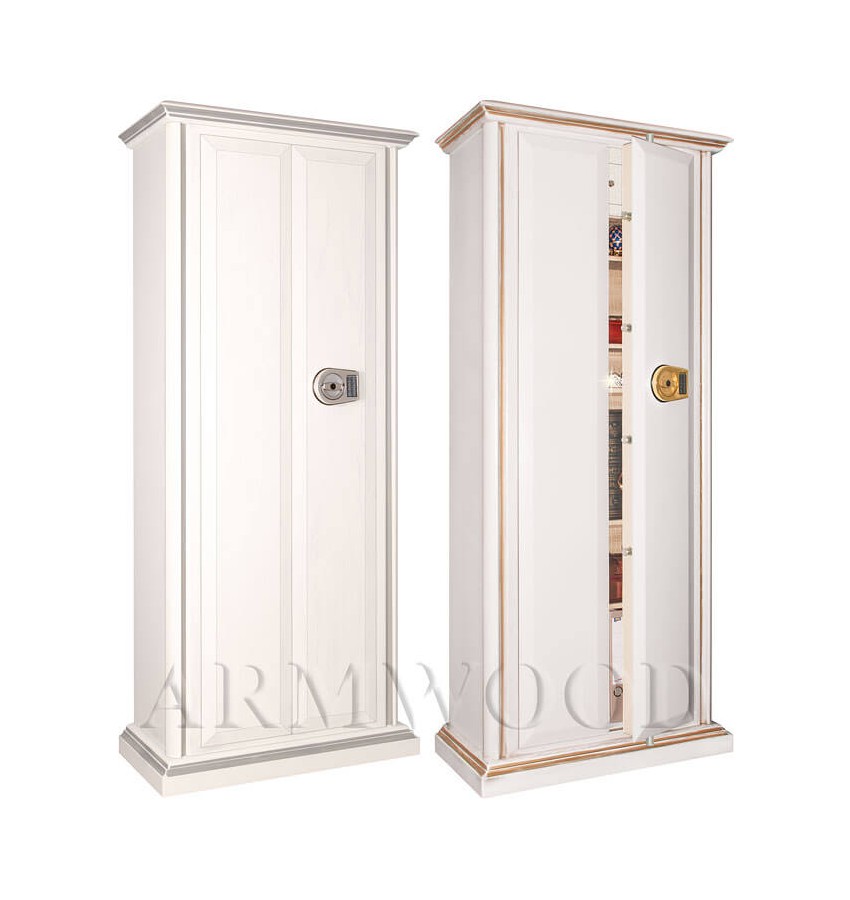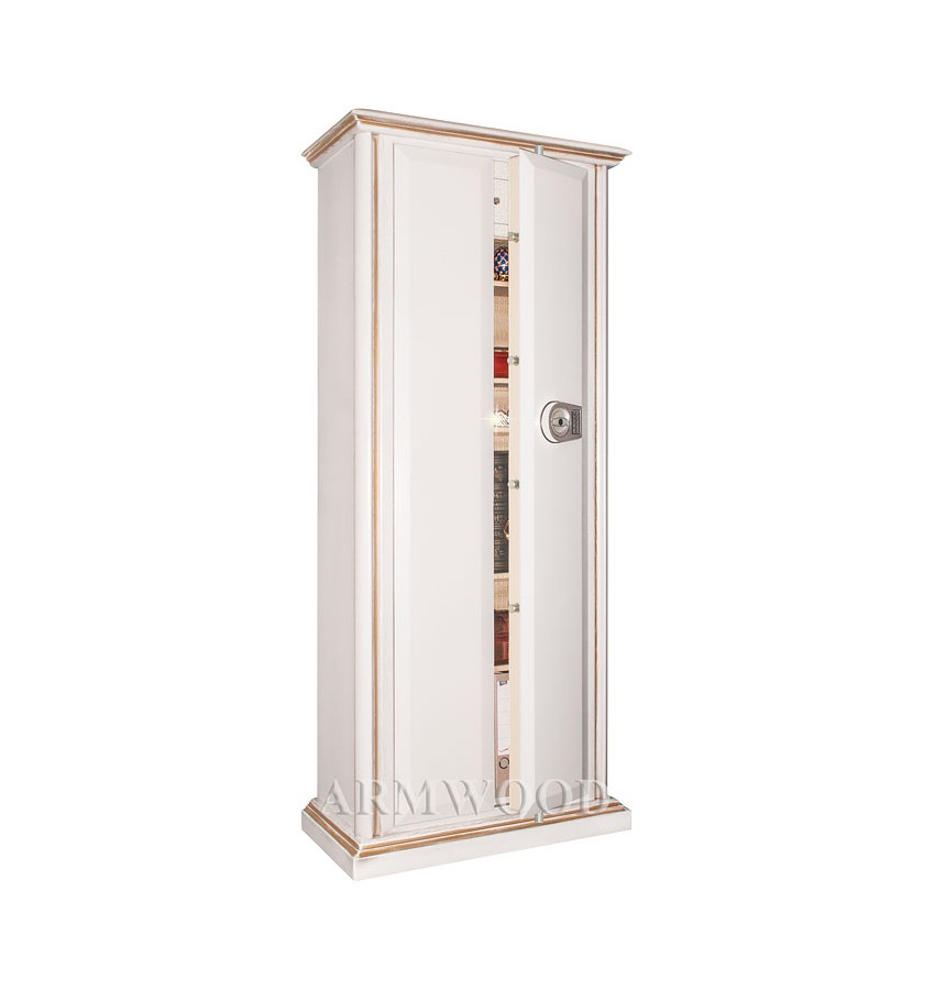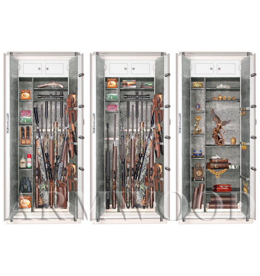 ОписаниеЭлитный оружейный сейф с отделкой натуральным деревом. Окрашенное дерево (по каталогу RAL) с патинированием. Сейфы полностью удовлетворяют требованиям МВД к хранению оружия. Универсальный сейф, может использоваться как оружейный сейф либо как личный (офисный) сейф. Замок Сейф оборудован высокосекретным сертифицированным электронным кодовым замком La Gard (США). Этот замок Вы можете использовать с одним пользовательским кодом либо с двумя кодами: код руководителя (мастер-код) и рабочий код. Подробная и понятная инструкция на русском языке прилагается. Питание электронного замка от стандартной батарейки. Долгий срок службы батарейки. Простая смена разряженной батарейки. Сейф имеет мощные ригельные системы (две вертикальные и горизонтальную) с запиранием по всем сторонам. Защита Двери сейфа имеют коробчатую конструкцию для дополнительного усиления. Петли внутренние из стали 6мм. Усиленный корпус. Внутреннее устройство Внутри сейфа два запираемых (патронных) отделения и вертикальная перегородка которая делит внутреннее пространство сейфа на две области. Внутри «широкой» области 5 съёмных полок и деревянные ложементы на семь стволов. Также в «широкой» области имеются два боковых роликовых зажима с регулируемой высотой установки (для хранения в широкой области восьмого и девятого ствола либо для дополнительной фиксации оружия с оптикой). Внутри «узкой» области 5 съёмных полок и деревянные ложементы на два ствола. Все полки с регулируемой высотой установки. Все ложементы - съёмные. Ружья можно хранить как по одну сторону от перегородки, так и по обе стороны от перегородки. По желанию заказчика возможна поставка с дополнительными полками. На внутренней поверхности одной из дверей сейфа имеются три держателя для хранения ножей и пр. Внутренняя отделка Сейфы ARMWOOD модификации Lux имеют полную внутреннюю мягкую отделку искусственной кожей (различных цветов и рисунков по нашему каталогу). NEW! Поступила искусственная кожа, имитирующая кожу крокодилов, змей и т.п. Тоже различных цветов! Полная внутренняя мягкая отделка защищает Ваше оружие от контакта с металлом, царапин повреждений и т.п. Установка Предусмотрена возможность крепления сейфа к стене. По желанию заказчика возможна поставка в исполнении, предусматривающем также крепление к полу. Модификации В зависимости от типа внутренней отделки имеются пять модификаций этих оружейных сейфов. Модификация Primary (базовая) имеет деревянные ложементы, отделанные бархатом либо винилискожей либо ложементы «премиум». Модификации Lux и Lux+ имеют дополнительно к базовой - мягкую полную внутреннюю отделку искусственной кожей. Модификация Lux+ отличается от модификации Lux следующим: дополнительная отделка фасадов внутренних запираемых отделений деревом. Модификации Flock и Flock+ - имеют полную внутреннюю мягкую отделку флокированием бархатом (различных цветов по нашему каталогу) и ложементы «премиум». Модификация Flock+ отличается от модификации Flock следующим: 1) дополнительная отделка фасадов внутренних запираемых отделений деревом, 2) перегородка и полки – деревянные (в модификации Flock – они металлические флокированные). Полная внутренняя мягкая отделка защищает Ваше оружие от контакта с металлом, царапин, повреждений и т.п. Металлические детали сейфа имеют гигиенически безопасное изно
