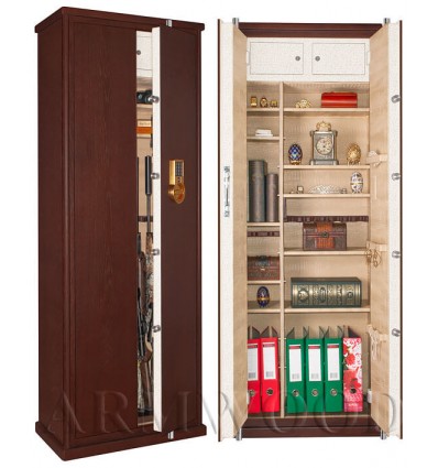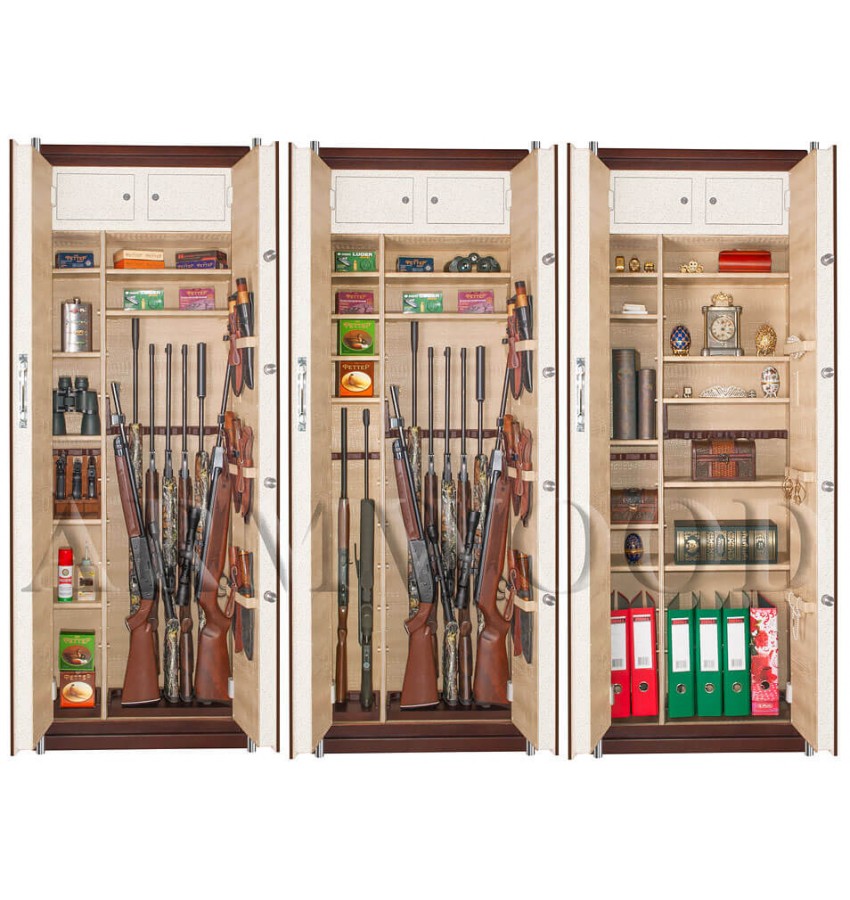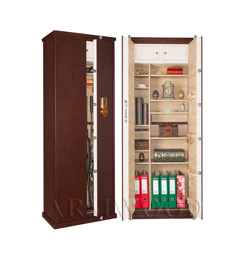 ОписаниеЭлитный оружейный сейф с отделкой натуральным деревом. Сейфы полностью удовлетворяют требованиям МВД к хранению оружия. Универсальный сейф, может использоваться как оружейный сейф либо как личный или офисный сейф. Замок Сейф оборудован высокосекретным сертифицированным электронным кодовым замком La Gard (США). Этот замок Вы можете использовать с одним пользовательским кодом либо с двумя кодами: код руководителя (мастер-код) и рабочий код. Подробная и понятная инструкция на русском языке прилагается. Питание электронного замка от стандартной батарейки. Долгий срок службы батарейки. Простая смена разряженной батарейки. Сейф имеет мощные ригельные системы (две вертикальные и горизонтальную) с запиранием по всем сторонам. Цена указана при поставке с замком La Gard (США) с любой кодовой панелью (Chrom либо Gold) или с замком Mauer (Германия) с кодовой панелью Chrom. При поставке с замком с замком Mauer (Германия) с кодовой панелью Gold (покрытие золотом 24 карата, подтвержденное европейским сертификатом) доплата 8420 руб. Защита Двери сейфа имеют коробчатую конструкцию для дополнительного усиления. Петли внутренние из стали 6мм. Усиленный корпус. Внутреннее устройство Внутри сейфа два запираемых (патронных) отделения и вертикальная перегородка которая делит внутреннее пространство сейфа на две области. Внутри «широкой» области 5 съёмных полок и деревянные ложементы на семь стволов. Также в «широкой» области имеются два съёмных боковых роликовых зажима с регулируемой высотой установки (для хранения в широкой области восьмого и девятого ствола либо для дополнительной фиксации оружия с оптикой). Внутри «узкой» области 5 съёмных полок и деревянные ложементы на два ствола. Все полки с регулируемой высотой установки. Ружья можно хранить как по одну сторону от перегородки, так и по обе стороны от перегородки. По желанию заказчика возможна поставка с дополнительными полками. На внутренней поверхности одной из дверей сейфа имеются три держателя для хранения ножей и пр. Внутренняя отделка Сейфы ARMWOOD модификации LUX имеют полную внутреннюю мягкую отделку искусственной кожей (различных цветов и рисунков по нашему каталогу). NEW! Поступила искусственная кожа, имитирующая кожу крокодилов, змей и т.п. Тоже различных цветов! Полная внутренняя мягкая отделка защищает Ваше оружие от контакта с металлом, царапин повреждений и т.п. Некоторые варианты искусственной кожи представлены на дополнительном фото. Установка Предусмотрена возможность крепления сейфа к стене. По желанию заказчика возможна поставка в исполнении, предусматривающем также крепление к полу. Модификации В зависимости от типа внутренней отделки имеются пять модификаций этих оружейных сейфов. Модификация Primary (базовая) имеет деревянные ложементы, отделанные бархатом либо винилискожей либо ложементы «премиум». Модификации Lux и Lux+ имеют дополнительно к базовой - мягкую полную внутреннюю отделку винилискожей. Различные варианты цвета винилискожи по нашему каталогу. Модификация Lux+ отличается от модификации Lux следующим: дополнительная отделка фасадов внутренних запираемых отделений деревом. Модификации Flock и Flock+ - имеют полную внутреннюю мягкую отделку флокированием бархатом (различных цветов по нашему каталогу) и ложементы «премиум». Модификация Flock+ отличается от модификации Flock след
