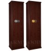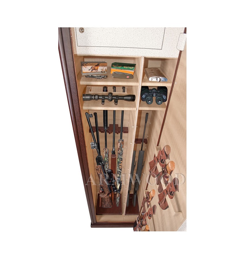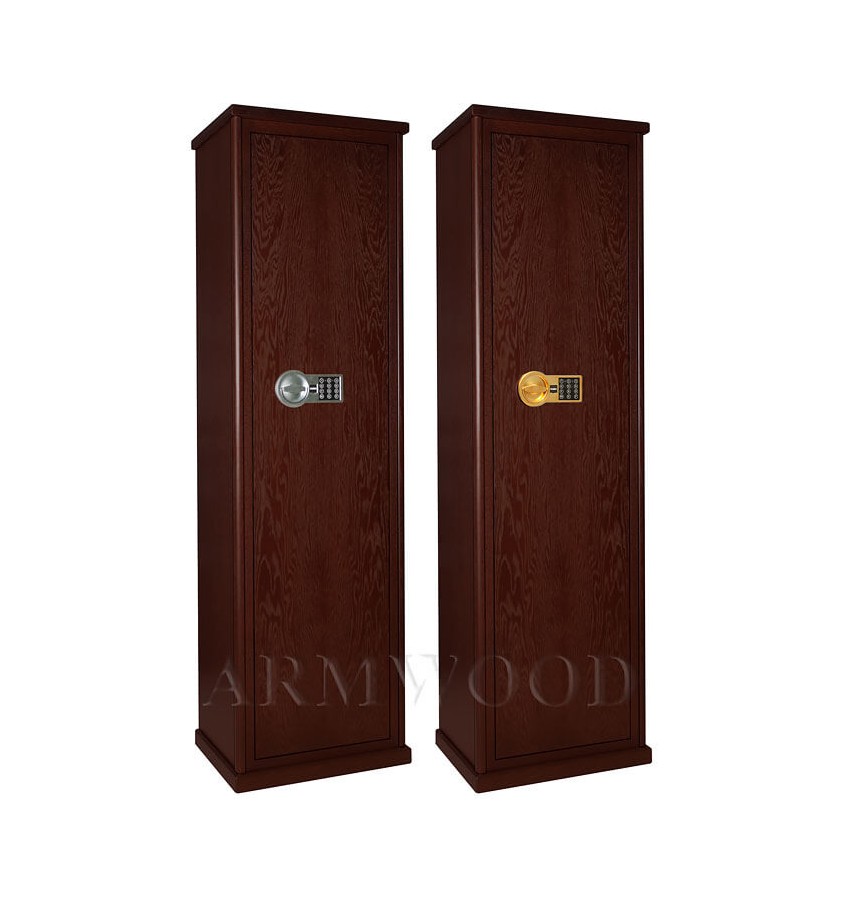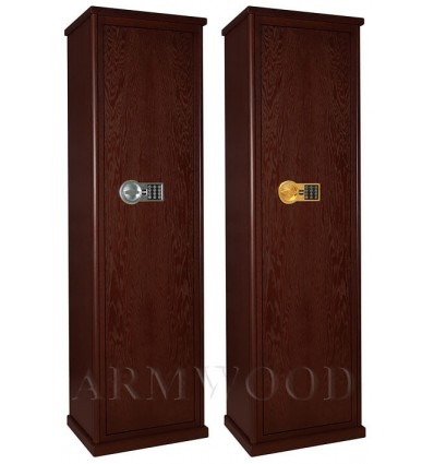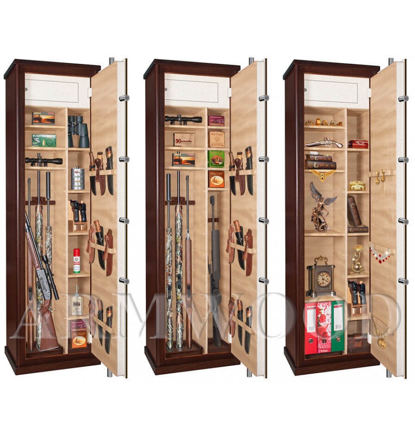 ОписаниеЭлитный оружейный сейф с отделкой натуральным деревом. Сейфы полностью удовлетворяют требованиям МВД к хранению оружия. Универсальный сейф, может использоваться как оружейный сейф либо как личный (офисный) сейф. Замок Сейф оборудован высокосекретным сертифицированным электронным кодовым замком Mauer (Германия). Этот замок Вы можете использовать с одним пользовательским кодом либо с двумя кодами: код руководителя (мастер-код) и рабочий код. Подробная и понятная инструкция на русском языке прилагается. Питание электронного замка от стандартной батарейки. Долгий срок службы батарейки. Простая смена разряженной батарейки. Сейф имеет мощную вертикальную и горизонтальную ригельную систему с запиранием по всем сторонам. Защита Дверь сейфа имеет коробчатую конструкцию для дополнительного усиления. Петли внутренние из стали 6мм. Усиленный корпус. Внутреннее устройство Внутри сейфа запираемое (патронное) отделение и вертикальная перегородка, которая делит внутреннее пространство сейфа на два отделения. Внутри широкого отделения пять съёмных полок и съёмные деревянные ложементы на четыре ствола. Также в широком отделении имеется съёмный боковой роликовый ложемент-зажим (производства Германии) с регулируемой высотой установки (для хранения в широком отделении 5-го ствола, либо для дополнительной фиксации оружия с оптикой). Внутри узкого отделения пять коротких съёмных полок и съёмные деревянные ложементы на два ствола. Все полки с регулируемой высотой установки. По желанию заказчика возможна поставка с дополнительными полками. На внутренней поверхности двери сейфа имеются крючки, а так же держатели для удобного хранения ножей. Ружья можно хранить как в широком, так и в узком отделениях сейфа. На внутренней поверхности одной из дверей сейфа имеются три держателя для хранения ножей и пр. Внутренняя отделка Сейфы ARMWOOD модификации LUX имеют полную внутреннюю мягкую отделку искусственной кожей (различных цветов и рисунков по нашему каталогу). NEW! Поступила искусственная кожа, имитирующая кожу крокодилов, змей и т.п. Тоже различных цветов! На основном фото пример сейфа с внутренней отделкой «бронзовый крокодил». Полная внутренняя мягкая отделка защищает Ваше оружие от контакта с металлом, царапин повреждений и т.п. Некоторые варианты искусственной кожи представлены на дополнительном фото. Установка Предусмотрена возможность крепления сейфа к стене. По желанию заказчика возможна поставка в исполнении, предусматривающем также крепление к полу. Модификации В зависимости от типа внутренней отделки имеются пять модификаций этих оружейных сейфов. Модификация Primary (базовая) имеет деревянные ложементы, отделанные бархатом либо винилискожей либо ложементы «премиум». Модификации Lux и Lux+ имеют дополнительно к базовой - мягкую полную внутреннюю отделку винилискожей или бархатом. Различные варианты цвета бархата и винилискожи по нашему каталогу. Модификация Lux+ отличается от модификации Lux следующим: дополнительная отделка фасадов внутренних запираемых отделений деревом. Модификации Flock и Flock+ - имеют полную внутреннюю мягкую отделку флокированием бархатом (различных цветов по нашему каталогу) и ложементы «премиум». Модификация Flock+ отличается от модификации Flock следующим: 1) дополнительная отделка фасадов внутренних запир