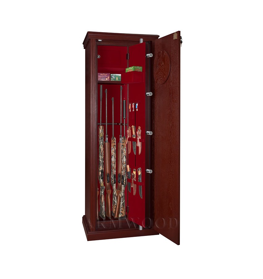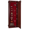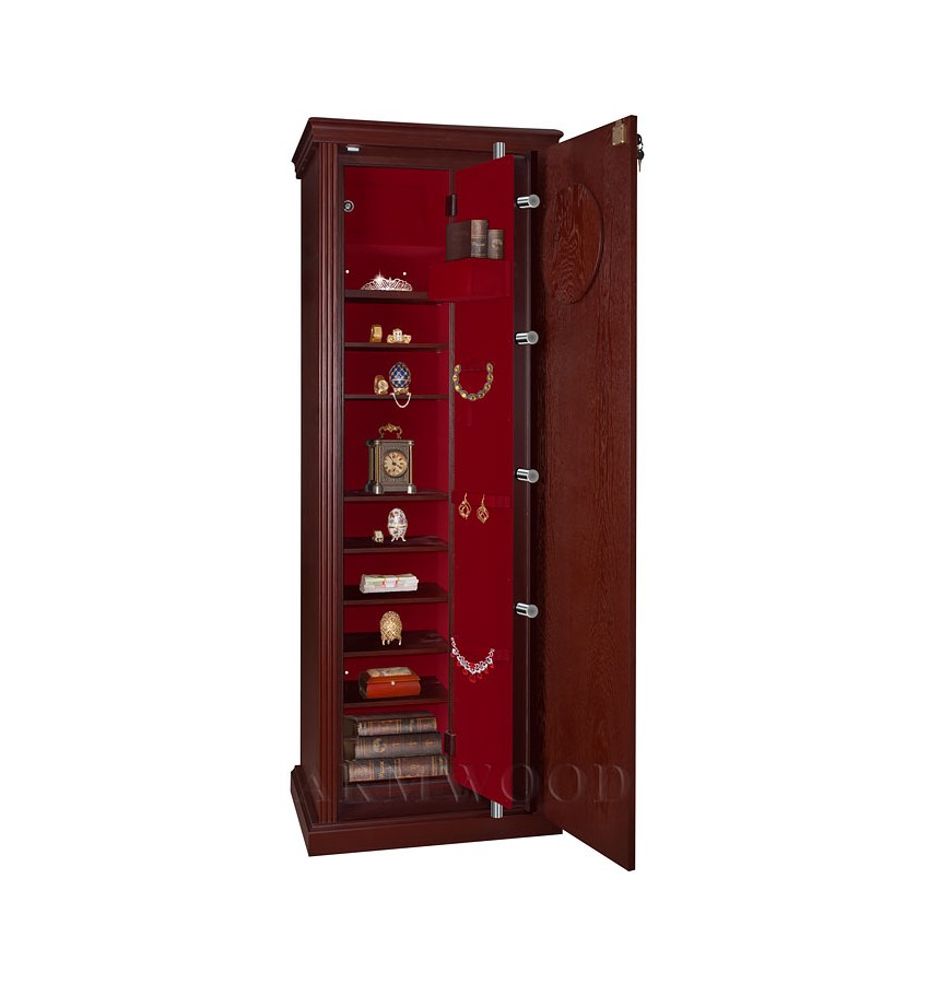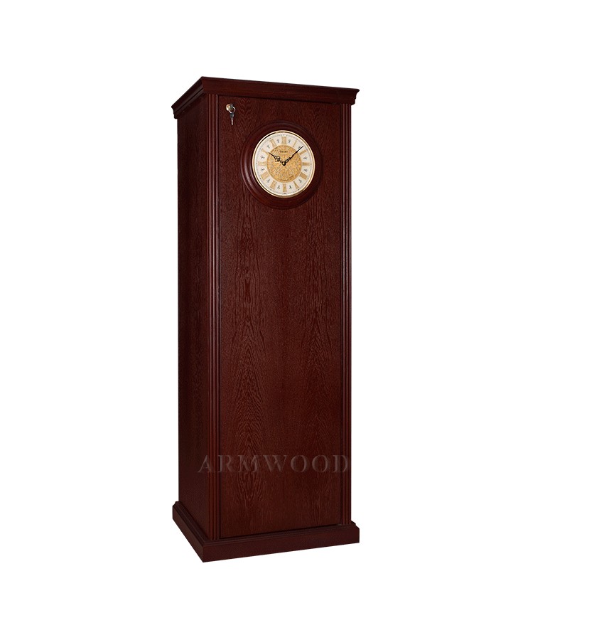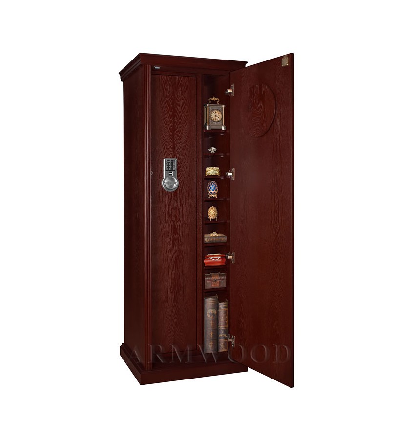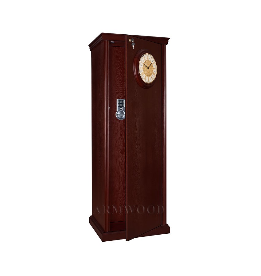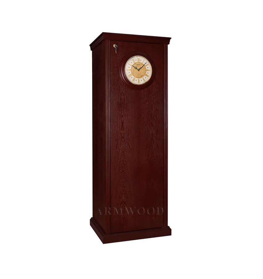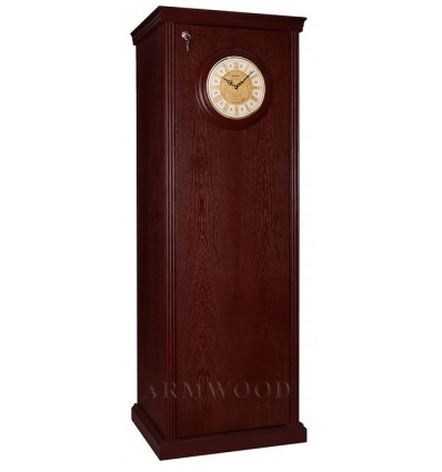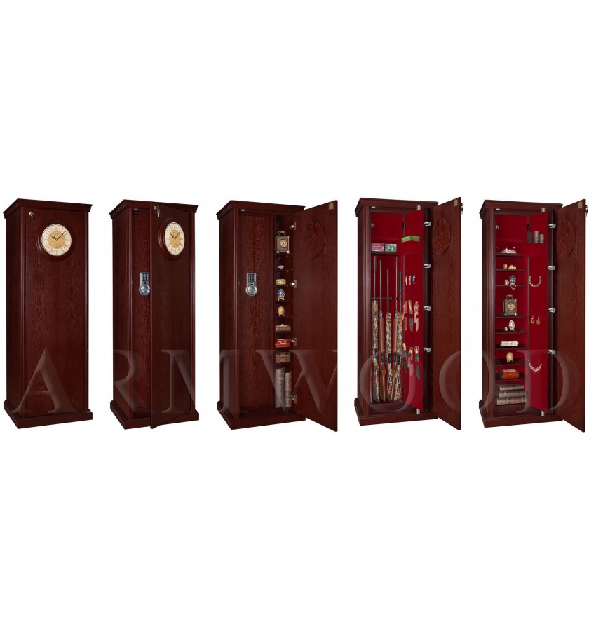 ОписаниеСейф в скрытом исполнении с уникальным дизайном украсит любой интерьер. Сейф имеет дополнительную наружную запираемую мебельную дверь с настоящими работающими кварцевыми часами Seiko (Япония), за которой скрыт непосредственно сам сейф. Использованы часы с возможностью проигрывания мелодий. Снаружи изделие выглядит как деревянный мебельный шкаф с часами (напольные часы). Сейф полностью удовлетворяет требованиям Росгвардии к хранению оружия. Наружная отделка - натуральное дерево. Универсальный сейф, может использоваться как оружейный сейф либо как личный, офисный сейф и т.п. Замок Сейф оборудован высокосекретным сертифицированным электронным кодовым замком MAUER (Германия). Этот замок Вы можете использовать с одним пользовательским кодом либо с двумя кодами: код руководителя (мастер-код) и рабочий код. Подробная и понятная инструкция на русском языке прилагается. Питание электронного замка от стандартной батарейки. Долгий срок службы батарейки. Простая смена разряженной батарейки. Сейф имеет мощную вертикальную и горизонтальную ригельную систему с запиранием по всем сторонам. Защита Дверь сейфа имеет коробчатую конструкцию для дополнительного усиления. Петли внутренние из стали 6мм. Усиленный корпус. Внутреннее устройство За наружной мебельной дверью (запирается собственным замком) с часами находится непосредственно сам сейф и восемь дополнительных съёмных мебельных полок, регулируемых по высоте. Внутри сейфа запираемое (патронное) отделение, 8 полок и деревянные ложементы. Полки и ложементы - съёмные и регулируемые по высоте. На внутренней поверхности двери сейфа имеются держатели для ножей и крючки для хранения шомполов, ключей и прочего, а так же лоток. По желанию заказчика возможна поставка с дополнительными полками. Внутренняя отделка Сейфы ARMWOOD модификации FLOCK имеют престижную полную внутреннюю мягкую отделку флокированием бархатом (различных цветов по нашему каталогу), например на фото – флок бордо. Полная внутренняя мягкая отделка защищает Ваше оружие от контакта с металлом, царапин повреждений и т.п. Некоторые варианты флока представлены на дополнительном фото. Установка Предусмотрена возможность крепления сейфа к стене. По желанию заказчика возможна поставка в исполнении, предусматривающем также крепление и к полу. Модификации В зависимости от типа внутренней отделки имеются четыре модификации этих оружейных сейфов. Модификация Primary(базовая) имеет деревянные ложементы отделанные кожей либо ложементы «премиум». Модификации Lux и Lux+ имеют дополнительно к базовой - мягкую полную внутреннюю отделку кожей. Различные варианты кожи по нашему каталогу. New! Поступила кожа, имитирующая кожу крокодилов, змей и т.п. Тоже различных цветов! Модификация Lux+ отличается от модификации Lux следующим: дополнительная отделка фасада внутреннего запираемого отделения деревом. Модификация Flock имеет полную внутреннюю отделку флокированием бархатом (различных цветов по нашему каталогу) и ложементы «премиум». На фотографиях в открытом виде представлен сейф в модификации Flock (в данном случае флок – бордо). Полная внутренняя мягкая отделка защищает Ваше оружие от контакта с металлом, царапин, повреждений и т.п. Металлические детали сейфа имеют гигиенически безопасное износо- и коррозионно-устойчивое полимерно-порошк