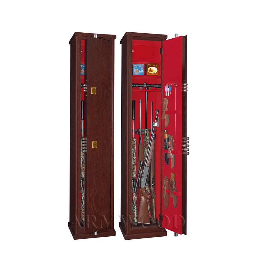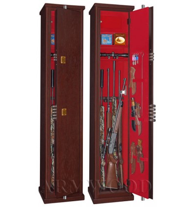 ОписаниеЭлитный оружейный сейф с отделкой натуральным деревом. Сейфы полностью удовлетворяют требованиям МВД к хранению оружия. Замок Сейф оборудован двумя сертифицированными ключевыми замками: замок 4-го класса!!! повышенной взломостойкости и секретности (1,5 миллиона комбинаций) плюс замок 3 класса. Замки разработаны совместно с Cisa (Италия). По желанию заказчика возможна поставка сейфов с замками производства Германии: Mauer или Wittkopp. Сейф имеет мощную вертикальную и горизонтальную ригельную систему с запиранием по всем сторонам. Защита Дверь сейфа имеет коробчатую конструкцию для дополнительного усиления. Петли внутренние из стали 6мм. Усиленный корпус. Внутреннее устройство Внутри сейфа запираемое (патронное) отделение, две съёмные полки и деревянные ложементы на пять стволов. Кроме того на одной из боковых стенок сейфа имеется съёмный роликовый ложемент-зажим (производства Германии) с регулируемой высотой установки, который используется для хранения шестого ствола либо для дополнительной фиксации оружия с оптикой. На внутренней поверхности двери сейфа имеются держатели для ножей и крючки для хранения шомполов, ключей и прочего. По желанию заказчика возможна поставка сейфа с дополнительным лотком на внутренней поверхности двери. По желанию заказчика возможна поставка с дополнительными полками. Внутренняя отделка Сейфы ARMWOOD модификации FLOCK имеют престижную полную внутреннюю мягкую отделку флокированием бархатом (различных цветов по нашему каталогу), например на фото – флок бордо. Полная внутренняя мягкая отделка защищает Ваше оружие от контакта с металлом, царапин повреждений и т.п. Некоторые варианты флока представлены на дополнительном фото. Установка Предусмотрена возможность крепления сейфа к стене. По желанию заказчика возможна поставка в исполнении, предусматривающем также крепление к полу. Модификации В зависимости от типа внутренней отделки имеются четыре модификации этих оружейных сейфов. Модификация Primary(базовая) имеет деревянные ложементы отделанные бархатом либо винилискожей либо ложементы «премиум». Модификации Lux и Lux+ имеют дополнительно к базовой - мягкую полную внутреннюю отделку винилискожей или бархатом. Различные варианты цвета бархата и винилискожи по нашему каталогу. New! Поступила винилискожа, имитирующая кожу крокодилов, змей и т.п. Тоже различных цветов! Модификация Lux+ отличается от модификации Lux следующим: дополнительная отделка фасада внутреннего запираемого отделения деревом. Модификация Flock имеет полную внутреннюю отделку флокированием бархатом (различных цветов по нашему каталогу) и ложементы «премиум». На фотографиях в открытом виде представлены сейфы в модификации Flock (в данном случае флок - бордо). Полная внутренняя мягкая отделка защищает Ваше оружие от контакта с металлом, царапин, повреждений и т.п. Металлические детали сейфа имеют гигиенически безопасное износо- и коррозионно-устойчивое полимерно-порошковое покрытие на основе материалов производства Италии или Франции. Имеются покрытия различных цветов и структур: металлики, антики и д.р. По желанию заказчика возможно изменение размеров, конструкции, внутреннего устройства и т.п. Возможна замена верхних деревянных ложементов на ложементы других типов (роликовые ложементы-зажимы производства Германии, специаль