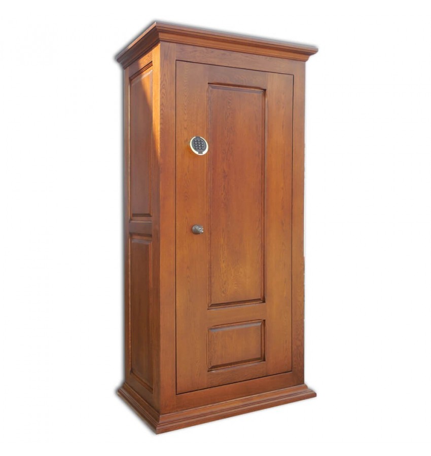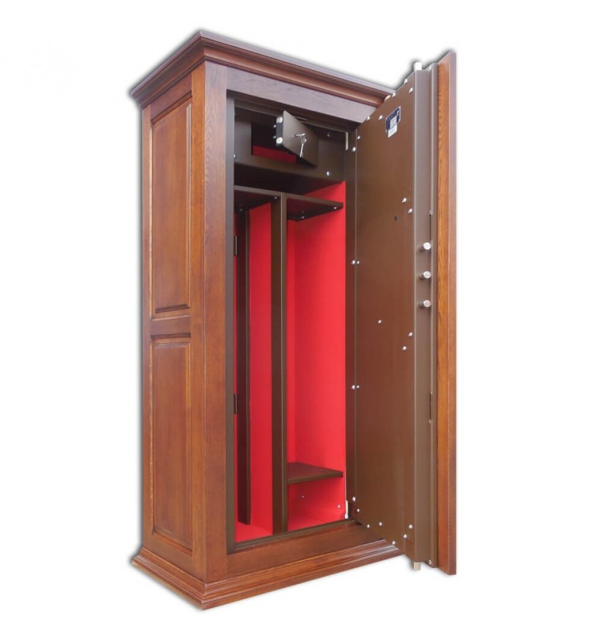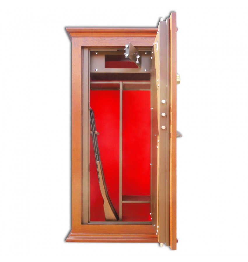 ОписаниеЗамок Сейф оборудован высокосекретным сертифицированным электронным кодовым замком. Этот замок Вы можете использовать с одним пользовательским кодом либо с двумя кодами: код руководителя (мастер-код) и рабочий код. Подробная и понятная инструкция на русском языке прилагается. Питание электронного замка от стандартной батарейки. Долгий срок службы батарейки. Простая смена разряженной батарейки. Сейф может поставляться с электронными замками различных типов, в том числе Mauer (Германия) и La Gard (США). Сейф имеет мощную вертикальную и горизонтальную ригельную систему с запиранием по всем сторонам. Защита Двери сейфа имеют коробчатую конструкцию для дополнительного усиления. Петли внутренние из стали 6мм. Усиленный корпус. Внутреннее устройство Сейф имеет вертикальную перегородку, которая делит внутреннее пространство на две области – широкую и узкую. Внутри широкой области: 2 съёмные длинные полки с регулируемой высотой установки, деревянные ложементы на 7 стволов, съёмный регулируемый роликовый ложемент-зажим (производства Германии) для хранения в широкой области 8-го ствола либо для дополнительной фиксации оружия с оптикой. Внутри узкой области: четыре съёмные полки с регулируемой высотой установки, деревянные ложементы на 2 ствола а так же запираемое (патронное) отделение с съёмной полкой внутри. По желанию заказчика возможна поставка с дополнительными полками. Ружья можно хранить как в широком, так и в узком отделениях сейфа. На внутренней поверхности одной из дверей сейфа имеются три держателя для хранения ножей и пр. Внутренняя отделка Сейфы ARMWOOD модификации LUX имеют полную внутреннюю мягкую отделку искусственной кожей (различных цветов и рисунков по нашему каталогу). NEW! Поступила искусственная кожа, имитирующая кожу крокодилов, змей и т.п. Тоже различных цветов! На основном фото пример сейфа с внутренней отделкой «бежевый крокодил». Полная внутренняя мягкая отделка защищает Ваше оружие от контакта с металлом, царапин повреждений и т.п. Некоторые варианты искусственной кожи представлены на дополнительном фото. Установка Предусмотрена возможность крепления сейфа к стене. По желанию заказчика возможна поставка в исполнении, предусматривающем также крепление к полу. Модификации В зависимости от типа внутренней отделки имеются три модификации этих оружейных сейфов. Модификация Primary (базовая) имеет деревянные ложементы «премиум». Модификация Lux имеет дополнительно к базовой - мягкую полную внутреннюю отделку искусственной кожей. Различные варианты цветаи структуры искусственной кожи по нашему каталогу. New! Поступила винилискожа, имитирующая кожу крокодилов, змей и т.п. Тоже различных цветов! Модификация Flock - имеет полную внутреннюю мягкую отделку флокированием бархатом (различных цветов по нашему каталогу) и ложементы «премиум». Полная внутренняя мягкая отделка защищает Ваше оружие от контакта с металлом, царапин, повреждений и т.п. По желанию заказчика возможно изменение размеров, конструкции, внутреннего устройства и т.п. Возможна замена верхних деревянных ложементов на ложементы других типов (роликовые ложементы-зажимы производства Германии, специальные ложементы для хранения оружия с крупной оптикой и т.п.). Возможна поставка этих сейфов с различными электронными замками и с различными типами ко
