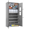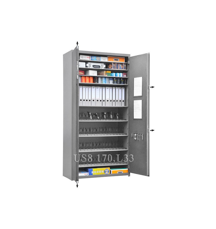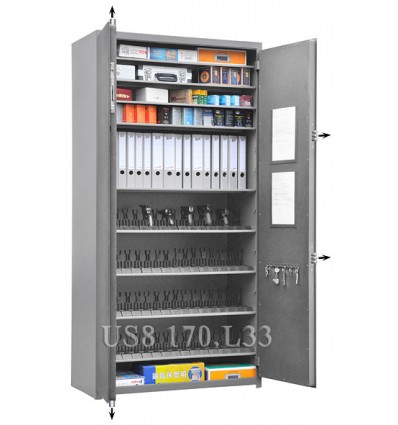 Двухстворчатый сейф. Предназначен для хранения большого количества пистолетов, боеприпасов, кроме того может использоваться как личный, офисный, бухгалтерский сейф. Полностью удовлетворяет требованиям МВД для юридических и физических лиц. Сейф имеет гигиенически безопасное износо- и коррозионно-устойчивое полимерно-порошковое покрытие на основе материалов производства Италии и Франции. Имеются покрытия различных цветов и структур: металлики, антики и д.р. Различные варианты цветового дизайна, например: корпус и двери имеют одинаковое покрытие, либо корпус и двери имеют покрытия разного цвета – выбирайте. Замок В модификации .L33 наружная дверь сейфа оборудована двумя сертифицированными трехригельными сувальдными ключевыми замками второго класса. Сейф имеет вертикальную ригельную систему. Сейф оборудован опломбирующим устройством. Возможна установка дополнительных опломбирующих устройств либо опломбирующих устройств других типов. Защита Изготовлен из стали толщиной 3мм. Дверь усиленная коробчатая. Петли внутренние из стали 6 мм., усиленный корпус. Внутреннее устройство Базовая модель имеет 9 съемных полок с регулируемой высотой установки, но по желанию заказчика сейф может быть изготовлен с дополнительными внутренними запираемыми отделениями. На внутренней стороне двери сейфа имеются две рамки под списки личного состава (либо опись) и крючки для хранения ключей и т.п. Установка Предусмотрена возможность крепления сейфа к стене (уточнять при заказе). Возможно изготовление в варианте предусматривающем также крепление к полу. Модификации По желанию заказчика сейф дополнительно может комплектоваться пистолетными ложементами (пластиковыми либо деревянными) и колодками под патроны. При покупке вместе с сейфом на данные товары действует специальная скидка. Возможно изменение габаритов, конструкции и внутреннего устройства изделий, а также изготовление несерийных изделий. Возможна поставка сейфов этой серии с установленным датчиком охранной системы для дальнейшего подключения сирен, ревунов, оповещателей и других охранных систем. Имеются различные цвета.