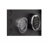 Клавиатура электронного замка выступает относительно корпуса на 39 мм. Полукруглая ручка в сложенном состоянии выступает на 42 мм. Глубина сейфа приведена без учёта размеров замка и ручки.