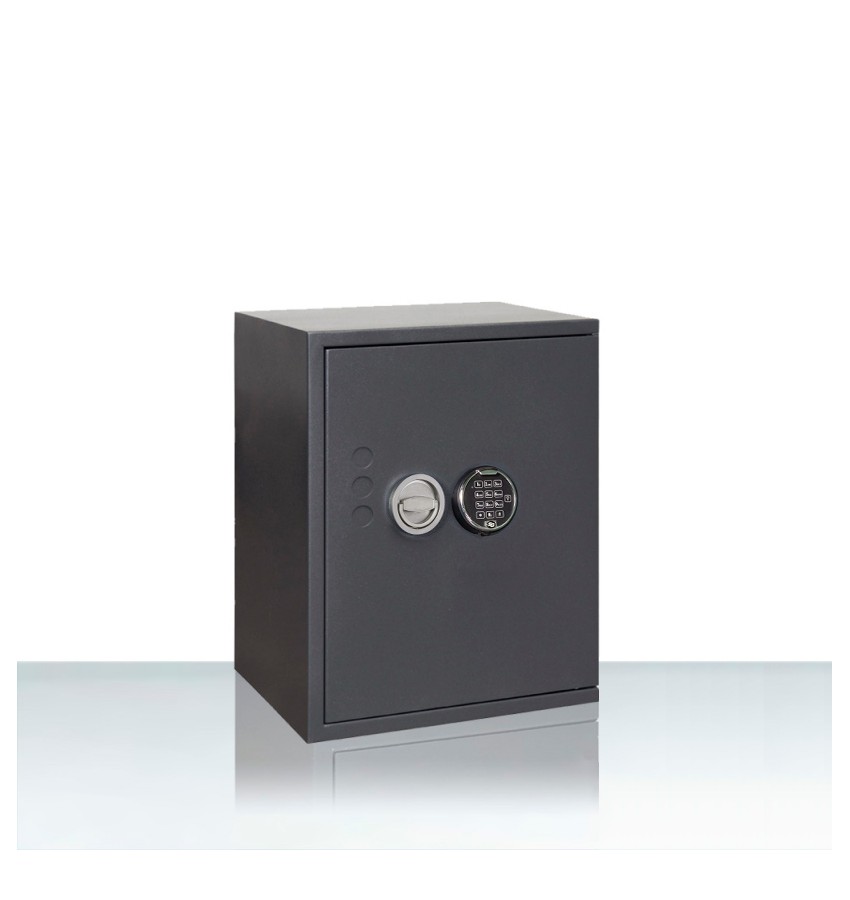 Клавиатура электронного замка выступает относительно корпуса на 39 мм. Полукруглая ручка в сложенном состоянии выступает на 12 мм. Глубина сейфа приведена без учёта размеров замка и ручки.