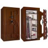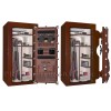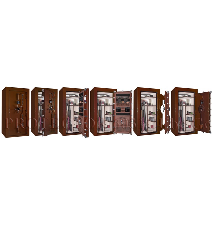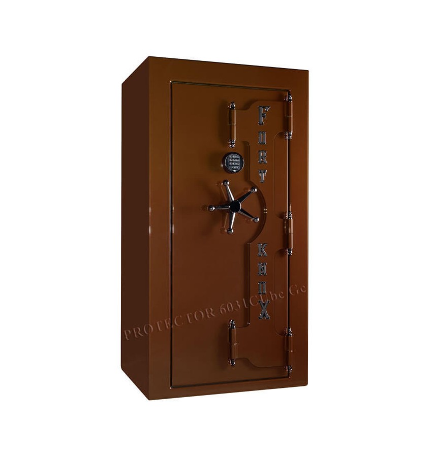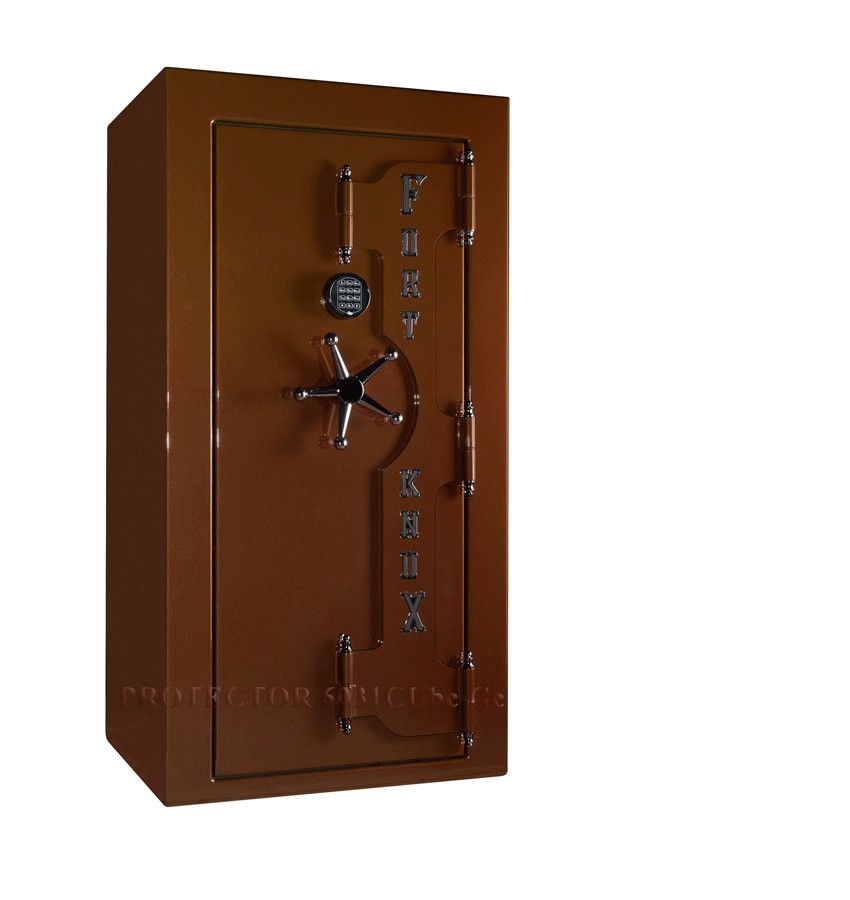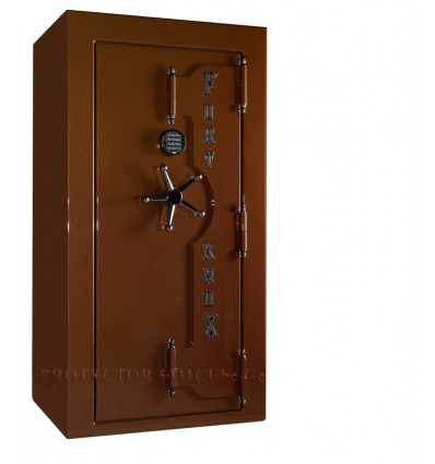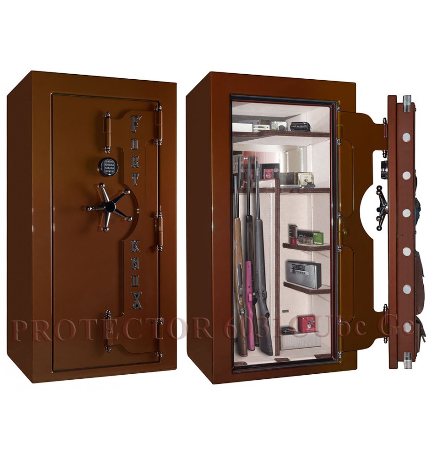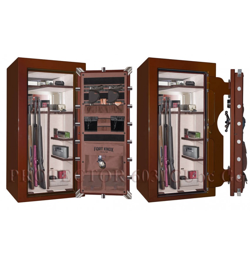 Специальная модификация. Крановая подвеска двери. Покрытие: автомобильный металлик глянцевый «шоколадно-золотистый». Производство Fort Knox® (США). Сейфы Fort Knox® сертифицированы на взломостойкость и огнестойкость в США. Полностью удовлетворяют требованиям МВД. Великолепный дизайн! При изготовлении покрытий для этих сейфов используется специальный декоративный автомобильный металлик, такие же покрытия используются при производстве американских автомобилей премиум класса. Сейфы Fort Knox® изготавливаются непосредственно в США. Замок Сейф оборудован высокосекретным электронным кодовым замком Sargent & Greenleaf® (США). Этот замок вы можете по вашему желанию эксплуатировать как в режиме одного кода, так и в режимах используя от 2-х до 9-и кодов. Можно использовать иерархическую систему кодов: мастер-код – код руководителя – пользовательские коды. Инновационная защита замка от сверления – специальной твёрдой стальной пластиной с подшипниками. Защита Усиленный цельносварной корпус. Специальная технология сварки: проникающие сварные швы снаружи и армирующие сварные швы внутри. Дверь усиленная коробчатой конструкции. Дверь дополнительно имеет защитную стальную плиту толщиной 6,4мм. Дверь оборудована мощной многосторонней ригельной запирающей системой, 14 активных ригелей диаметром 38мм. Данная специальная модификация сейфа Protector 6031 (в отличие от базовой модели) имеет также и угловые ригели, т.е. 4 дополнительных активных ригеля, выдвигающихся из всех углов двери. Эти ригели изготовлены из стальной плиты толщиной 38мм. Повышенная защита ригелей от сверления и выбивания специальной закалённой пластиной. Запатентованный высоконадёжный мощный поворотный запирающий механизм реечно-зубчатого типа обеспечивает увеличенный выход ригелей и повышенную защиту. Инновационный привод поворотного запирающего механизма с муфтой скольжения для защиты замка при приложении крутящего мышечного усилия при попытке взлома. Система внутренних и внешних RELOCKER (блокираторов) для защиты замка или/и запирающего механизма при механических и термических воздействиях. В том числе специальный дистанционный RELOCKER. Межстеночное пространство сейфа имеет так же многослойный огнестойкий наполнитель. Сейфы Fort Knox® Protector испытывают на огнестойкость при более высокой температуре, чем большинство сейфов других американских производителей. Fire Rating 1680°F (огнестойкость при температуре в испытательной печи 916°C, заданный предел огнестойкости 177°C) – 1,5H. Между корпусом и дверью для защиты внутреннего пространства сейфа при пожаре - имеются два контура уплотнения. Один контур для защиты от проникновения внутрь сейфа дыма и копоти. Второй контур может расширяться при нагревании в несколько раз. Он обеспечивает дополнительную герметичность и предназначен для увеличения защиты от проникновения внутрь сейфа раскалённых газов. Внутреннее устройство Внутри сейфа ложементы и полки, съёмные с регулируемой высотой установки. Эта специальная модификация сейфа Protector 6031 имеет дополнительно зеркало на задней внутренней поверхности сейфа. Внутренняя поверхность двери сейфа имеет держатели для пистолетов, карманы и удобные закрывающиеся сумки (т.н. дверной органайзер). New. Теперь на внутренней поверхности двери можно хранить ещё 2 дополнительных ружья. Внутренняя поверхность сей
