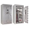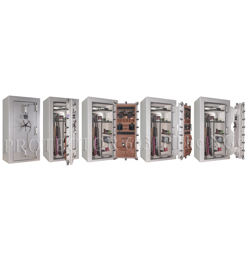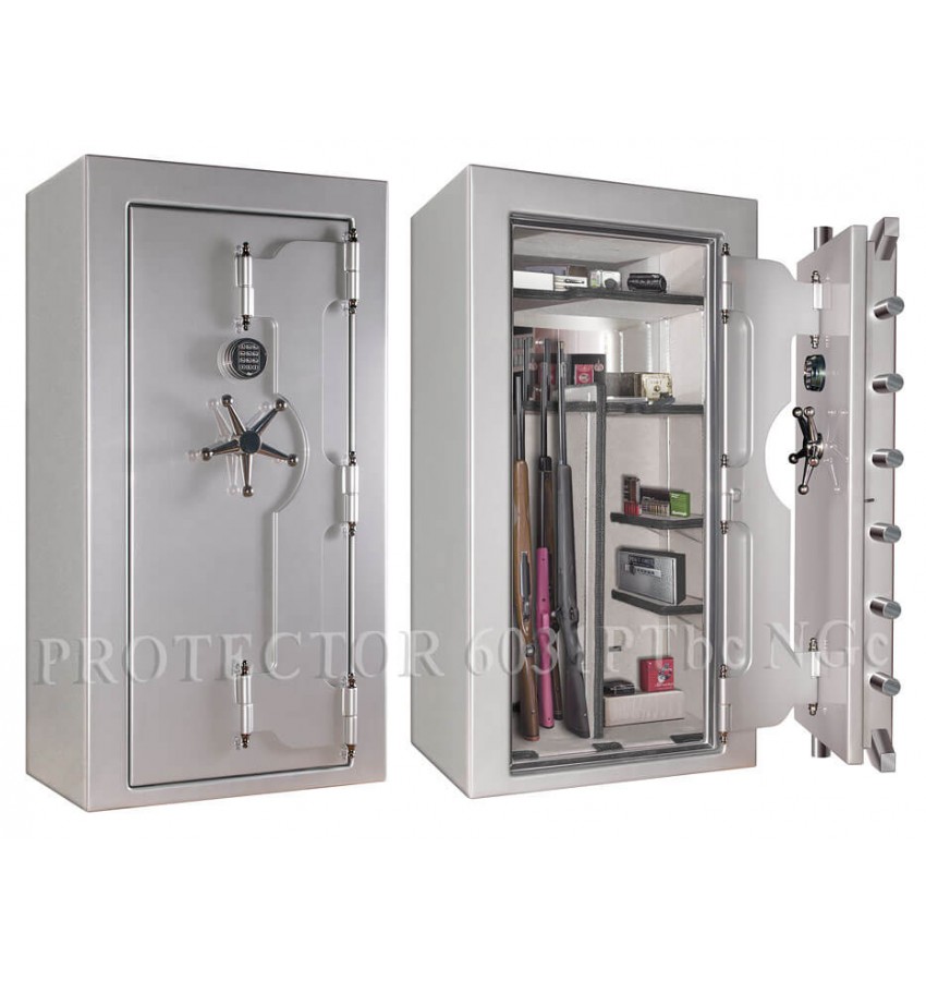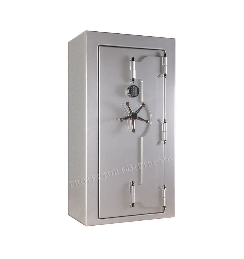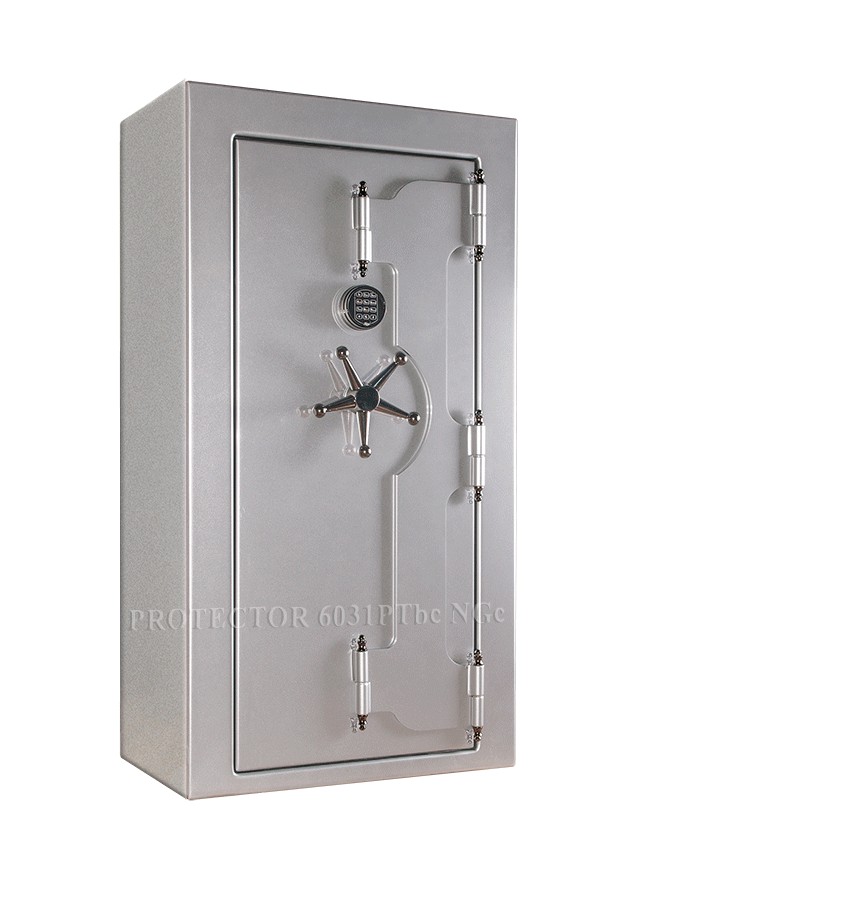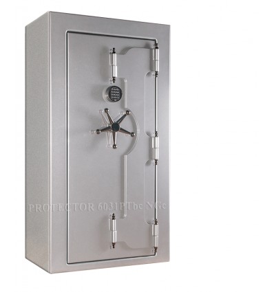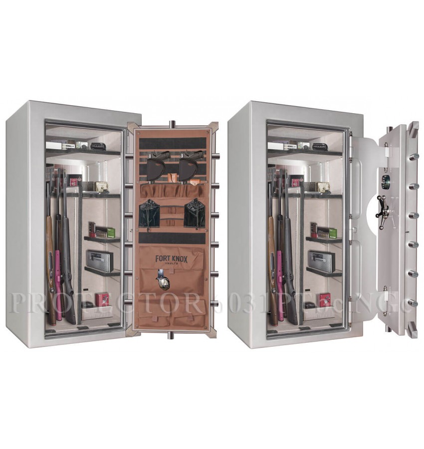Специальная модификация. Крановая подвеска двери. Покрытие: автомобильный металлик глянцевый «Платина». Производство Fort Knox® (США). Сейфы Fort Knox® сертифицированы на взломостойкость и огнестойкость в США. Полностью удовлетворяют требованиям МВД. Великолепный дизайн! При изготовлении покрытий для этих сейфов используется специальный декоративный автомобильный металлик, такие же покрытия используются при производстве американских автомобилей премиум класса. Сейфы Fort Knox® изготавливаются непосредственно в США. Замок Сейф оборудован высокосекретным электронным кодовым замком Sargent & Greenleaf® (США). Этот замок вы можете по вашему желанию эксплуатировать как в режиме одного кода, так и в режимах используя от 2-х до 9-и кодов. Можно использовать иерархическую систему кодов: мастер-код – код руководителя – пользовательские коды. Инновационная защита замка от сверления – специальной твёрдой стальной пластиной с подшипниками. Защита Усиленный цельносварной корпус. Специальная технология сварки: проникающие сварные швы снаружи и армирующие сварные швы внутри. Дверь усиленная коробчатой конструкции. Дверь дополнительно имеет защитную стальную плиту толщиной 6,4мм. Дверь оборудована мощной многосторонней ригельной запирающей системой, 14 активных ригелей диаметром 38мм. Данная специальная модификация сейфа Protector 6031 (в отличие от базовой модели) имеет также и угловые ригели, т.е. 4 дополнительных активных ригеля, выдвигающихся из всех углов двери. Эти ригели изготовлены из стальной плиты толщиной 38мм. Повышенная защита ригелей от сверления и выбивания специальной закалённой пластиной. Запатентованный высоконадёжный мощный поворотный запирающий механизм реечно-зубчатого типа обеспечивает увеличенный выход ригелей и повышенную защиту. Инновационный привод поворотного запирающего механизма с муфтой скольжения для защиты замка при приложении крутящего мышечного усилия при попытке взлома. Система внутренних и внешних RELOCKER (блокираторов) для защиты замка или/и запирающего механизма при механических и термических воздействиях. В том числе специальный дистанционный RELOCKER. Межстеночное пространство сейфа имеет так же многослойный огнестойкий наполнитель. Сейфы Fort Knox® Protector испытывают на огнестойкость при более высокой температуре, чем большинство сейфов других американских производителей. Fire Rating 1680°F (огнестойкость при температуре в испытательной печи 916°C, заданный предел огнестойкости 177°C) – 1,5H. Между корпусом и дверью для защиты внутреннего пространства сейфа при пожаре - имеются два контура уплотнения. Один контур для защиты от проникновения внутрь сейфа дыма и копоти. Второй контур может расширяться при нагревании в несколько раз. Он обеспечивает дополнительную герметичность и предназначен для увеличения защиты от проникновения внутрь сейфа раскалённых газов. Внутреннее устройство Внутри сейфа ложементы и полки, съёмные с регулируемой высотой установки. Эта специальная модификация сейфа Protector 6031 имеет дополнительно зеркало на задней внутренней поверхности сейфа. Внутренняя поверхность двери сейфа имеет держатели для пистолетов, карманы и удобные закрывающиеся сумки (т.н. дверной органайзер). New. Теперь на внутренней поверхности двери можно хранить ещё 2 дополнительных ружья. Внутренняя поверхность сейфа, а также вну