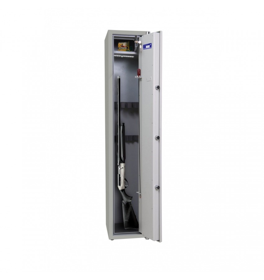 Сейф сертифицирован по ECB-s и имеет сертификат класса S1. Оборудован антивзломной конструкцией- зацеп, в случае попытки взлома острым предметом или отгибания. Ригельная система состоит из пяти активных ригелей и закрывает дверь в три стороны. Диаметр ригеля составляет 25мм. Установлены каленые пластины для защиты от выбивания замков. На дверях можно установить в удобном порядке навесные карманы, крючки и держатели под шомполы. Ложемент съемный на магните, возможно установить на любую высоту. Установлен электронный кодовый замок M-Locks(нидерланды), с выводом под аварийное питание. Оснащен отверстиями для крепления к стене. Окрашен безопасной порошковой краской, серого цвета Ral 7035,Ral 7040. Два запираемых ящика(трейзера) для патронов