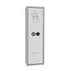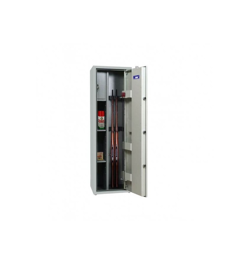 Сейф сертифицирован по ECB-s и имеет сертификат класса S1. Оборудован антивзломной конструкцией- зацеп, в случае попытки взлома острым предметом или отгибания. Ригельная система состоит из пяти активных ригелей и закрывает дверь в три стороны. Диаметр ригеля составляет 25мм. Установлены каленые пластины для защиты от выбивания замков. На дверях можно установить в удобном порядке навесные карманы, крючки и держатели под шомполы. Ложемент съемный на магните, возможно установить на любую высоту. Толщина металла 3 мм. Установлен электронный кодовый замок M-Locks(нидерланды), с выводом под аварийное питание. Оснащен отверстиями для крепления к стене. Окрашен безопасной порошковой краской, коричневого цвета. Два запираемых ящика(трейзера) для патронов