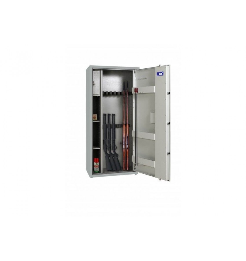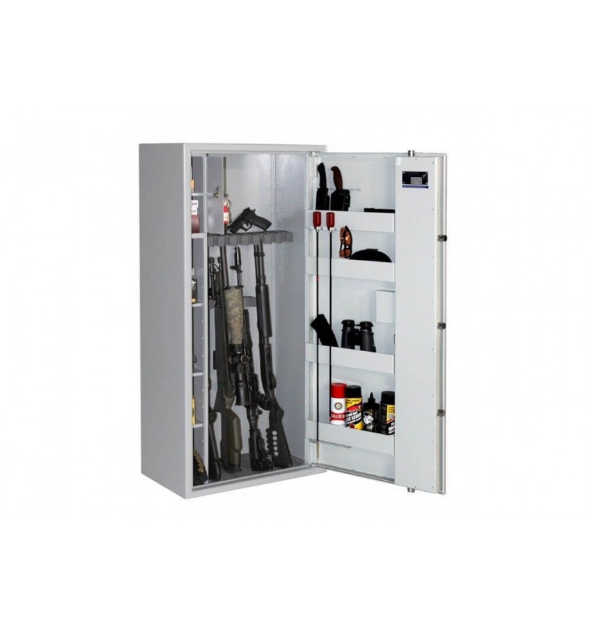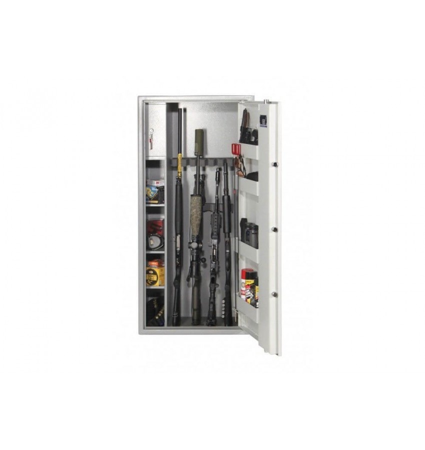 Взломостойкий оружейный сейф,сертифицирован в лаборатории ECB-S(Германия) по европейскому стандарту EN 14450. Установлена антивзломная защита -зацеп, от отгибания двери отверткой или острым предметом. Трехстороння активная ригельная система представлена 5 вращающимся хромированными ригелями диаметром 25 мм. Петли оборудованы антисрезом. На двери установлены съемные карманы, держатели и крючки для хранения ножей,шомполов и средств по уходу за оружием. Ложемент можно переместить под удобную высоту. Установлен электронный замок M-Locks Нидерланды. Сейф окрашен порошковой краской цвет серый RAL 7035/7040. В сейфе сделаны отверстия для крепления к стене. Отдельно запираемый ящик для хранения патронов или личных вещей. Гарантия на корпус 5 лет. Гарантия на замок 1 год