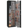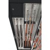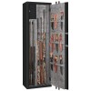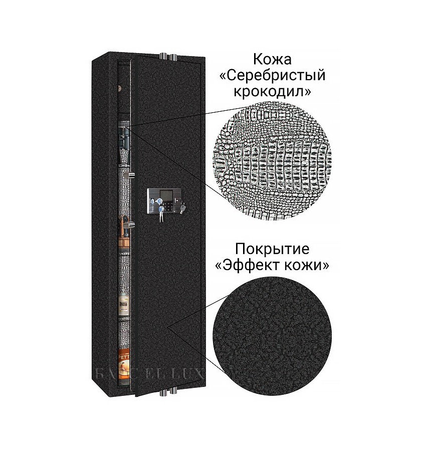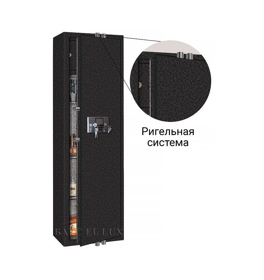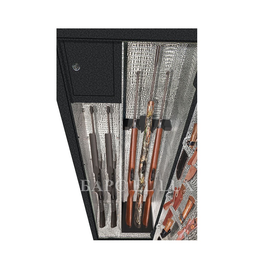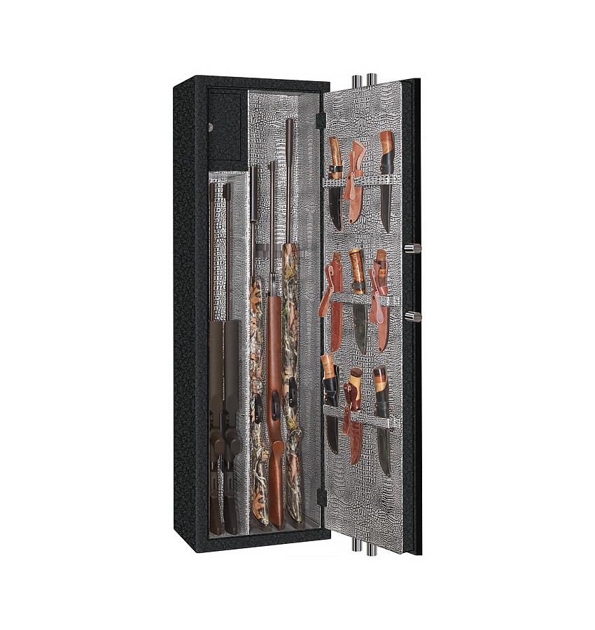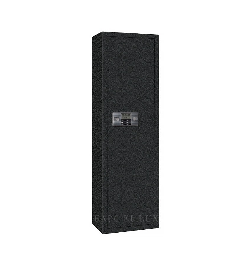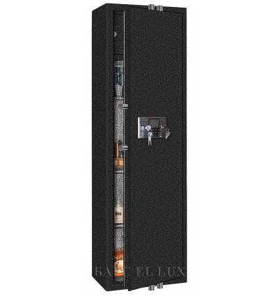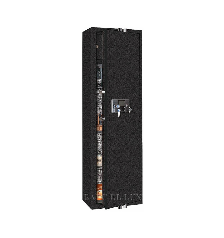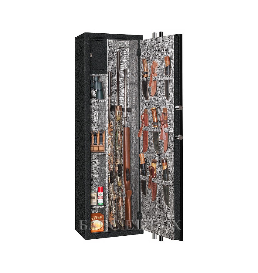 ОписаниеСейф полностью удовлетворяет требованиям Росгвардии к хранению оружия физическими лицами. Оснащен электронным кодовым сейфовым замком. Оборудован удобными ложементами для хранения оружия. На внутренней поверхности двери сейфа имеются рамки для хранения ножей. Имеются отверстия на задней стенке сейфа для крепления к стене. Прочная порошковая краска защищает сейф от коррозии. Модель имеет полную внутреннюю мягкую отделку искусственной кожей. Замок Наружная дверь сейфа оборудована двумя замками: ключевым и высокоинтеллектуальным электронным кодовым. Сейф имеет систему аварийного открывания master-lock, которая позволит Вам открыть и перепрограммировать электронный замок Вашего сейфа, если забыт установленный Вами код и т.п. Индивидуальные мастер-ключи входят в комплект сейфа. Электронный замок сейфа имеет удобный дисплей с подсветкой. В режиме ожидания дисплей отображает текущий год, месяц, число, день недели и время. Также на дисплее отображается уровень заряда батарей. Предусмотрена функция просмотра статистики открываний сейфа с индикацией даты и времени открывания сейфа. Длина кодовых комбинаций электронного замка до 8 цифр. Два пользовательских кода - рабочий код и мастер-код. Оба кода программирует сам владелец. Сейф имеет мощную вертикальную и горизонтальную ригельную систему с запиранием по всем сторонам. Всего 6 мощных активных ригелей. Защита Сейф имеет мощную сигнализацию-сирену, которая срабатывает при ударе по сейфу. Этот режим охраны при желании включает сам владелец сейфа нажатием одной кнопки. При ударе по сейфу сигнализация работает в течении 1 минуты, затем опять встаёт в режим охраны. Кроме того, сигнализацию может выключить только владелец сейфа, просто набрав свой правильный код. Также сигнализация обязательно автоматически включается – если три раза неправильно набран код. Изготовлен из стали толщиной 3 и 4 мм. Петли – внутренние из стали 6мм. Двери сейфа имеют коробчатую конструкцию для дополнительного усиления. Внутреннее устройство Вертикальная перегородка, которая делит внутреннее пространства сейфа на две области. В "широкой области" имеются нижние и верхние деревянные ложементы специальной удобной формы. В "узкой области" находится запираемое (патронное) отделение и 3 съемные регулируемые по высоте полки. Если устанавливать не все полки, то в узкой зоне можно хранить ещё два ствола. Внутренняя поверхность двери имеет три держателя для удобного хранения ножей. Установка Предусмотрена возможность крепления сейфа к стене и к полу. Модификации В базовом варианте сейф поставляется с панелью Хром. По желанию заказчика может поставляться с панелью Gold, имеющей покрытие золотом 24 карата. По желанию заказчика возможна замена верхних деревянных ложементов на ложементы других типов, например роликовые ложементы-зажимы производства Германии. По желанию заказчика сейф дополнительно может быть оборудован опломбирующими устройствами. По желанию заказчика возможно изменение типа и количества замков (например: электронный замок + ключевой замок, два электронных замка и др.), размеров, толщины металла, внутреннего устройства и т.п. Дополнительная информация Ружья можно хранить как по одну сторону от перегородки, так и по обе стороны от перегородки. Сейф имеет гигиенически безопасное износо-