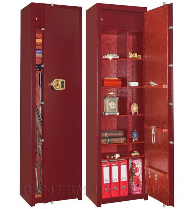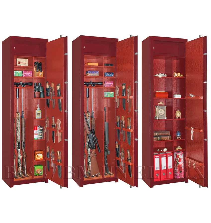 ОписаниеУниверсальный сейф, может использоваться как оружейный сейф либо как личный (офисный) сейф. Сейф полностью удовлетворяет требованиям МВД и Росгвардии к хранению оружия физическими и юридическими лицами. Толщина металла не менее 3 мм. Оснащен электронным сейфовым замком. Оборудован удобными ложементами для хранения оружия. Имеются анкерные отверстия на задней стенке сейфа для крепления к стене. Декоративное полу-глянцевое бордовое покрытие. Внутри сейф полностью отделан кожей. Замок Сейф оборудован высокосекретным сертифицированным электронным замком La Gard (США). Этот замок Вы можете использовать с одним пользовательским кодом либо с двумя кодами: код руководителя (мастер-код) и рабочий код. Оба кода программирует сам владелец сейфа. Подробная и понятная инструкция на русском языке прилагается. Сейф имеет мощные горизонтальную и вертикальную ригельные системы, с запиранием по всем сторонам. Защита Изготовлен из стали толщиной 3 и 4 мм. Петли - внутренние из стали 6мм. Дверь сейфа имеет коробчатую конструкцию для дополнительного усиления. Усиленный корпус. Внутреннее устройство Сейф имеет внутреннее запираемое (патронное) отделение и вертикальную перегородку, которая делит внутреннее пространства сейфа на две области. Внутри широкой области пять съёмных полок с регулируемой высотой установки, а также деревянные нижние и верхние фигурные ложементы на 4 ствола. Также в широкой области имеется роликовый ложемент-зажим (производства Германии) с регулируемой высотой установки. Этот ложемент может быть использован для хранения в широкой области пятого ствола либо для дополнительной боковой фиксации оружия с оптикой. Внутри узкой области пять съёмных полок с регулируемой высотой установки, а также деревянные нижние и верхние ложементы на 2 ствола. Все деревянные ложементы сейфа имеют отделку искусственной кожей различных цветов. По желанию заказчика возможна замена верхних деревянных ложементов на роликовые ложементы-зажимы производства Германии либо дополнительная комплектация сейфа такими ложементами. Ружья в сейфе можно хранить как в широкой, так и в узкой области. Сейф дополнительно может быть укомплектован пистолетными ложементами (деревянными либо пластиковыми). Внутренняя поверхность двери сейфа позволяет хранить на ней ножи и т.п. Сейф имеет декоративную полную внутреннюю мягкую отделку искусственной кожей «бордовый питон». Полная внутренняя мягкая отделка защищает Ваше оружие от контакта с металлом, царапин, повреждений и т.п. Установка Предусмотрена возможность крепления сейфа к стене. По желанию заказчика возможна поставка в исполнении, предусматривающем также крепление и к полу. Модификации Высота хранимых стволов 1440 либо 1655мм., в зависимости от модификации - уточняйте это при заказе. По желанию заказчика возможна поставка данного сейфа с внутренней отделкой других цветов и рисунков по нашему каталогу. New! Поступила искусственная кожа, имитирующая кожу крокодилов, змей и т.п. Тоже различных цветов! По желанию заказчика возможна поставка сейфа с покрытиями других цветов и структур (металики, антики и др.), а также поставка с кодовой панелью «Chrom» вместо «Gold-design». По желанию заказчика возможна поставка сейфов с электронными замками Mauer (Германия) вместо La Gard (США). Для любого из этих замков Вы так 