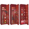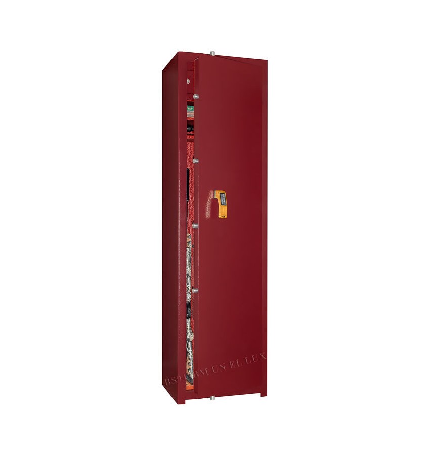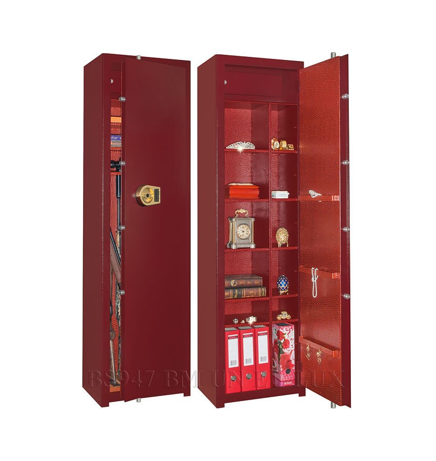 ОписаниеУниверсальный сейф, может использоваться как оружейный сейф либо как личный (офисный) сейф. Полностью удовлетворяет требованиям МВД для физических и юридических лиц. Сейф имеет гигиенически безопасное износо- и коррозионно-устойчивое полимерное порошковое покрытие на основе материалов производства Италии и Франции. Сейфы в специальном исполнении «BM» имеют декоративное бордовое полуглянцевое покрытие, которое хорошо сочетается практически с любой мебелью. Для сейфов в исполнении «BM» в базовом варианте используются кодовые панели «Gold-design» (как на фото). Замок Сейф оборудован высокосекретным сертифицированным электронным замком La Gard (США). Этот замок Вы можете использовать с одним пользовательским кодом либо с двумя кодами: код руководителя (мастер-код) и рабочий код. Оба кода программирует сам владелец сейфа. Подробная и понятная инструкция на русском языке прилагается. Сейф имеет мощные горизонтальную и вертикальную ригельные системы, с запиранием по всем сторонам. Защита Изготовлен из стали толщиной 3 и 4 мм. Петли - внутренние из стали 6мм. Дверь сейфа имеет коробчатую конструкцию для дополнительного усиления. Усиленный корпус. Внутреннее устройство Сейф имеет внутреннее запираемое (патронное) отделение и вертикальную перегородку, которая делит внутреннее пространства сейфа на две области. Внутри широкой области пять съёмных полок с регулируемой высотой установки, а также деревянные нижние и верхние фигурные ложементы на 4 ствола. Также в широкой области имеется роликовый ложемент-зажим (производства Германии) с регулируемой высотой установки. Этот ложемент может быть использован для хранения в широкой области пятого ствола либо для дополнительной боковой фиксации оружия с оптикой. Внутри узкой области пять съёмных полок с регулируемой высотой установки, а также деревянные нижние и верхние ложементы на 2 ствола. Все деревянные ложементы сейфа имеют отделку искусственной кожей различных цветов. По желанию заказчика возможна замена верхних деревянных ложементов на роликовые ложементы-зажимы производства Германии либо дополнительная комплектация сейфа такими ложементами. Ружья в сейфе можно хранить как в широкой, так и в узкой области. Сейф дополнительно может быть укомплектован пистолетными ложементами (деревянными либо пластиковыми). Внутренняя поверхность двери сейфа позволяет хранить на ней ножи и т.п. Сейф имеет декоративную полную внутреннюю мягкую отделку искусственной кожей «бордовый питон». Полная внутренняя мягкая отделка защищает Ваше оружие от контакта с металлом, царапин, повреждений и т.п. Установка Предусмотрена возможность крепления сейфа к стене. По желанию заказчика возможна поставка в исполнении, предусматривающем также крепление и к полу. Модификации Высота хранимых стволов 1440 либо 1655мм., в зависимости от модификации - уточняйте это при заказе. По желанию заказчика возможна поставка данного сейфа с внутренней отделкой других цветов и рисунков по нашему каталогу. New! Поступила искусственная кожа, имитирующая кожу крокодилов, змей и т.п. Тоже различных цветов! По желанию заказчика возможна поставка сейфа с покрытиями других цветов и структур (металики, антики и др.), а также поставка с кодовой панелью «Chrom» вместо «Gold-design». По желанию заказчика возможна поставка сейфов с элект