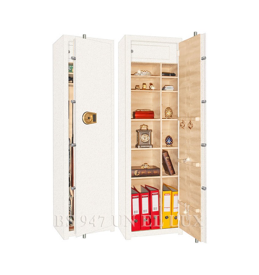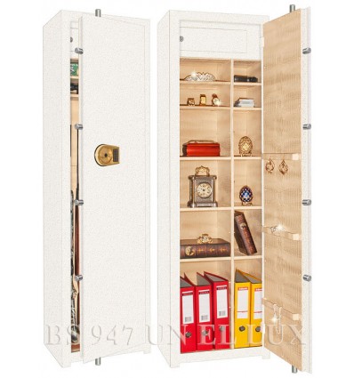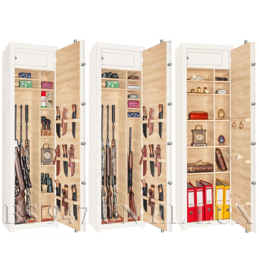ОписаниеУниверсальный сейф, может использоваться как оружейный сейф либо как личный (офисный) сейф. Полностью удовлетворяет требованиям МВД для физических и юридических лиц. Сейф имеет гигиенически безопасное износо- и коррозионно-устойчивое полимерное порошковое покрытие на основе материалов производства Италии и Франции. Имеются покрытия различных цветов и структур: металики, антики и д.р. Различные варианты цветового дизайна, например: корпус и двери имеют одинаковое покрытие, либо корпус и двери имеют покрытия разного цвета. Модель имеет полную внутреннюю мягкую отделку искусственной кожей. Полная внутренняя мягкая отделка защищает Ваше оружие от контакта с металлом, царапин, повреждений и т.п. Искусственная кожа (различных цветов и рисунков по нашему каталогу), в том числе имитирующая кожу крокодилов, змей и т.п. Замок Сейф оборудован высокосекретным сертифицированным электронным замком La Gard (США). Этот замок Вы можете использовать с одним пользовательским кодом либо с двумя кодами: код руководителя (мастер-код) и рабочий код. Оба кода программирует сам владелец сейфа. Подробная и понятная инструкция на русском языке прилагается. Сейф имеет мощные горизонтальную и вертикальную ригельные системы, с запиранием по всем сторонам. Защита Изготовлен из стали толщиной 3 и 4 мм. Петли – внутренние из стали 6 мм. Двери сейфа имеет коробчатую конструкцию для дополнительного усиления. Внутреннее устройство Сейф имеет внутреннее запираемое (патронное) отделение и вертикальную перегородку, которая делит внутреннее пространства сейфа на две области. Внутри широкой области пять съёмных полок с регулируемой высотой установки, а также деревянные нижние и верхние фигурные ложементы на 4 ствола. Также в широкой области имеется роликовый ложемент-зажим (производства Германии) с регулируемой высотой установки. Этот ложемент может быть использован для хранения в широкой области пятого ствола либо для дополнительной боковой фиксации оружия с оптикой. Внутри узкой области пять съёмных полок с регулируемой высотой установки, а также деревянные нижние и верхние ложементы на 2 ствола. Все деревянные ложементы сейфа имеют отделку искусственной кожей различных цветов. По желанию заказчика возможна замена верхних деревянных ложементов на роликовые ложементы-зажимы производства Германии либо дополнительная комплектация сейфа такими ложементами. Ружья в сейфе можно хранить как в широкой, так и в узкой области. Сейф дополнительно может быть укомплектован пистолетными ложементами (деревянными либо пластиковыми). Внутренняя поверхность двери сейфа позволяет хранить на ней ножи, шомпола, связки ключей и т.п. Установка Предусмотрена возможность крепления сейфа к стене. По желанию заказчика возможна поставка в исполнении, предусматривающем также крепление и к полу. Модификации Высота хранимых стволов 1440 либо 1655мм., в зависимости от модификации - уточняйте это при заказе. Возможно изготовление модели с фасадом из стального листа толщиной 6мм, стоимость данной модификации выше на 20%. По желанию заказчика возможна установка комбинационных замков на внутреннее запираемое отделение. По желанию заказчика сейф дополнительно может быть оборудован опломбирующими устройствами. Существуют также модификации данного сейфа с дополнительным кл