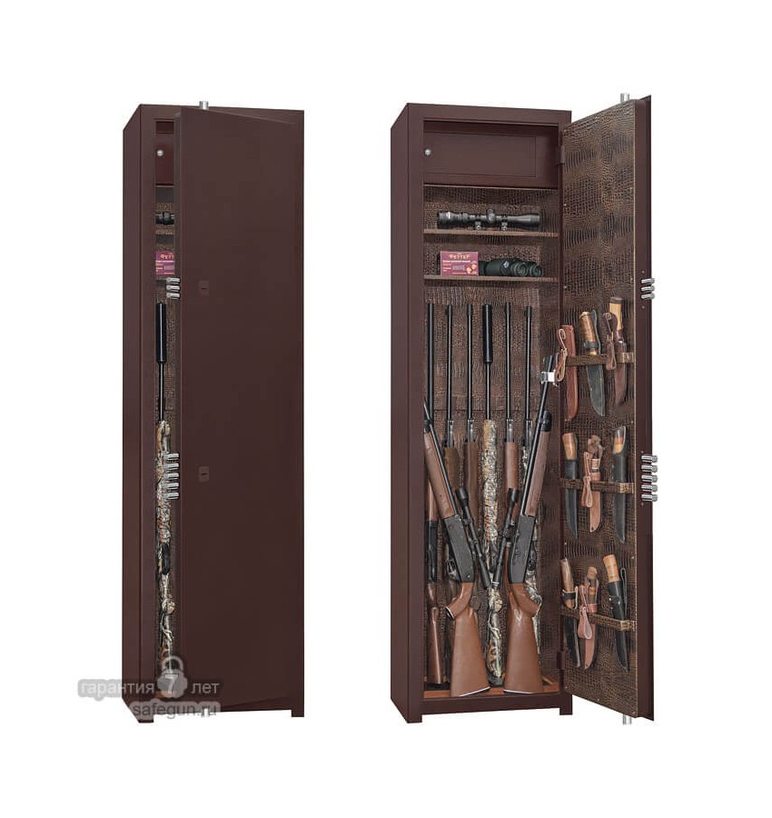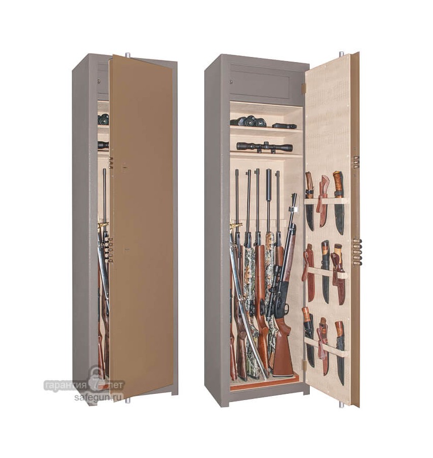 ОписаниеУниверсальный сейф, может использоваться как оружейный сейф либо как личный (офисный) сейф. Сейф полностью удовлетворяет требованиям МВД и Росгвардии к хранению оружия физическими и юридическими лицами. Толщина металла не менее 3 мм. Оснащен электронным сейфовым замком. Оборудован удобными ложементами для хранения оружия. Имеются анкерные отверстия на задней стенке сейфа для крепления к стене. Внутри сейф полностью отделан кожей. Замок Сейф оборудован двумя сертифицированными ключевыми замками: пятиригельный замок 4-го класса!!! повышенной секретности (1,5 миллиона комбинаций) и взломостойкости плюс трёхригельный замок 3 класса. Замки произведены совместно с Cisa (Италия). Также сейф оборудован вертикальной ригельной системой с запиранием по всем сторонам. Защита Изготовлен из стали толщиной 3 и 4 мм. Петли - внутренние из стали 6 мм. Двери сейфа имеет коробчатую конструкцию для дополнительного усиления. Внутреннее устройство Сейф имеет внутреннее запираемое (патронное) отделение, пять съемных полок, деревянные нижние и верхние фигурные ложементы (отделанные искусственной кожей), а также два роликовых ложемента-зажима (производства Германии) с регулируемой высотой установки. Роликовые ложементы удобны для хранения оружия с оптикой. По желанию заказчика возможно изменение соотношения деревянных и роликовых ложементов. Внутренняя поверхность двери сейфа позволяет хранить на ней ножи, шомпола, связки ключей и т.п. Установка Предусмотрена возможность крепления сейфа к стене. По желанию заказчика возможна поставка в исполнении, предусматривающем также крепление и к полу. Модификации Высота хранимых стволов 1440 либо 1655мм., в зависимости от модификации - уточняйте это при заказе. Возможно изготовление модели с фасадом из стального листа толщиной 6мм, стоимость данной модификации выше на 20%. По желанию заказчика возможна установка комбинационных замков на внутреннее запираемое отделение. По желанию заказчика сейф дополнительно может быть оборудован опломбирующими устройствами. Существуют также модификации данного сейфа с дополнительным ключевым замком на наружной двери. По желанию заказчика возможно изменение размеров, толщины металла, внутреннего устройства, типа и количества замков и т.п. Имеются в продаже оригинальные антресоли к сейфам этой серии. При приобретении сейфа в комплекте с антресолью требуйте обязательную скидку. Сейф имеет гигиенически безопасное износо- и коррозионно-устойчивое полимерно-порошковое покрытие на основе материалов производства Италии и Франции. Имеются покрытия различных цветов и структур: металлики, антики и д.р. Различные варианты цветового дизайна, например: корпус и двери имеют одинаковое покрытие, либо корпус и двери имеют покрытия разного цвета - выбирайте. Модель имеет полную внутреннюю мягкую отделку искусственной кожей. Полная внутренняя мягкая отделка защищает Ваше оружие от контакта с металлом, царапин, повреждений и т.п. Искусственная кожа имитирует кожу крокодилов, змей различных цветов! ДоставкаСтоимость доставки по Москве в пределах МКАД: при заказе от 20 000 рублей бесплатно, менее 20000 руб - 1200 рублей Доставка возможна на 05.12.2025 или на 06.12.2025 Доставка по РФ и СНГ: по тарифам транспортных компаний Стоимость разгрузки: 1650 руб СамовывозСамовывоз: со склада, после после 