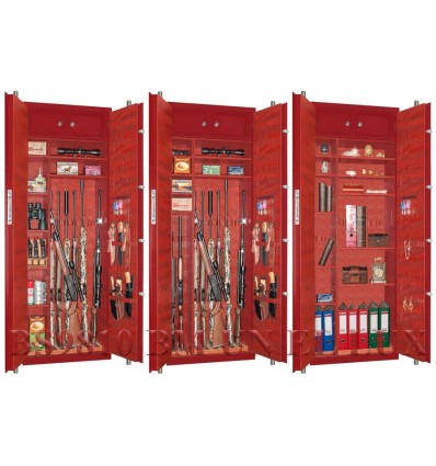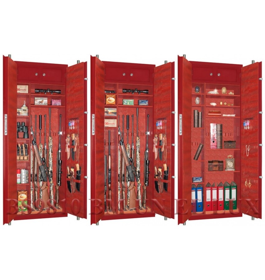ОписаниеУниверсальный сейф, может использоваться как оружейный сейф либо как личный (офисный) сейф. Полностью удовлетворяет требованиям МВД для физических и юридических лиц. Сейф имеет гигиенически безопасное износо- и коррозионно-устойчивое полимерное порошковое покрытие на основе материалов производства Италии и Франции. Сейфы в специальном исполнении «BM» имеют декоративное бордовое полуглянцевое покрытие, которое хорошо сочетается практически с любой мебелью. Для сейфов в исполнении «BM» в базовом варианте используются кодовые панели «Gold-design». Замок Сейф оборудован высокосекретным сертифицированным электронным замком La Gard (США). Этот замок Вы можете использовать с одним пользовательским кодом либо с двумя кодами: код руководителя (мастер-код) и рабочий код. Оба кода программирует сам владелец сейфа. Подробная и понятная инструкция на русском языке прилагается. Сейф имеет мощные ригельные системы: горизонтальную и две вертикальные (на каждой двери) - с запиранием по всем сторонам. Защита Изготовлен из стали толщиной 3 и 4 мм. Петли – внутренние из стали 6мм. Двери сейфа имеют коробчатую конструкцию для дополнительного усиления. Внутреннее устройство Внутри сейфа два запираемых (патронных) отделения и вертикальная перегородка которая делит внутреннее пространство сейфа на две области. Внутри «широкой» области 5 съёмных полок и деревянные ложементы на шесть стволов. Также в «широкой» области имеются два боковых роликовых зажима с регулируемой высотой установки (для хранения в широкой области седьмого и восьмого ствола либо для дополнительной фиксации оружия с оптикой). Внутри «узкой» области 5 съёмных полок и деревянные ложементы на два ствола. Все полки с регулируемой высотой установки. Ружья можно хранить как по одну сторону от перегородки, так и по обе стороны от перегородки. По желанию заказчика возможна поставка с дополнительными полками. На внутренней поверхности одной из дверей сейфа имеются два держателя для хранения ножей и крючки для хранения шомполов, ключей и прочего. Установка Предусмотрена возможность крепления сейфа к стене. По желанию заказчика возможна поставка в исполнении, предусматривающем также крепление и к полу. Модификации Высота хранимых стволов 1445 либо 1640мм, в зависимости от модификации - уточняйте это при заказе. Возможно изготовление модели с фасадом из стального листа толщиной 6мм, стоимость данной модификации выше на 20%. По желанию заказчика возможна поставка сейфа с покрытиями других цветов и структур (металики, антики и др.), а также поставка с кодовой панелью «Chrom» вместо «Gold-design». По желанию заказчика возможна поставка сейфов с электронными замками Mauer (Германия) вместо La Gard (США). Для любого из этих замков Вы так же можете выбрать дизайн кодовой панели электронного замка: Chrom либо Gold. Кодовая панель Mauer Gold имеет покрытие золотом 24 карата (подтверждено европейским сертификатом). При поставке сейфа с замком Mauer Gold (вместо замка La Gard Gold-design) – доплата 8800 рублей. По желанию заказчика возможна установка комбинационных замков на внутренние запираемые отделения. По желанию заказчика сейф дополнительно может быть оборудован опломбирующими устройствами. Существуют также модификации данного сейфа с дополнительным ключевым замком на наружной двери. По желанию заказчика возможно изменен