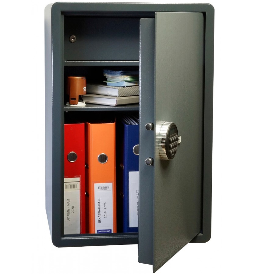 - На поверхность сейфа нанесено двух цветное полимерное покрытие двух оттенков серого цвета.