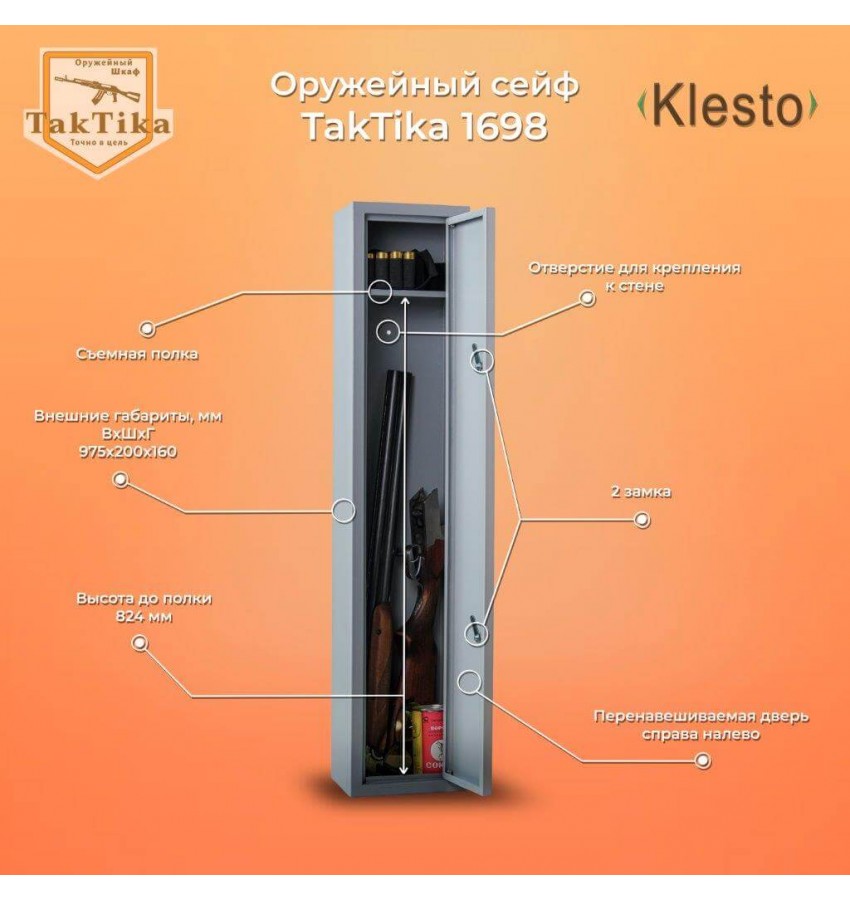 ОписаниеОруженый шкаф TakTika 1698 полностью соответствует требованиям извложенным в статье 59 Постановлениия Правительства России от 21 июля 1998 г. № 814 «О мерах по регулированию оборота гражданского и служебного оружия и патронов к нему на территории Российской Федерации» и приказу МВД ПРИКАЗ от 12 апреля 1999 г. N 288 ДоставкаСтоимость доставки по Москве в пределах МКАД: при заказе от 20 000 рублей бесплатно, менее 20000 руб - 1200 рублей Доставка возможна на 05.12.2025 или на 06.12.2025 Доставка по РФ и СНГ: по тарифам транспортных компаний Стоимость разгрузки: 50 руб СамовывозСамовывоз: со склада, после после подтверждения заказа ОплатаОплата: наличными при получении товара, безналичный расчет ( 100% предоплата) Сейф Klesto Taktika 1698 |