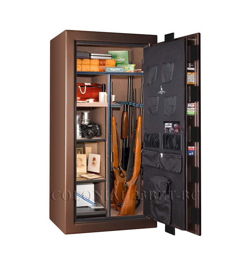 Покрытие: Бронзовый текстурированный. Производство Liberty Safe and Security Products, Inc (США, штат Юта). Сейфы Liberty сертифицированы на взломостойкость и огнестойкость в США. Полностью удовлетворяют требованиям МВД. Сейфы изготавливаются непосредственно в США. Замок Сейф оборудован высокосекретным электронным кодовым замком SecuRam® (США). Защита замка – трёхслойной закалённой пластиной. New! Кодовая панель замка теперь имеет удобную светодиодную подсветку. Защита Усиленный корпус. Дверь усиленная коробчатой конструкции. Дополнительное усиление двери внутренней стальной полосой. Дверь оборудована мощной многосторонней ригельной запирающей системой, 12 активных ригелей диаметром 25мм. X-Cam Mech - эксцентриковый запирающий механизм. Инновационный привод поворотного запирающего механизма «SURETIGHT» с муфтой скольжения для защиты замка при приложении крутящего мышечного усилия при попытке взлома. Устойчивость к взлому сейфа не менее 30Ес. Система внутренних и внешних Fail-Safe™ relocker для блокировки замка или/и запирающего механизма при механических и термических воздействиях на замок. Security Level (взломостойкость по шкале Liberty Safe) – 18. Fire Rating 1200°F (огнестойкость при температуре в испытательной печи 649°C, заданный предел огнестойкости 177°C) – 1,0H. BTU Heat Rating (огнестойкость в Британских единицах тепловой мощности) – 83,000 BTUs. Для дополнительной защиты от проникновения внутрь сейфа при пожаре раскалённых газов, тушащих жидкостей и гари – предусмотрен уплотнительный контур между дверью и корпусом сейфа. Эти уплотнительные прокладки выполнены из специального термостойкого материала и расширяются при пожаре (до 7 раз), обеспечивая дополнительную герметичность. Внутреннее устройство Внутри сейфа ложементы и полки, съёмные с регулируемой высотой установки. Внутренняя поверхность двери сейфа имеет держатели для пистолетов, карманы и удобные закрывающиеся сумки. Внутренняя поверхность сейфа, а также внутренние элементы имеют мягкую отделку. Установка Конструкцией сейфа предусмотрена возможность его крепления к полу. Дополнительная информация В сейфе ружья можно хранить как по одну сторону от перегородки, так и по обе стороны от перегородки.