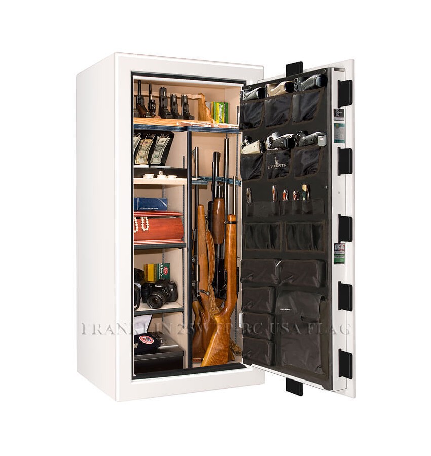 Покрытие: Жемчужно белый, автомобильный глянец. Ограниченная юбилейная серия c стилизованным изображением американского флага на двери. Универсальный сейф, может использоваться как в качестве оружейного сейфа, так и в качестве личного сейфа. Производство Liberty Safe and Security Products, Inc (США, штат Юта). Сейфы Liberty сертифицированы на взломостойкость и огнестойкость в США. Полностью удовлетворяют требованиям МВД. Великолепный дизайн! Сейфы изготавливаются непосредственно в США. Замок Сейф оборудован высокосекретным электронным кодовым замком SecuRam® (США). Замок имеет удобный дисплей. Этот замок Вы можете использовать с одним пользовательским кодом либо с двумя кодами: код руководителя (мастер-код) и рабочий код. Защита замка – трёхслойной закалённой пластиной. New! Кодовая панель замка теперь имеет удобную светодиодную подсветку. Защита Усиленный корпус. Дверь усиленная коробчатой конструкции. Дополнительное усиление двери внутренним стальным листом. Дверь оборудована мощной многосторонней ригельной запирающей системой, 14 активных ригелей диаметром 32мм. Специальные пластины внутри двери на рейках с ригелями для усиления защиты при попытке вскрытия монтировкой, рычагом и т.п. Инновационный поворотный запирающий механизм DX-90 MONSTER MECH с усиленной защитой. Увеличенный выход ригелей по сравнению с традиционными запирающими механизмами. Тип запирающего механизма - со смещенным центром, эксцентриковый, прямого привода. Этот запирающий механизм имеет лучшую защиту от бокового выбивания ригелей (по сравнению с традиционными запирающими механизмами). Инновационный привод поворотного запирающего механизма «SURETIGHT» с муфтой скольжения для защиты замка при приложении крутящего мышечного усилия при попытке взлома. Устойчивость к взлому сейфа не менее 30Ес. Система внутренних и внешних Fail-Safe™ relocker для блокировки замка или/и запирающего механизма при механических и термических воздействиях на замок. Security Level (взомостойкость по шкале Liberty Safe) – 23. Fire Rating 1200°F (огнестойкость при температуре в испытательной печи 649°C, заданный предел огнестойкости 177°C) – 1,25H. BTU Heat Rating (огнестойкость в Британских единицах тепловой мощности) – 86,000 BTUs. Внутреннее устройство Внутри сейфа ложементы и полки, съёмные с регулируемой высотой установки. Внутренняя поверхность корпуса, а также внутренние элементы имеют мягкую отделку. Внутренняя поверхность двери сейфа имеет держатели для пистолетов, карманы, держатели для ножей и т.п., удобные закрывающиеся сумки. Так же имеется специальный закрывающийся пакет COOL POCKET™ для хранения особо важных документов. Он изготовлен из специальных материалов и обеспечивает дополнительную тепловую защиту. Установка Конструкцией сейфа предусмотрена возможность его крепления к полу. Дополнительная информация Сейфы этой специальной серии были произведены небольшой партией. Сейчас в продаже во всём мире осталось небольшое количество таких сейфов. Торопитесь. У нас так же в наличии осталось всего несколько последних экземпляров этих сейфов. В сейфе ружья можно хранить как по одну сторону от перегородки, так и по обе стороны от перегородки