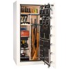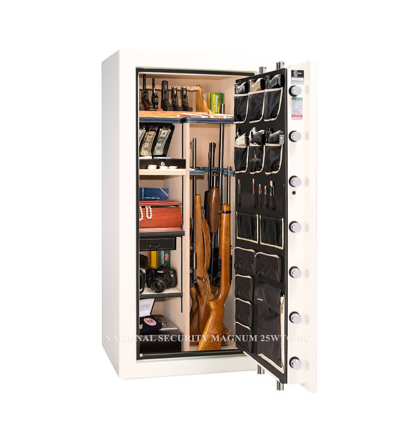ОписаниеПокрытие: Автомобильный глянец жемчужно-белый. Универсальный сейф, может использоваться как в качестве оружейного сейфа, так и в качестве личного сейфа. Производство Liberty Safe and Security Products, Inc (США, штат Юта). Сейфы Liberty сертифицированы на взломостойкость и огнестойкость в США. Полностью удовлетворяют требованиям МВД. Великолепный дизайн! При изготовлении покрытий для этих сейфов используется специальный декоративный автомобильный металлик, такие же покрытия используются при производстве американских автомобилей премиум класса. Сейфы изготавливаются непосредственно в США. Замок Сейф оборудован высокосекретным электронным кодовым замком Sargent & Greenleaf (США). Этот замок вы можете по вашему желанию эксплуатировать как в режиме одного кода, так и в режимах используя от 2-х до 9-и кодов. Можно использовать иерархическую систему кодов: мастер-код – код руководителя – пользовательские коды. Инновационная защита замка – закалённой пластиной с вращающимися шариками. Шарики вращаются если в них упирается сверло. Защита Усиленный корпус. Дверь усиленная коробчатой конструкции. Дополнительное усиление двери внутренней стальной плитой. Дверь оборудована мощной многосторонней ригельной запирающей системой, 18 активных ригелей диаметром 38мм. Специальные пластины внутри двери на рейках с ригелями для усиления защиты при попытке вскрытия монтировкой, рычагом и т.п. Лучший в своём классе поворотный запирающий механизм GX-540 MONSTER MECH с усиленной защитой. Увеличенный выход ригелей по сравнению с традиционными запирающими механизмами. Тип запирающего механизма - с зубчатой передачей и со смещенным центром. Этот запирающий механизм имеет лучшую защиту от бокового выбивания ригелей (по сравнению с DX-90 Monster Mech) и большую защиту от высверливания и пробивания по сравнению с другими запирающими механизмами. Инновационный привод поворотного запирающего механизма «SURETIGHT» с муфтой скольжения для защиты замка при приложении крутящего мышечного усилия при попытке взлома. Система внутренних и внешних Fail-Safe™ relocker для блокировки замка или/и запирающего механизма при механических и термических воздействиях на замок. Security Level (взломостойкость по шкале Liberty Safe) – 34. Fire Rating 1200°F (огнестойкость при температуре в испытательной печи 649°C, заданный предел огнестойкости 177°C) – 2,5H. BTU Heat Rating (огнестойкость в Британских единицах тепловой мощности) – 131,000 BTUs. Внутреннее устройство Внутри сейфа ложементы и полки, съёмные с регулируемой высотой установки. Внутренняя поверхность корпуса, а также внутренние элементы имеют мягкую отделку. Сейф имеет удобный выдвижной ящик для хранения драгоценностей. Внутренняя поверхность двери сейфа имеет держатели для пистолетов, карманы, держатели для ножей и т.п., удобные закрывающиеся сумки. Так же имеется специальнй закрывающийся пакет COOL POCKET™ для хранения особо важных документов. Он изготовлен из специальных материалов и обеспечивает дополнительную тепловую защиту. Сейф имеет электрическую светодиодную подсветку с датчиком движения. Подсветка включается автоматически при открывании двери сейфа. Сейф укомплектован внутренним электрическим осушителем конвекционного типа. Для подключения подсветки и осушителя к Российской электрической сети необходим специальный компактный преобразователь, который Вы можете 