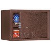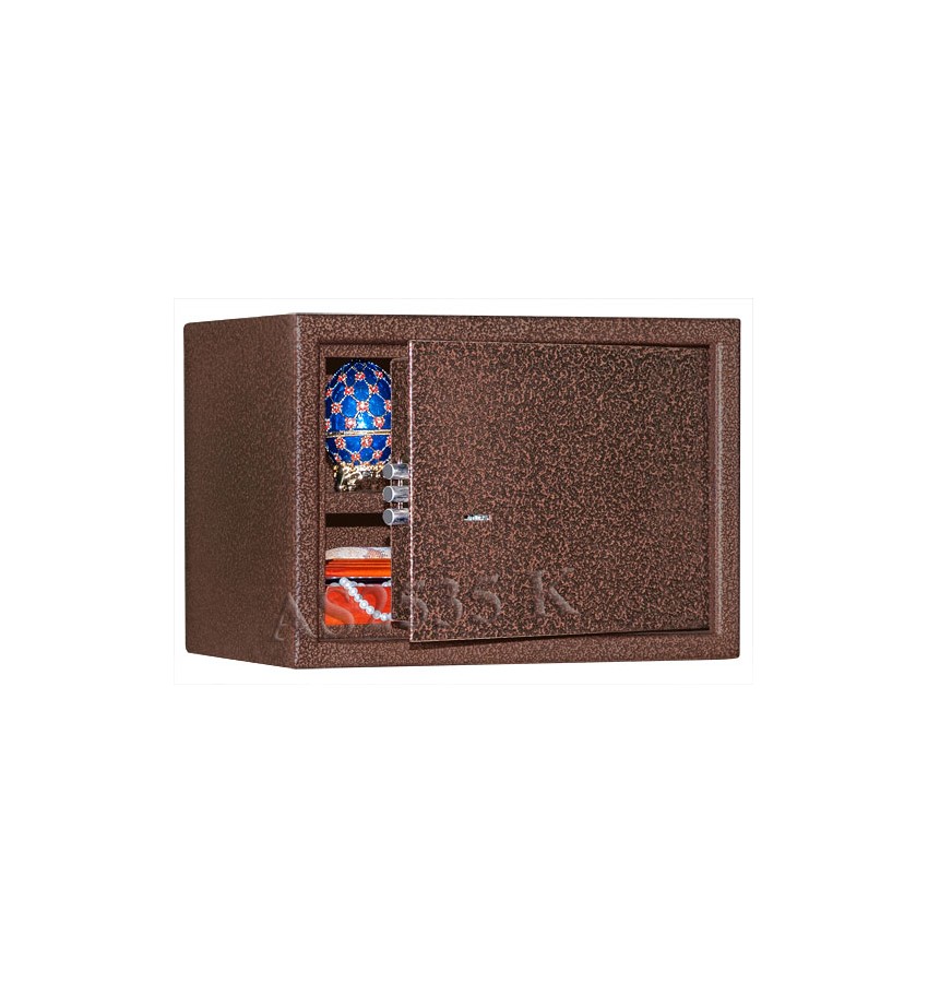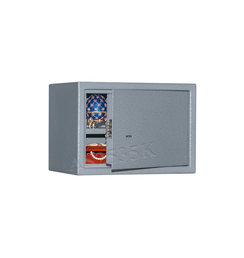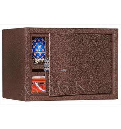 Имеются различные цвета. Используется в качестве мебельного, настольного, пистолетного сейфа и т.п. Удовлетворяет требованиям МВД. Сейф имеет гигиенически безопасное, износо- и коррозионно-устойчивое полимерно-порошковое покрытие. Замок Сейф оборудован сертифицированным ключевым трёхригельным сувальдным замком 2 класса. Защита Усиленный корпус. Дверь сейфа усиленная коробчатая. Передний лист двери - сталь 3 мм. Петли - внутренние. Внутреннее устройство Внутри сейфа съёмная полка. Дно сейфа отделано ковролином. Установка Предусмотрена возможность установки сейфа в мебель, крепления сейфа к стене, к полу, мебельной полке и т.п. Модификации Дополнительно может комплектоваться пистолетными ложементами (пластиковыми либо деревянными) а также колодками под патроны. Сейфы этой модели стандартно поставляются с различными вариантами полимерно-порошковых покрытий: эффект молотковой эмали серый (как на центральном фото), медный антик, светло-серый шагрень, а также черный дымчатый. Уточняйте при заказе в каких цветах имеются сейфы в наличии. Ассортимент сейфов по цвету может меняться