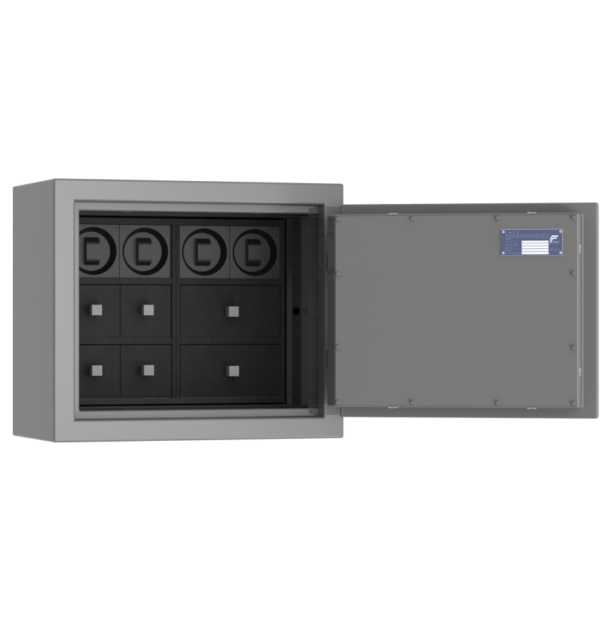 Взломостойкие, пожаростойкие сейфы Muller Safe серии U-SAFE — превосходное решение для хранения ценных вещей, ювелирных украшений и часов. Сейфы оборудованы электронным американским кодовым замком «LaGard». Внутренняя поверхность сейфа отделана высококачественной алькантарой. Имеется светодиодная подсветка снабженная рассеивателем света – дающим приятный мягкий свет. Яркость подсветки настраивается с пульта дистанционного управления. Сейфы могут быть укомплектованы ящиками двух размеров, предназначенными для удобного хранения ювелирных изделий и/или автоподзаводами для часов. Ячейки для подзаводов имеют размеры 100*100*100 мм, идеально подходят для размещения автоподзаводов швейцарской компании Swiss Kubik. Модели имеют штатные отверстия для крепления к стене