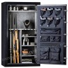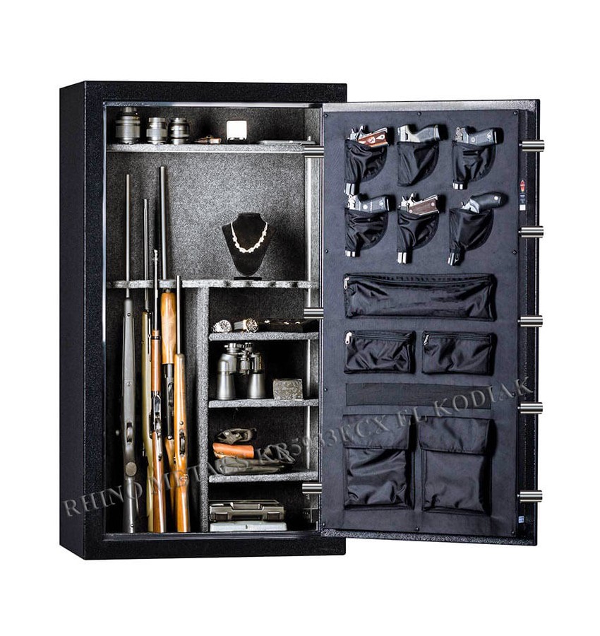 Производство Rhino Safe (США).Одобрен в штате Калифорния как сейф для хранения огнестрельного оружия (соответствует разделу 23655 кодекса и нормативным актам штата). Сейфы Rhino сертифицированы на взломостойкость и огнестойкость в США. Полностью удовлетворяют требованиям МВД РФ к хранению оружия. Замок Сейф оборудован высокосекретным электронным кодовым замком SecuRam (США). Замок сертифицирован Underwriters Laboratories Inc (UL®) США. Защита замка - закаленная стальная пластина для защиты от высверливания. Имеется система relocker для блокировки замка или/и запирающего механизма при несанкционированных воздействиях на замок. Защита Усиленный корпус. Дверь усиленная коробчатой конструкции. Дверь сейфа оборудована мощной запирающей системой. Специальная внутреняя муфта скольжения для защиты замка при приложении крутящего мышечного усилия при попытке взлома. Восемь ригелей (из них 5 активных) диаметром 25 мм. Увеличенный выход ригелей по сравнению с традиционными запирающими механизмами. Межстеночное пространство сейфа имеет многослойный огнестойкий наполнитель. Fire Rating 1400°F (огнестойкость при температуре в испытательной печи 760°C, заданный предел огнестойкости 177°C) – 0,7H. Для дополнительной защиты от проникновения при пожаре раскалённых газов и дыма внутрь сейфа – предусмотрен уплотнительный контур между дверью и корпусом сейфа. Эти уплотнительные прокладки выполнены из специального термостойкого материала и расширяются при пожаре (до 7 раз), обеспечивая дополнительную герметичность. Внутреннее устройство Внутри сейфа вертикальная перегородка, широкая полка, широкий двусторонний ложемент, вертикальная перегородка и три короткие полки. Все ложементы и полки - съёмные с регулируемой высотой установки, шаг перестановки 13мм. Внутренняя поверхность корпуса, а также внутренние элементы имеют мягкую отделку. Полная внутренняя мягкая отделка защищает Ваше оружие от контакта с металлом, царапин повреждений и т.п. Внутренняя поверхность двери сейфа имеет держатели для пистолетов, карманы, держатели для ножей и т.п., удобные закрывающиеся сумки. По данным производителя количество хранимых в сейфе ружей - 32. В сейфе ружья можно хранить как по одну сторону от перегородки, так и по обе стороны от перегородки. Установка Конструкцией сейфа предусмотрена возможность его крепления к полу. Дополнительная информация Дверь сейфа открывается полностью на 180°, что обеспечивает более удобный доступ к хранимым в сейфе предметам. Имеются несколько серий сейфов Rhino, отличающихся огнестойкостью и взломостойкостью. В порядке увеличения взломостойкости эти серии располагаются так: Kodiak® KB SERIES, Longhorn®, Kodiak® K SERIES, Kodiak® KSB SERIES, Ironworks® CIWD Premium, Ironworks® AIW Supreme.