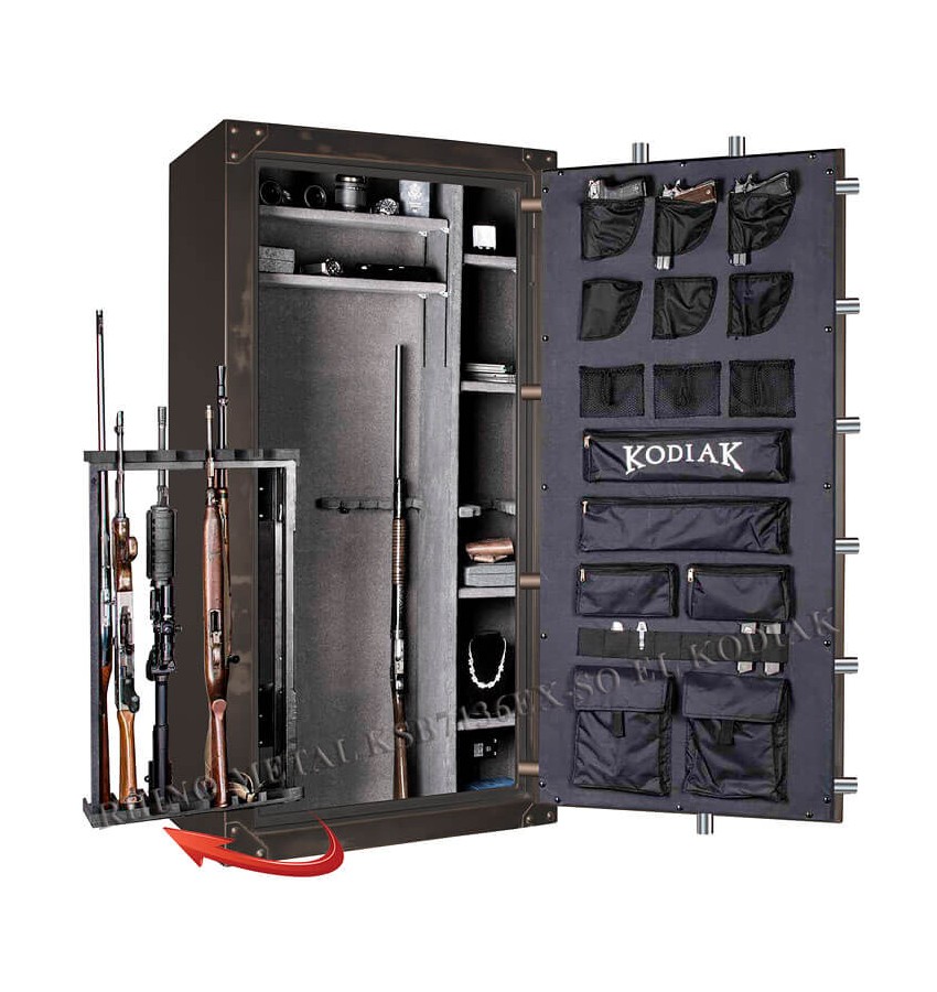 Внутренняя поверхность двери сейфа имеет держатели для пистолетов, карманы, держатели для ножей и т.п., удобные закрывающиеся сумки.