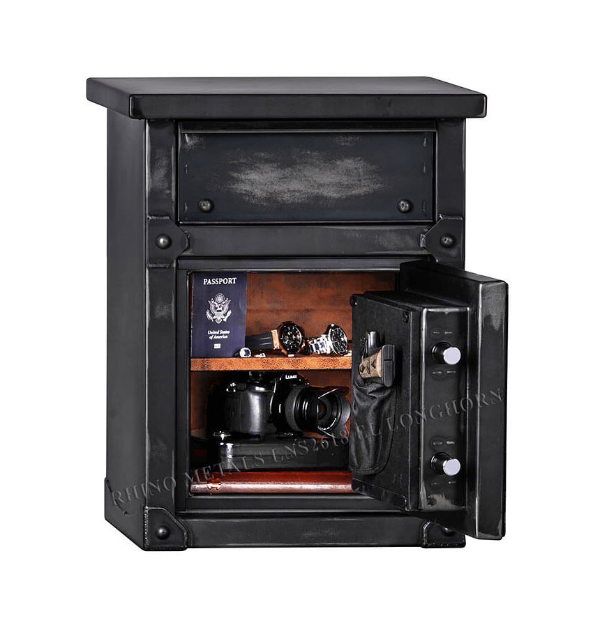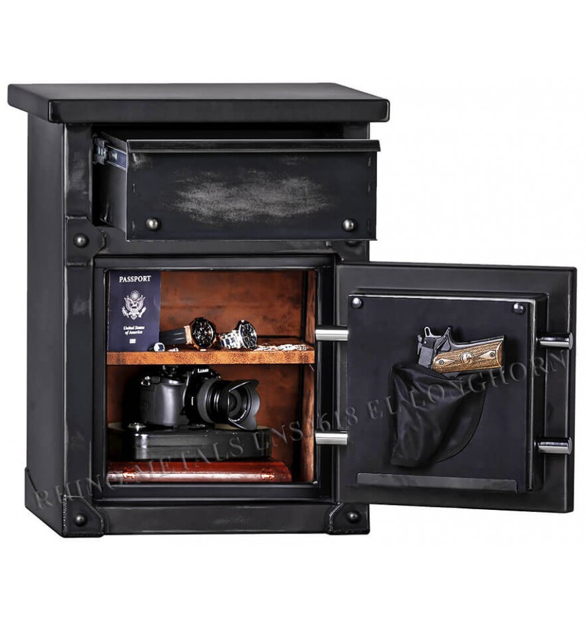 Современный американский сейф, изготовленный в старинном дизайне. Эти сейфы хорошо сочетаются как с современными интерьерами жилых помещений и офисов, а так же с такими интерьерами, как лофт, индастриал, винтаж, кантри и т.д. Производство Rhino Safe (США). Сейфы Rhino сертифицированы на взломостойкость и огнестойкость в США. Одобрен в штате Калифорния как сейф для хранения огнестрельного оружия (соответствует разделу 23655 кодекса и нормативным актам штата). Полностью удовлетворяют требованиям МВД РФ. Замок Сейф оборудован высокосекретным электронным кодовым замком SecuRam (США). Замок сертифицирован Underwriters Laboratories Inc (UL®) США. Защита замка специальной стальной пластиной. Защита Усиленный корпус. Дополнительное усиление угловых граней корпуса специальными приварными накладками. Дверь усиленная коробчатой конструкции. Дополнительное усиление двери стальной пластиной, для увеличения защиты от вскрытия рычагом. Крупные заклёпки на двери и на корпусе имеют не только декоративную, но и дополнительную защитную функцию. Дверь сейфа оборудована мощной двухсторонней ригельной запирающей системой с увеличенной защитой от сверления и ударных воздействий. Четыре ригеля (из них 2 активных) диаметром 25мм. Увеличенный выход ригелей по сравнению с традиционными запирающими механизмами. Сейфы имеют многослойный огнестойкий наполнитель. Fire Rating 1400°F (огнестойкость при температуре в испытательной печи 760°C, заданный предел огнестойкости 177°C) – 1H. Для дополнительной защиты от проникновения при пожаре раскалённых газов и дыма внутрь сейфа – предусмотрен уплотнительный контур между дверью и корпусом сейфа. Эти уплотнительные прокладки выполнены из специального термостойкого материала и расширяются при пожаре, обеспечивая дополнительную герметичность. Внутреннее устройство Верхняя часть сейфа имеет удобный выдвижной ящик. Внутри сейфа съёмная полка с регулируемой высотой установки. Шаг перестановки 13мм. Внутренняя поверхность двери сейфа имеет удобный держатель для пистолета. Внутренняя поверхность двери, полка и вся внутренняя поверхность сейфа имеет мягкую отделку. Полная внутренняя мягкая отделка защищает хранимые в сейфе предметы от контакта с металлом, царапин повреждений и т.п. Для внутренней отделки используется современная экозамша с эффектом потёртой буйволиной кожи. Установка Конструкцией сейфа предусмотрена возможность его крепления к полу. Дополнительная информация Дизайн этих современных американских сейфов выполнен в стиле сейфов второй половины 19 века. Потёртости покрытия и внутренней отделки не являются дефектом или браком, а являются элементами дизайна сейфов Rhino Longhorn®. Дизайн этих сейфов запатентован в США. Дверь сейфа открывается полностью на 180°, что обеспечивает более удобный доступ к хранимым в сейфе предметам. Имеются несколько серий сейфов Rhino, отличающихся огнестойкостью и взломостойкостью. В порядке увеличения взломостойкости эти серии располагаются так: Kodiak® KB SERIES, Longhorn®, Kodiak® K SERIES, Kodiak® KSB SERIES, Ironworks® CIWD Premium, Ironworks® AIW Supreme.