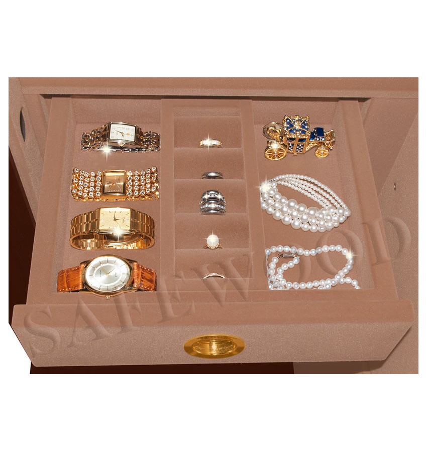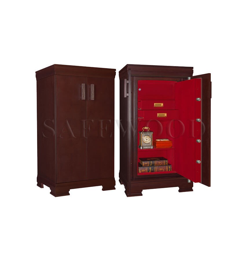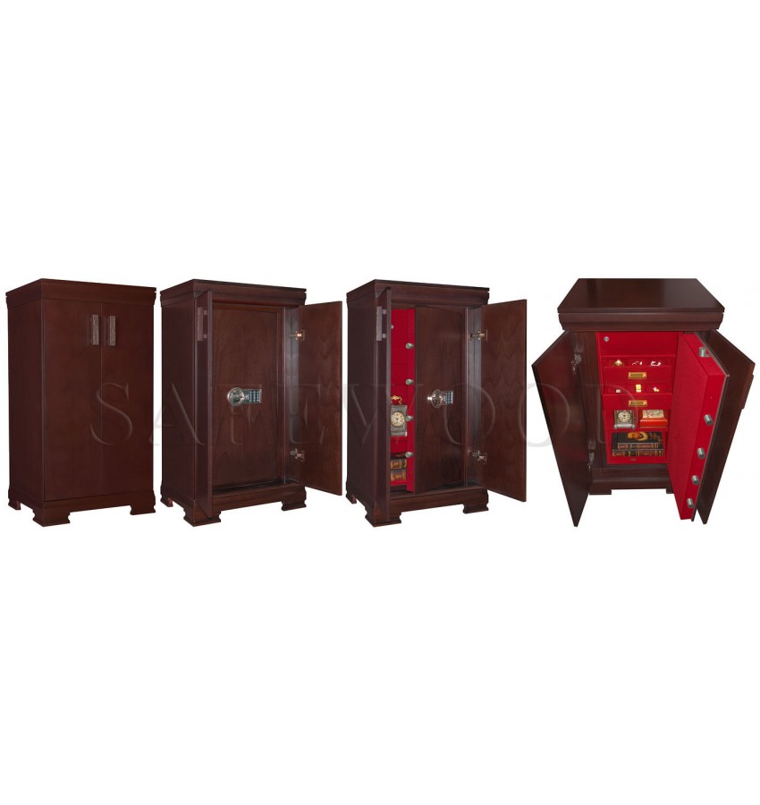 ОписаниеСкрытое исполнение. Имеет две дополнительные наружные мебельные двери, за которыми скрыт непосредственно сам сейф. Снаружи изделие выглядит как деревянный мебельный шкаф. Элитный взломоогнестойкий сейф с отделкой натуральным деревом. Вся внутренняя поверхность сейфа имеет престижное мягкое покрытие флокированием бархатом. Сейф сертифицирован на устойчивость к взлому – 1 класс. Умеренная огнестойкость – приблизительно 20Б. Корпус имеет двойные стальные стенки, межстеночный наполнитель – бетон. Металлические детали сейфа имеют гигиенически-безопасное, коррозионно-стойкое полимерно-порошковое покрытие на основе материалов производства ЕС. В отличие от других сейфов с отделкой деревом, сейфы Safewood являются Взломоогнестойкими сейфами. Так же может использоваться как ювелирный сейф для хранения ювелирных изделий, украшений, ценностей и т.д. Замок Сейф оборудован электронным кодовым замком PS-300 либо высокосекретным электронным кодовым замком Mauer (Германия). Уточняйте при покупке. Такие замки Вы можете по Вашему выбору эксплуатировать в режиме одного пользовательского кода, либо в режиме двух кодов (мастер-код и рабочий код). Вы можете выбрать кодовую панель электронного замка – Хром либо Gold. Варианты кодовых панелей представлены на дополнительном фото. Стоимость сейфа и гарантия зависит от типа замка и кодовой панели. Цена приведена для случая поставки сейфа с замком PS-300 с кодовой панелью Хром. Кодовые панели Gold имеют покрытие золотом 24 карата. На кодовую панель Mauer Gold имеется европейский сертификат. При поставке сейфа с электронным кодовым замком замком PS-300 ( с любой кодовой панелью) - гарантия на сейф – 5 лет, гарантия на замок составляет 2 года. При поставке сейфа с электронным кодовым замком Mauer (Германия) ( с любой кодовой панелью) гарантия – 5 лет, как на замок, так и на сейф. Защита Сейф имеет усиленную коробчатую дверь, передний лист двери – сталь 10мм. Петли – внутренние. Имеется защита замка от высверливания твёрдосплавной пластиной. Мощная запирающая система с запиранием по всем сторонам. Вращающиеся ригели диаметром 25мм. Внутреннее устройство Внутри сейфа запираемое кассовое отделение, два выдвижных лотка и съёмная полка с регулируемой высотой установки. Выдвижные лотки могут быть изготовлены с различными видами вставок (для хранения часов, ювелирных изделий и др.) либо без них. По желанию заказчика возможно изменение количества лотков и полок. Установка Предусмотрена возможность крепления сейфа к полу. Модификации По желанию заказчика возможно различное сочетание количества выдвижных лотков и съёмных полок либо полное заполнение внутреннего пространства сейфа лотками. Имеются различные варианты цвета деревянной отделки, а также возможность изготовления по образцу Вашей мебели. New! Для всех моделей сейфов SAFEWOOD теперь возможен новый дополнительный вариант наружной отделки: окрашенное дерево с патинированием. Возможны различные цвета окраски и патинирования. Некоторые примеры – на дополнительном фото. Возможно так же изготовление по образцу Вашей мебели. Имеются различные цвета внутренней отделки, некоторые примеры на дополнительном фото. Возможна поставка любых сейфов Safewood в исполнении NP. Такие сейфы имеют меньшие наружные габариты при сохранении тех же внутренних габаритов. Возможно измене