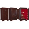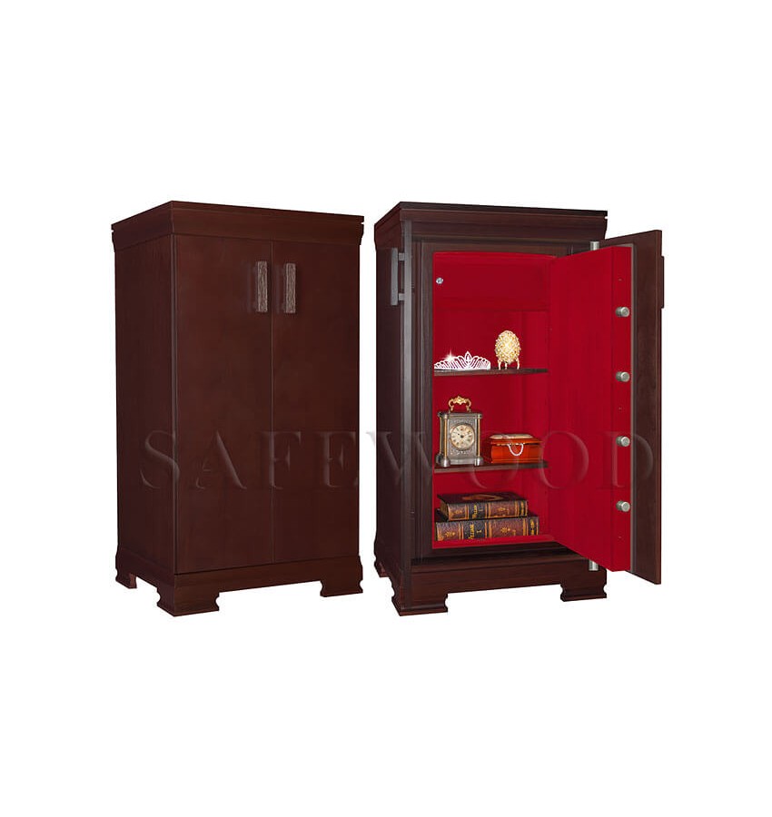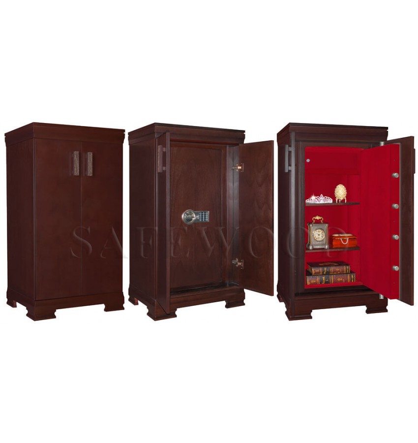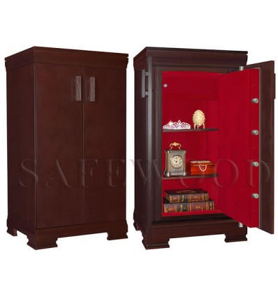 ОписаниеСкрытое исполнение. Имеет две дополнительные наружные мебельные двери, за которыми скрыт непосредственно сам сейф. Снаружи изделие выглядит как деревянный мебельный шкаф. Элитный взломоогнестойкий сейф с отделкой натуральным деревом. Вся внутренняя поверхность сейфа имеет престижное мягкое покрытие флокированием бархатом. Сейф сертифицирован на устойчивость к взлому – 1 класс. Умеренная огнестойкость – приблизительно 20Б. Корпус имеет двойные стальные стенки, межстеночный наполнитель – бетон. Металлические детали сейфа имеют гигиенически-безопасное, коррозионно-стойкое полимерно-порошковое покрытие на основе материалов производства ЕС. В отличие от других сейфов с отделкой деревом, сейфы Safewood являются Взломоогнестойкими сейфами. Может использоваться как ювелирный сейф. Для хранения ювелирных изделий, украшений и ценностей сейф дополнительно комплектуется выдвижными или съёмными флокированными лотками. Замок Сейф оборудован электронным кодовым замком PS-300 либо высокосекретным электронным кодовым замком Mauer (Германия). Уточняйте при покупке. Такие замки Вы можете по Вашему выбору эксплуатировать в режиме одного пользовательского кода, либо в режиме двух кодов (мастер-код и рабочий код). Вы можете выбрать кодовую панель электронного замка – Хром либо Gold. Варианты кодовых панелей представлены на дополнительном фото. Стоимость сейфа и гарантия зависит от типа замка и кодовой панели. Цена приведена для случая поставки сейфа с замком PS-300 с кодовой панелью Хром. Кодовые панели Gold имеют покрытие золотом 24 карата. На кодовую панель Mauer Gold имеется европейский сертификат. При поставке сейфа с электронным кодовым замком замком PS-300 ( с любой кодовой панелью) - гарантия на сейф – 5 лет, гарантия на замок составляет 2 года. При поставке сейфа с электронным кодовым замком Mauer (Германия) ( с любой кодовой панелью) гарантия – 5 лет, как на замок, так и на сейф. Защита Сейф имеет усиленную коробчатую дверь, передний лист двери – сталь 10мм. Петли – внутренние. Имеется защита замка от высверливания твёрдосплавной пластиной. Мощная запирающая система с запиранием по всем сторонам. Вращающиеся ригели диаметром 25мм. Внутреннее устройство Внутри сейфа запираемое кассовое отделение и две съёмные полки с регулируемой высотой установки. Дополнительная опция для сейфов SAFEWOOD - выдвижные лотки. Возможно сочетание лотков и полок либо полное заполнение лотками. Выдвижные лотки могут быть изготовлены с различными видами вставок (для хранения часов, ювелирных изделий и др.) либо без них. По желанию заказчика возможно изменение количества лотков и полок. Установка Предусмотрена возможность крепления сейфа к полу. Модификации По желанию заказчика возможно различное сочетание количества выдвижных лотков и съёмных полок либо полное заполнение внутреннего пространства сейфа лотками. Имеются различные варианты цвета деревянной отделки, а также возможность изготовления по образцу Вашей мебели. New! Для всех моделей сейфов SAFEWOOD теперь возможен новый дополнительный вариант наружной отделки: окрашенное дерево с патинированием. Возможны различные цвета окраски и патинирования. Некоторые примеры – на дополнительном фото. Возможно так же изготовление по образцу Вашей мебели. Имеются различные цвета внутренней отделки, некоторые примеры на