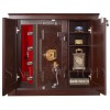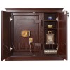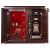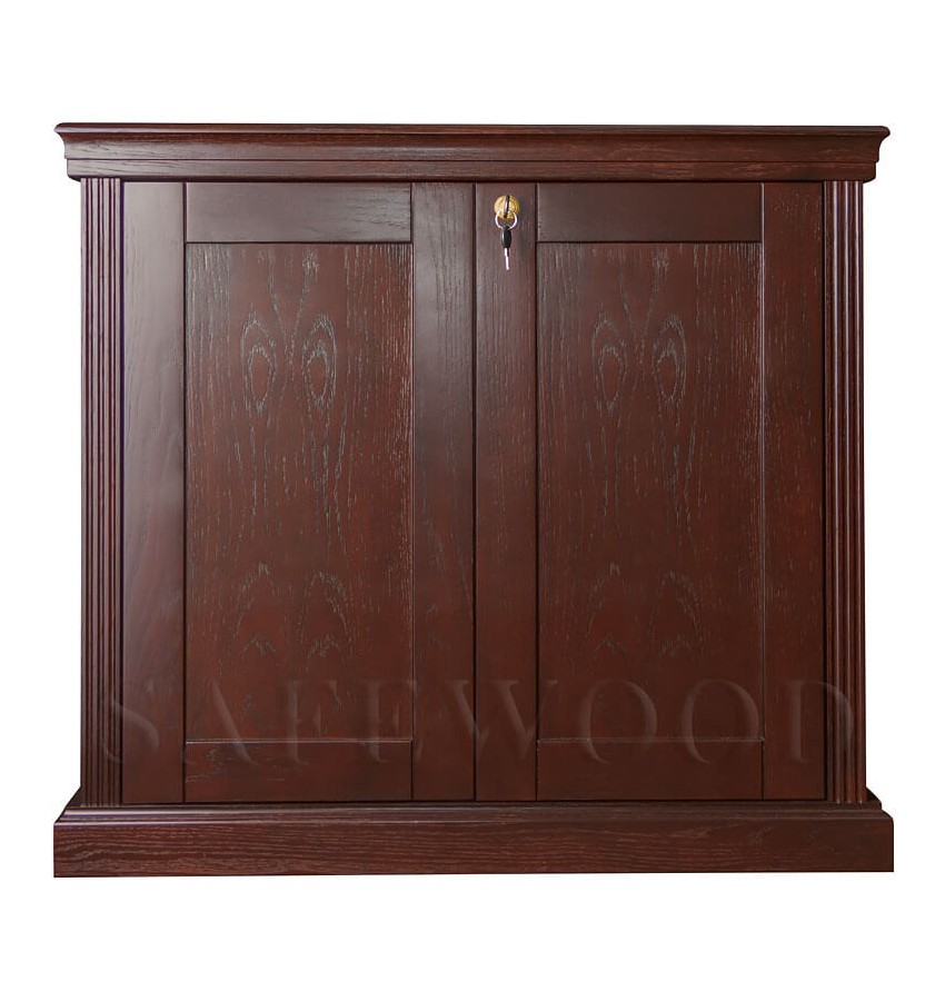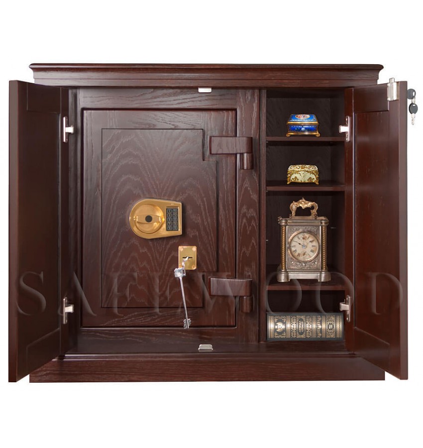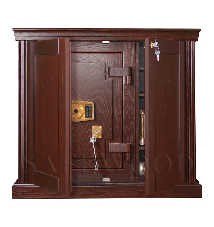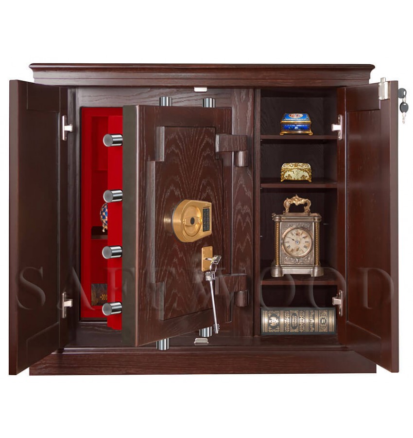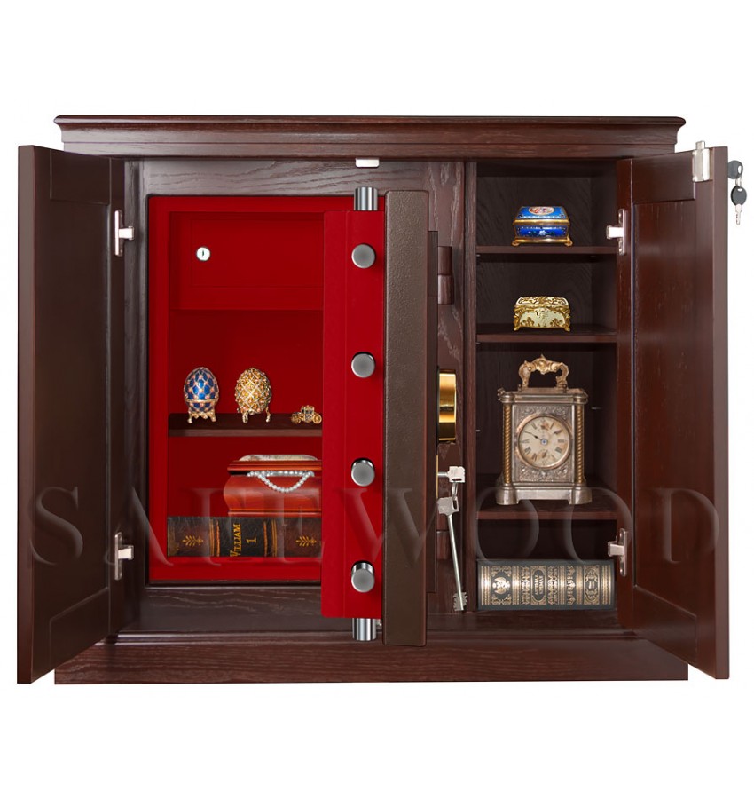 ОписаниеСкрытое исполнение. Имеет две дополнительные наружные мебельные двери, за которыми скрыт непосредственно сам сейф. Снаружи изделие выглядит как деревянный мебельный шкаф. Элитный взломоогнестойкий сейф с отделкой натуральным деревом. Вся внутренняя поверхность сейфа имеет престижное мягкое покрытие флокированием бархатом. Сейф сертифицирован на устойчивость к взлому – 5 класс. Так же сейф сертифицирован на огнестойкость – класс 60Б. Корпус имеет двойные стальные стенки, межстеночный наполнитель – специальный взломоогнестойкий бетон. Металлические детали сейфа имеют гигиенически-безопасное, коррозионно-стойкое полимерно-порошковое покрытие на основе материалов производства ЕС. В отличие от других сейфов с отделкой деревом, сейфы Safewood являются Взломоогнестойкими сейфами. Может использоваться как ювелирный сейф. Для хранения ювелирных изделий, украшений и ценностей сейф дополнительно комплектуется выдвижными или съёмными флокированными лотками. Замок Сейф оборудован двумя высокосекретными замками: электронным кодовым замком La Gard (США) и ключевым MAUER Германия). Электронный замок Вы можете по Вашему выбору эксплуатировать в режиме одного пользовательского кода, либо в режиме двух кодов (мастер-код и рабочий код). Подробная и понятная инструкция на русском языке прилагается. Вы можете выбрать кодовую панель электронного замка – Хром либо Gold. Варианты кодовых панелей представлены на дополнительном фото. Питание электронного замка от стандартной батарейки. Долгий срок службы батарейки. Простая смена разряженной батарейки. Наружные мебельные двери запираются собственным ключевым мебельным замком. Защита Корпус и дверь сейфа имеют двойные стальные стенки, между которыми находится специальный взломоогнестойкий армированный бетон с дополнительными специальными слоями. Сейф имеет усиленную дверь. Мощная вертикальная и горизонтальная запирающая ригельная система с запиранием по всем сторонам. Всего 11 мощных ригелей, из них восемь активных вращающихся хромированных ригелей. Сейф имеет защиту для препятствия высверливанию и выбиванию ригелей и замков. Имеется система блокировки ригельного запирающего механизма при механическом воздействии на дверь или замки. Возможна поставка сейфа с счётчиком открываний. Конструкцией сейфа предусмотрена возможность подключения сигнализации. Внутреннее устройство За наружными мебельными дверями находится непосредственно сам сейф и три дополнительные съёмные мебельные полки, регулируемые по высоте. Внутри сейфа запираемое кассовое отделение и съёмная деревянная полка с регулируемой высотой установки. Внутренняя отделка Сейфы SAFEWOOD модификации FLOCK имеют престижную полную внутреннюю мягкую отделку флокированием бархатом (различных цветов по нашему каталогу), например на фото – флок бордо. Полная внутренняя мягкая отделка защищает хранимые в сейфе предметы от контакта с металлом, царапин повреждений и т.п. Некоторые варианты флока представлены на дополнительном фото. Установка Предусмотрена возможность крепления сейфа к полу. Модификации Имеются различные варианты цвета деревянной отделки, а также возможность изготовления по образцу Вашей мебели. New! Для всех моделей сейфов SAFEWOOD теперь возможен новый дополнительный вариант наружной отделки: окрашенное 