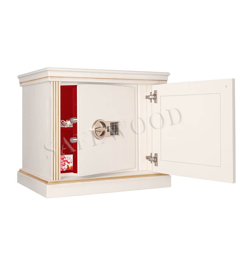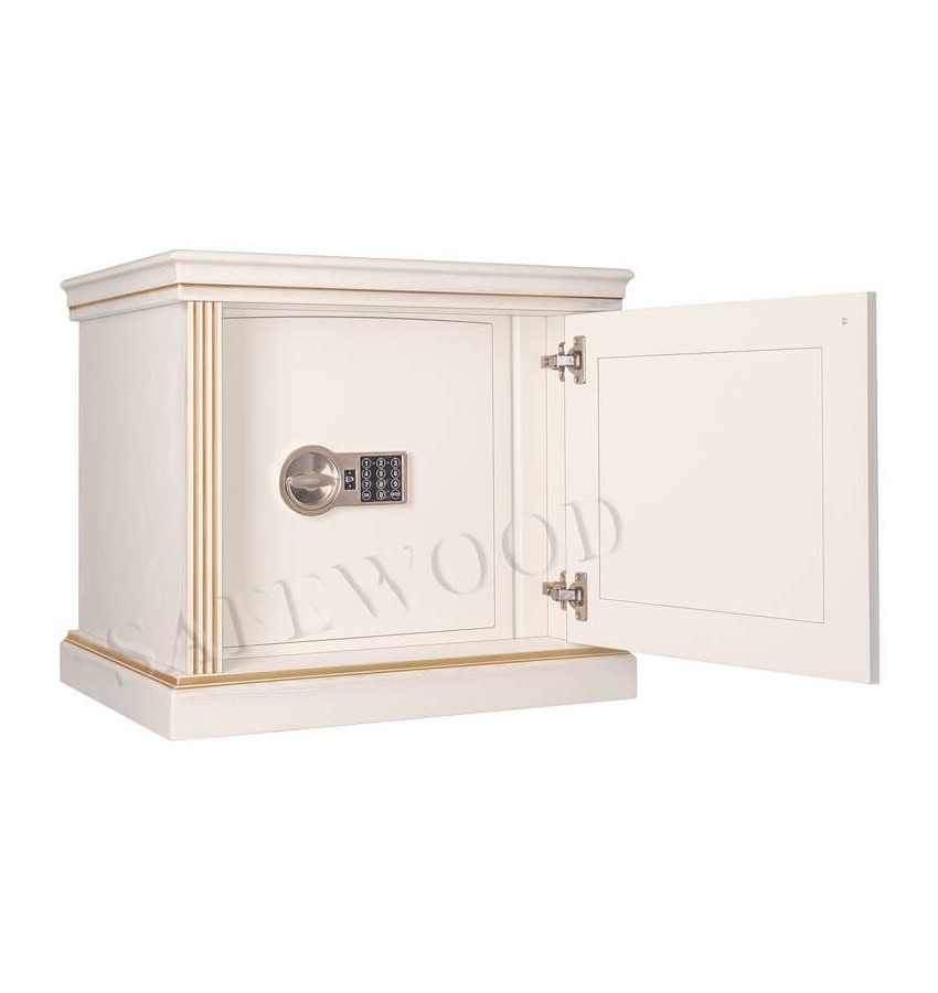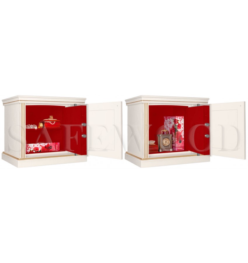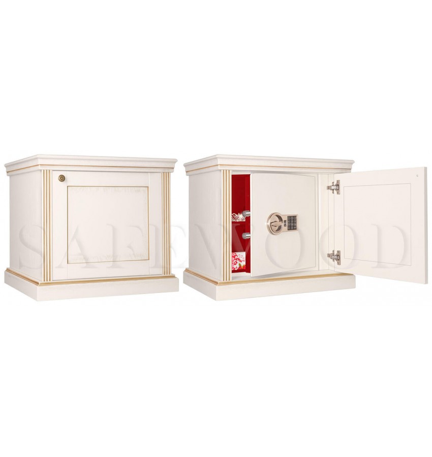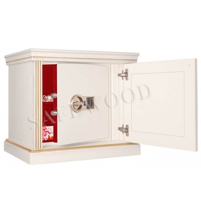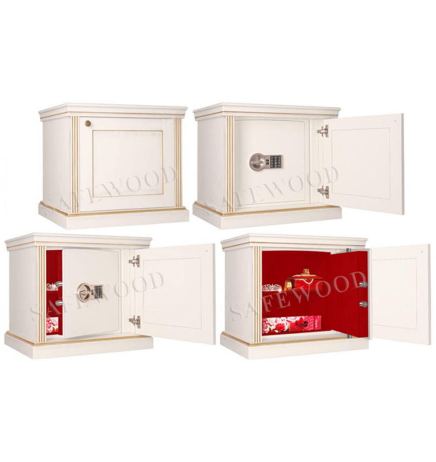 ОписаниеСкрытое исполнение. Сейф выполнен в виде мебельной тумбы. Имеет дополнительную наружную мебельную дверь, за которой скрыт непосредственно сам сейф. Элитный взломоогнестойкий сейф с отделкой натуральным деревом. Наружная отделка - натуральное окрашенное дерево (по каталогу RAL) с патинированием. Возможны различные цвета окраски и патинирования. Вся внутренняя поверхность сейфа имеет престижное мягкое покрытие флокированием бархатом. Сейф сертифицирован на устойчивость к взлому – 1 класс. Умеренная огнестойкость – приблизительно 20Б. Корпус имеет двойные стальные стенки, межстеночный наполнитель – бетон. Металлические детали сейфа имеют гигиенически-безопасное, коррозионно-стойкое полимерно-порошковое покрытие на основе материалов производства ЕС. В отличие от других сейфов с отделкой деревом, сейфы Safewood являются Взломоогнестойкими сейфами. Может использоваться как ювелирный сейф. Для хранения ювелирных изделий, украшений и ценностей сейф дополнительно комплектуется выдвижными или съёмными флокированными лотками. Замок Сейф оборудован электронным кодовым замком PS-300 либо высокосекретным электронным кодовым замком Mauer (Германия). Уточняйте при покупке. Такие замки Вы можете по Вашему выбору эксплуатировать в режиме одного пользовательского кода, либо в режиме двух кодов (мастер-код и рабочий код). Вы можете выбрать кодовую панель электронного замка – Хром либо Gold. Варианты кодовых панелей представлены на дополнительном фото. Стоимость сейфа и гарантия зависит от типа замка и кодовой панели. Цена приведена для случая поставки сейфа с замком PS-300 с кодовой панелью Хром. При поставке с замком PS-300 с кодовой панелью Gold доплата 17157 рублей. При поставке с замком Mauer (Германия) с кодовой панелью Хром доплата 11473 рублей. При поставке с замком Mauer (Германия) с кодовой панелью Gold доплата 23472 рублей. Кодовые панели Gold имеют покрытие золотом 24 карата. На кодовую панель Mauer Gold имеется европейский сертификат. При поставке сейфа с электронным кодовым замком замком PS-300 ( с любой кодовой панелью) - гарантия на сейф – 5 лет, гарантия на замок составляет 2 года. При поставке сейфа с электронным кодовым замком Mauer (Германия) ( с любой кодовой панелью) гарантия – 5 лет, как на замок, так и на сейф. Защита Сейф имеет усиленную коробчатую дверь, передний лист двери – сталь 10мм. Петли – внутренние. Имеется защита замка от высверливания твёрдосплавной пластиной. Мощная запирающая система с запиранием по всем сторонам. Вращающиеся ригели диаметром 25мм. Внутреннее устройство Внутри сейфа съёмная полка. Установка Предусмотрена возможность крепления сейфа к полу. Модификации Имеются различные варианты цвета деревянной отделки, а также возможность изготовления по образцу Вашей мебели. Возможны различные цвета окраски и патинирования. Некоторые примеры – на дополнительном фото. Возможно так же изготовление по образцу Вашей мебели. Любые сейфы Safewood могут поставляться как с традиционной деревянной отделкой, так и в исполнении окрашенное дерево с патинированием либо окрашенное дерево без патинирования. Имеются различные цвета внутренней отделки ( например на основном фото – флок бордо). Любой сейф Safewood или Armwood – по желанию заказчика может быть изготовлен в скрытом исполнении. Дополнительная информация Наружная дверь, по желанию заказчика, 