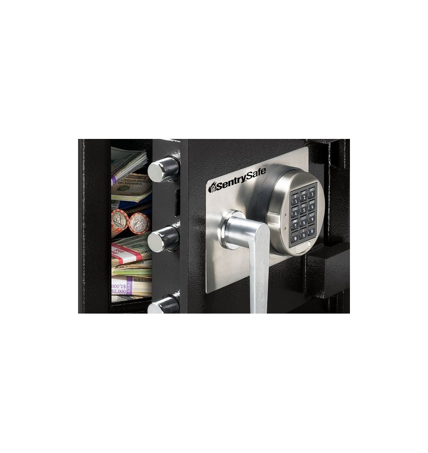 МодельSentrySafe DH-074 оснащена надежным программируемым кодовым замком, может крепиться к полу, корпус сейфа выполнен из прочной стали. Благодаря особенностям конструкции, гарантируется защита от "рыбалки". Объем сейфа составляет 26,6 литров.